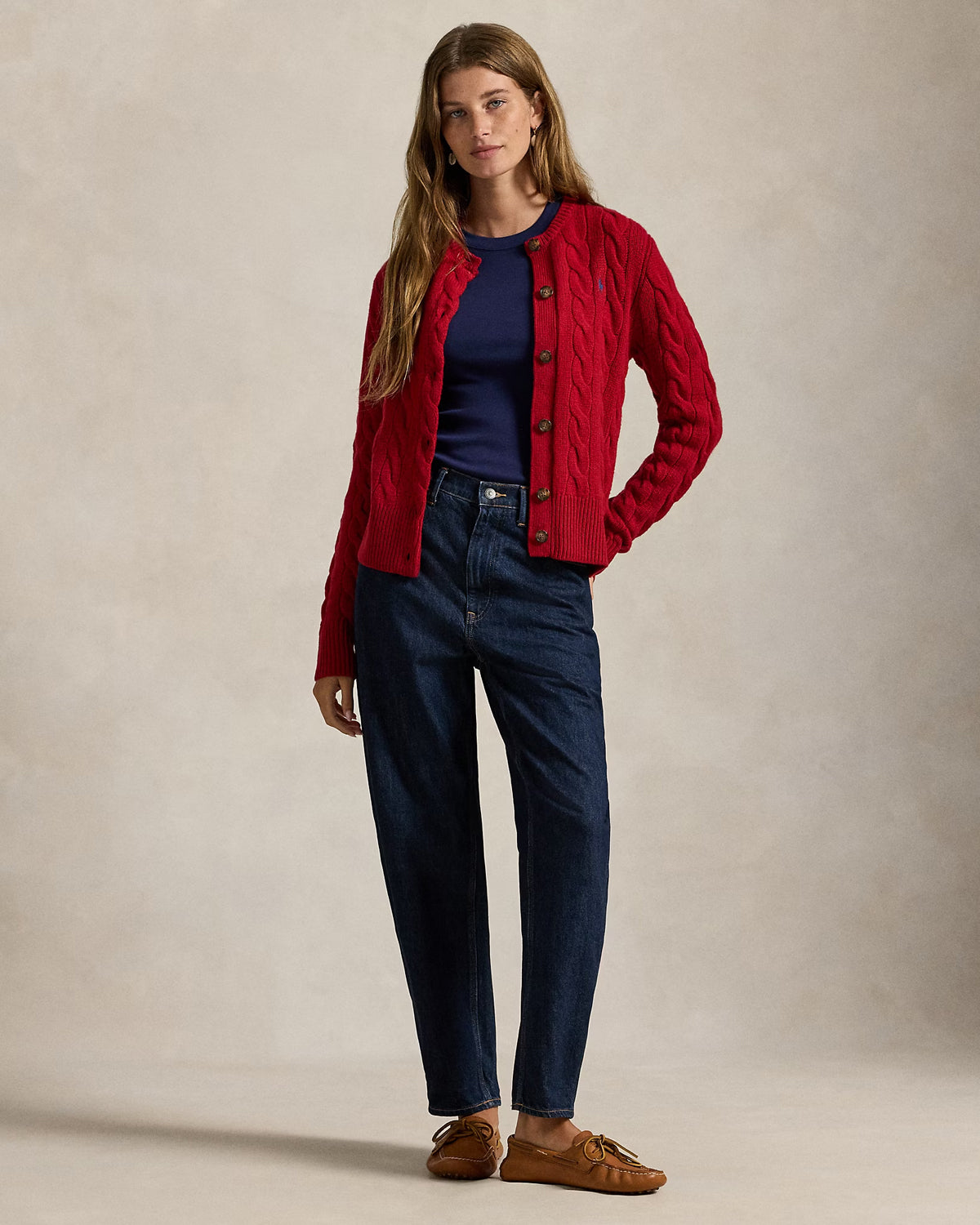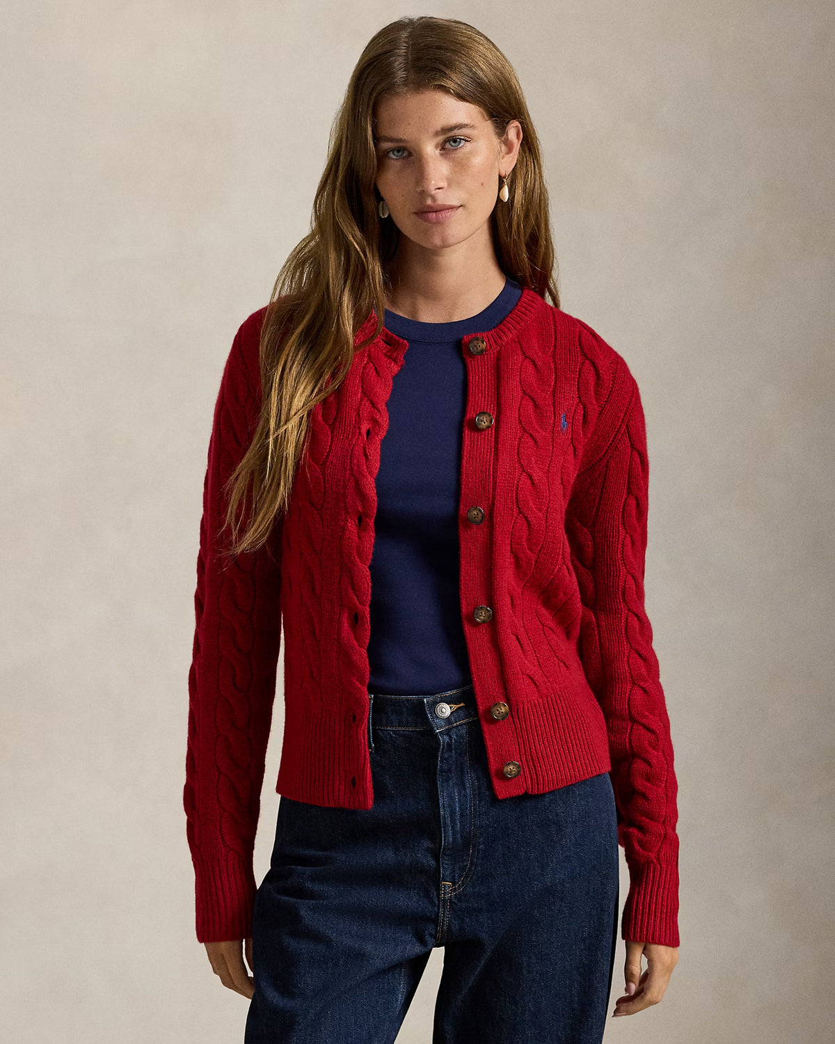 Denne cardiganen med rund hals er kabelstrikket i en myk blanding av italiensk ull og kardet kasjmir, og har vår signaturbroderte ponni på brystet.