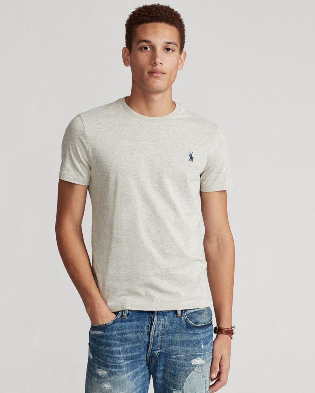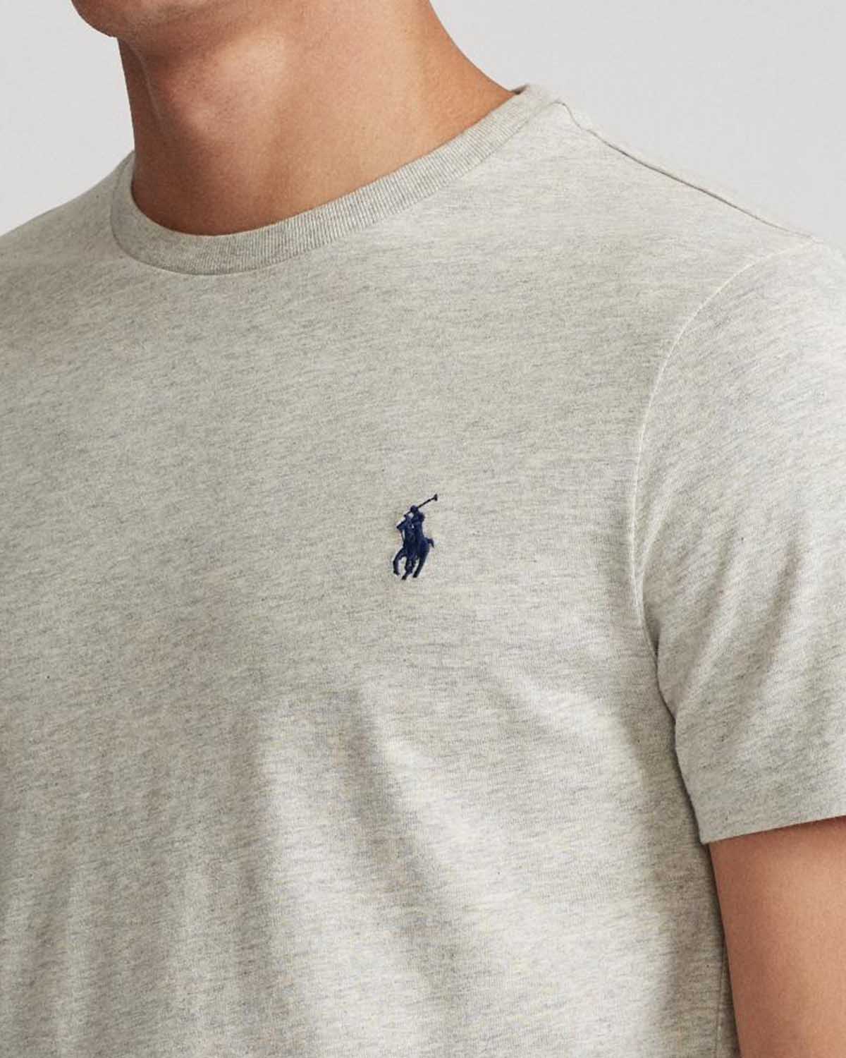 Grå t-skjorte fra Polo Ralph Lauren. Custom Fit Cotton T-Shirt har rund hals, kort erm og den velkjente polospilleren brodert i blått på brystet.
