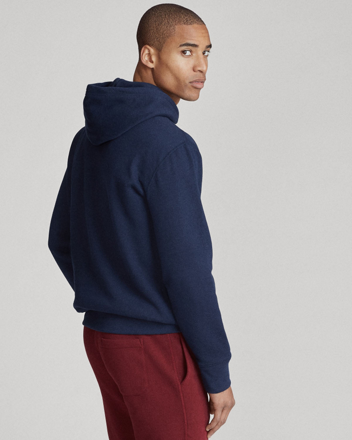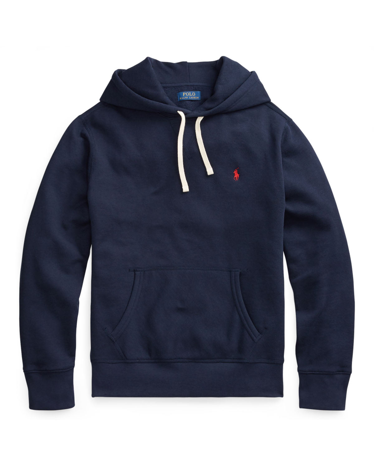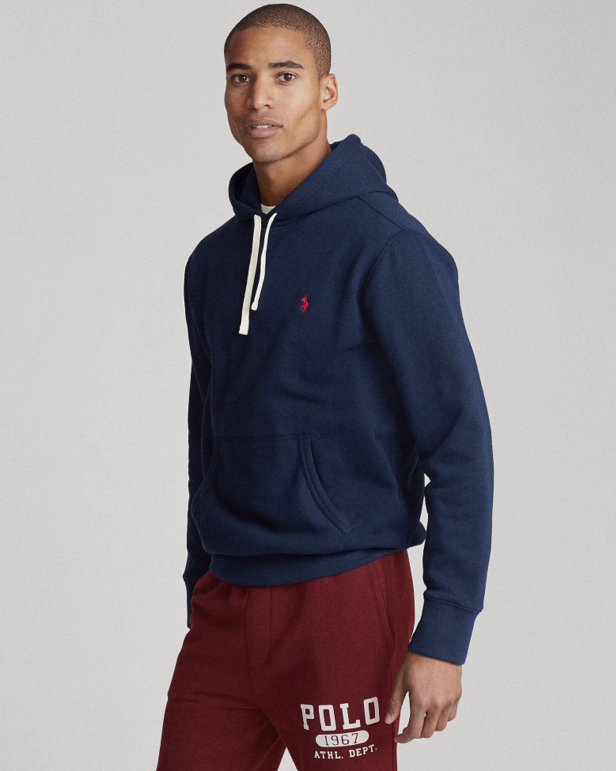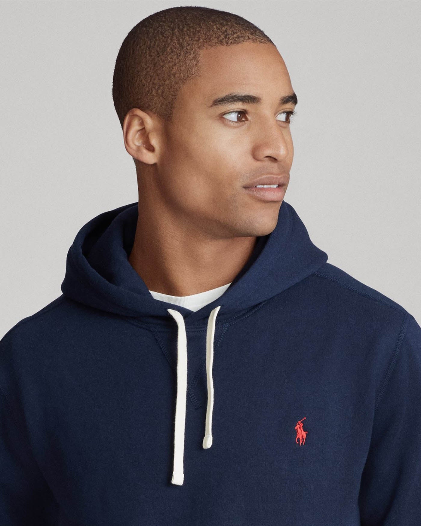 Hettegenser fra Polo Ralph Lauren i mørkeblå college-kvalitet med ribbestrikkede kanter, munkelomme foran, hvit snøre i hette samt rød logodetalj på bryst.
