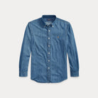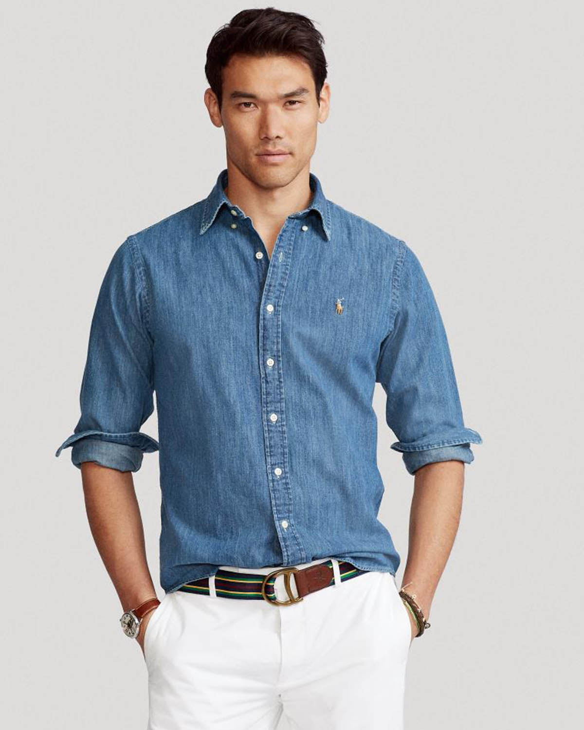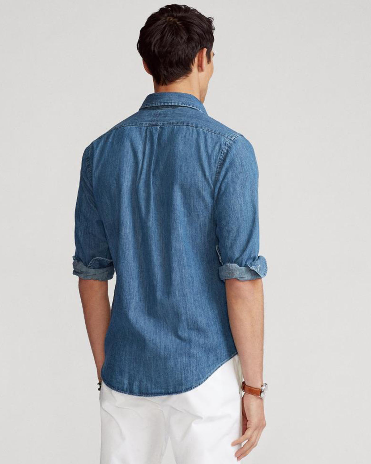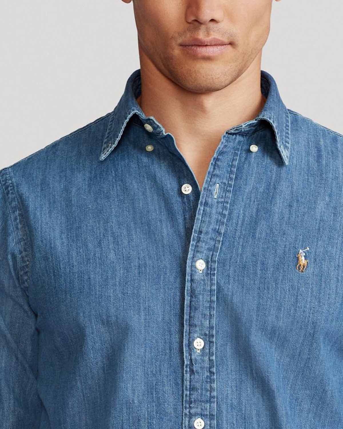 Blå denimskjorte fra Polo Ralph Lauren. Custom Fit Denim Shirt har klassisk button-down-krage, knappelukking foran, lang erm og fullføres av den ikoniske logoen brodert på bryst. Like kul lukket som åpen over en enkel t-skjorte!