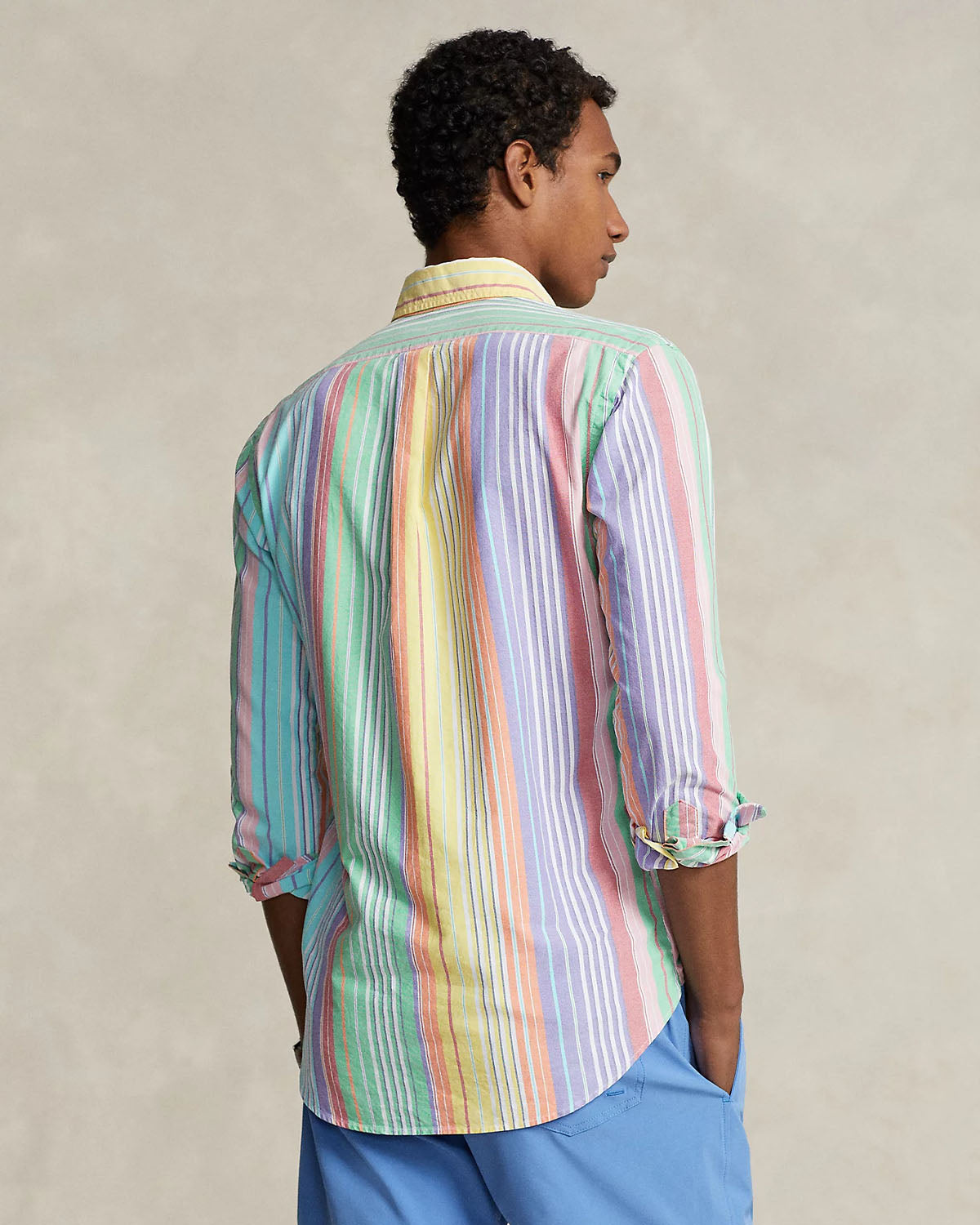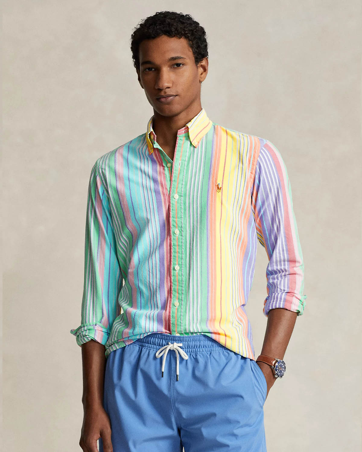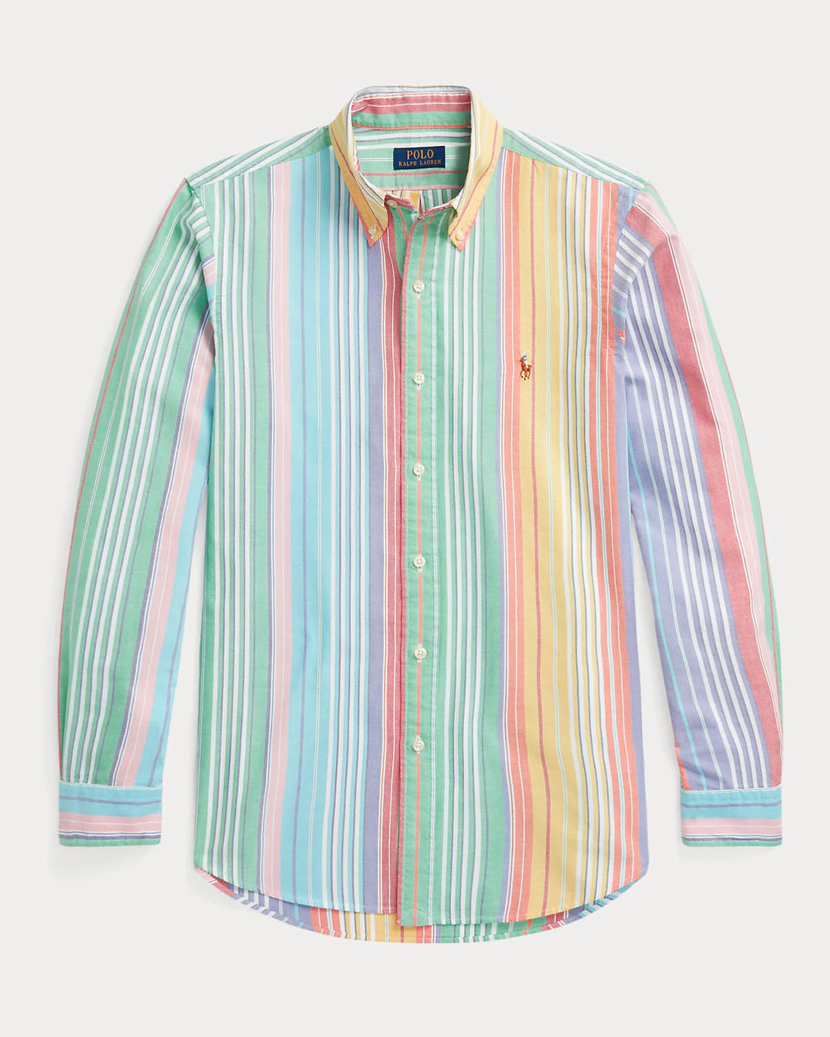 Oxford-skjorten debuterte i begynnelsen av Ralph Lauren-merket, og siden den gang har den befestet sin status som en bærebjelke i Polo-looken. I dag fortsetter Mr. Lauren å designe utallige varianter av sin ikoniske skjorte, inkludert denne stripete versjonen som er fullført med deres flerfargede signaturponni.