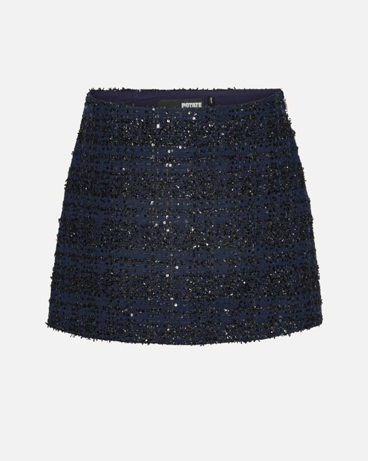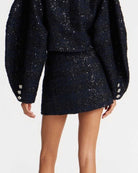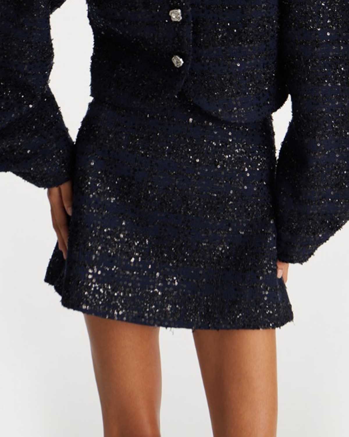Boucle Mini Skirt i Dark Blue er et tettsittende miniskjørt med paljettdekorasjon over hele linjen på teksturert boucléstoff. Skjørtet er helfôret og lukkes med en skjult glidelås bak. Matcher Boucle Short Jacket i Dark Blue.