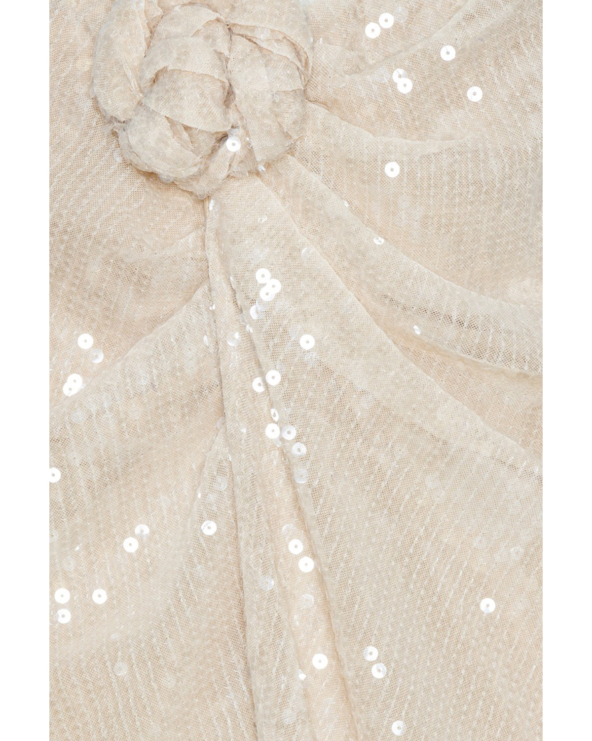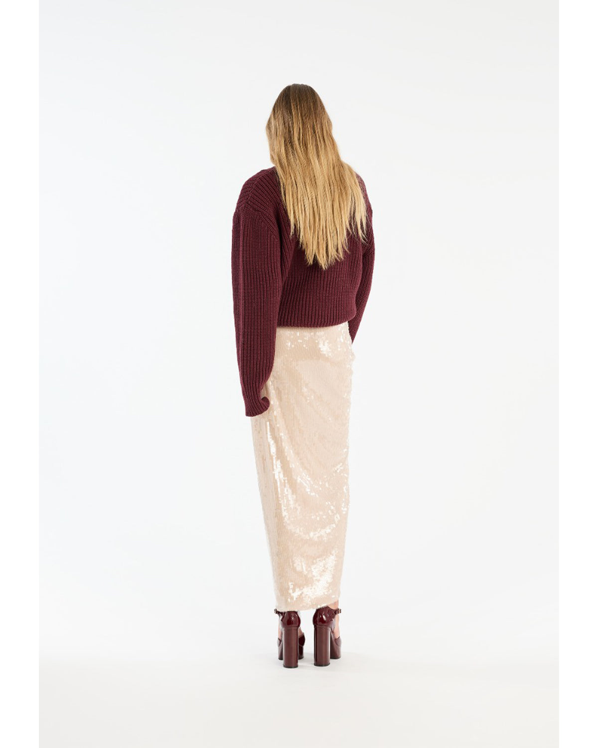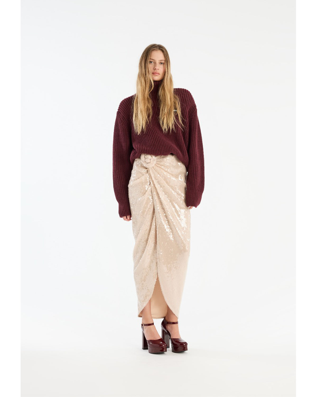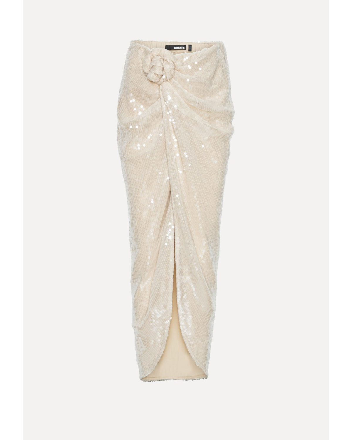 Sequins Knot Skirt Creme er et tettsittende midiskjørt utsmykket med paljetter. Det har en omslagseffekt foran med draperte detaljer og en dekorativ blomst i midjen. Skjørtet er fôret.
