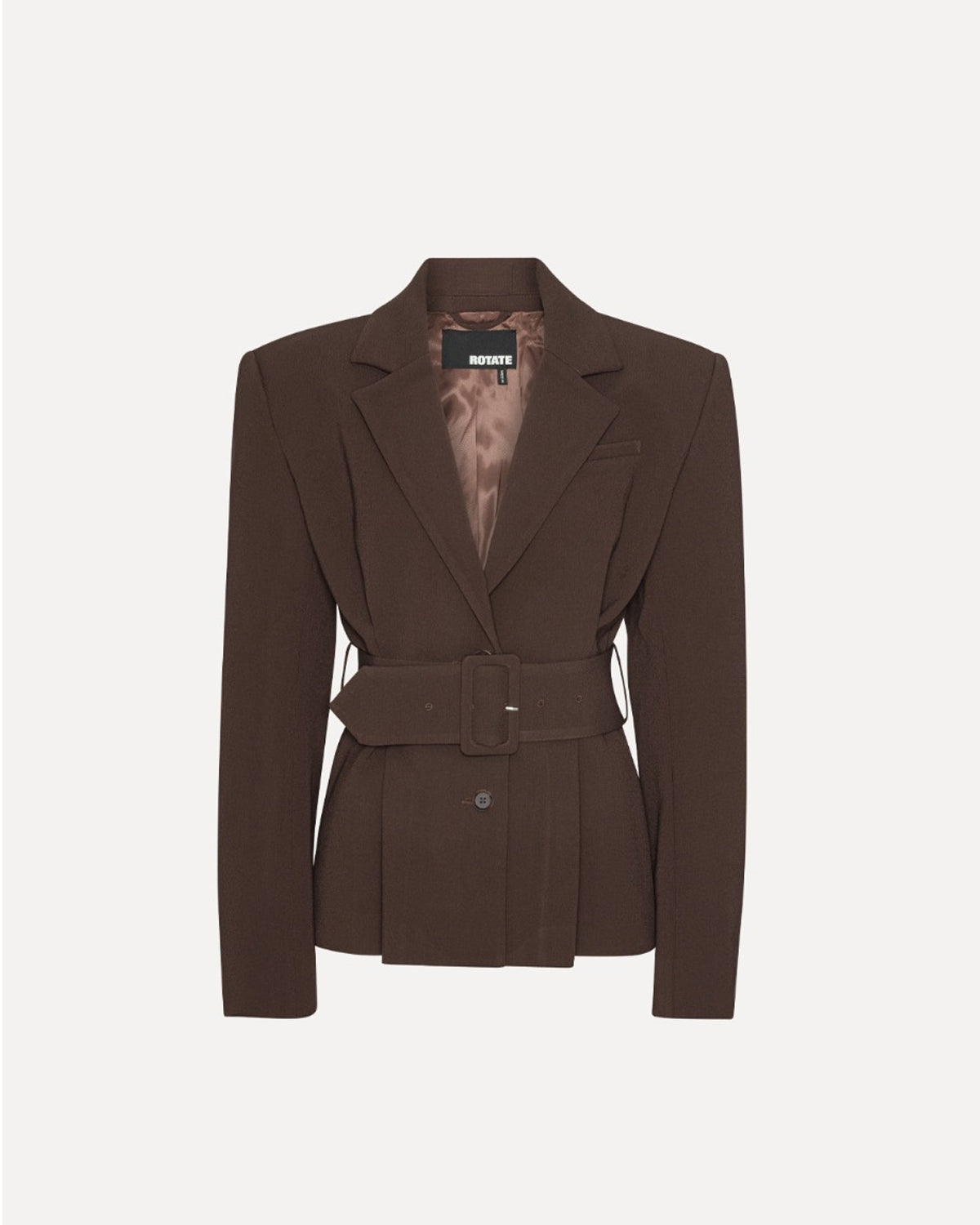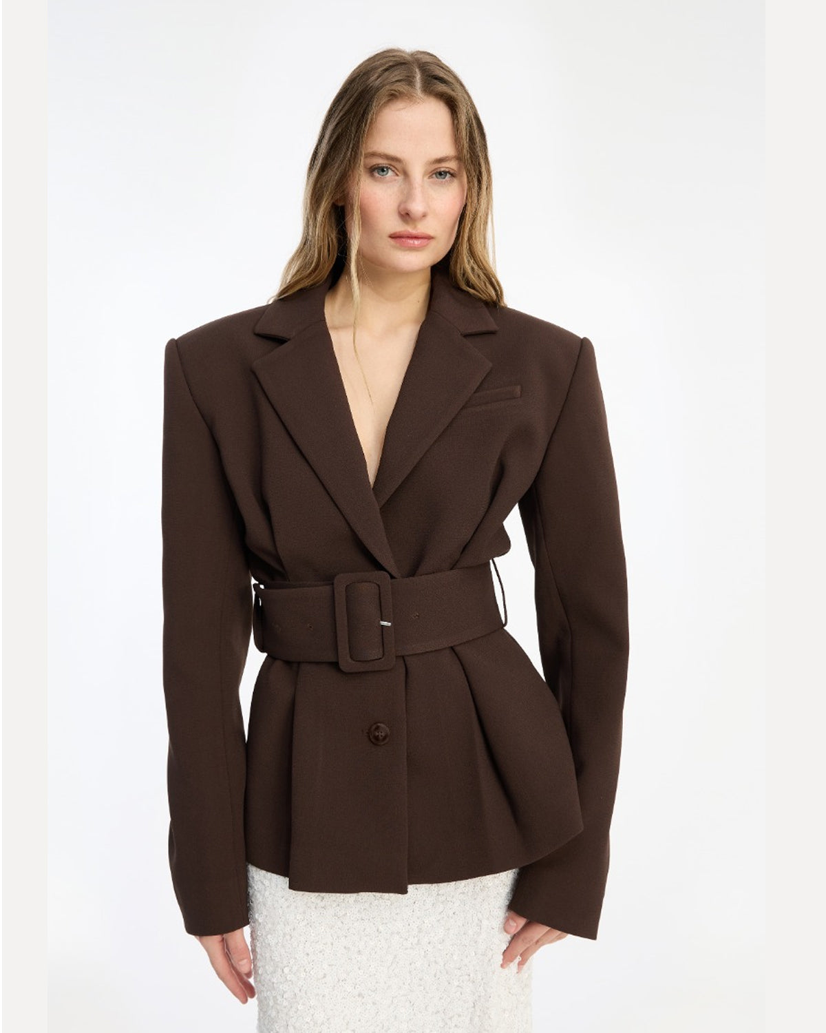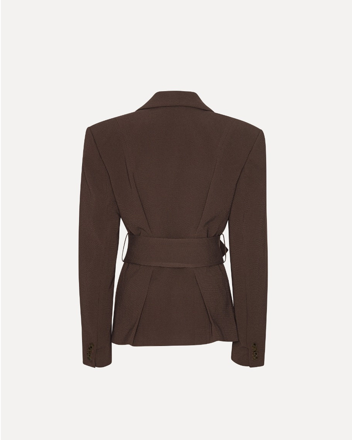 Suiting Belted Blazer i mørkebrun har strukturert skulder, lange ermer med knapper i mansjettene og et matchende belte med stoffspenne. Den lukkes med knapper foran og har diskré lommedetaljer, inkludert en paspolert lomme på brystet. Innsiden er mykt fôret.