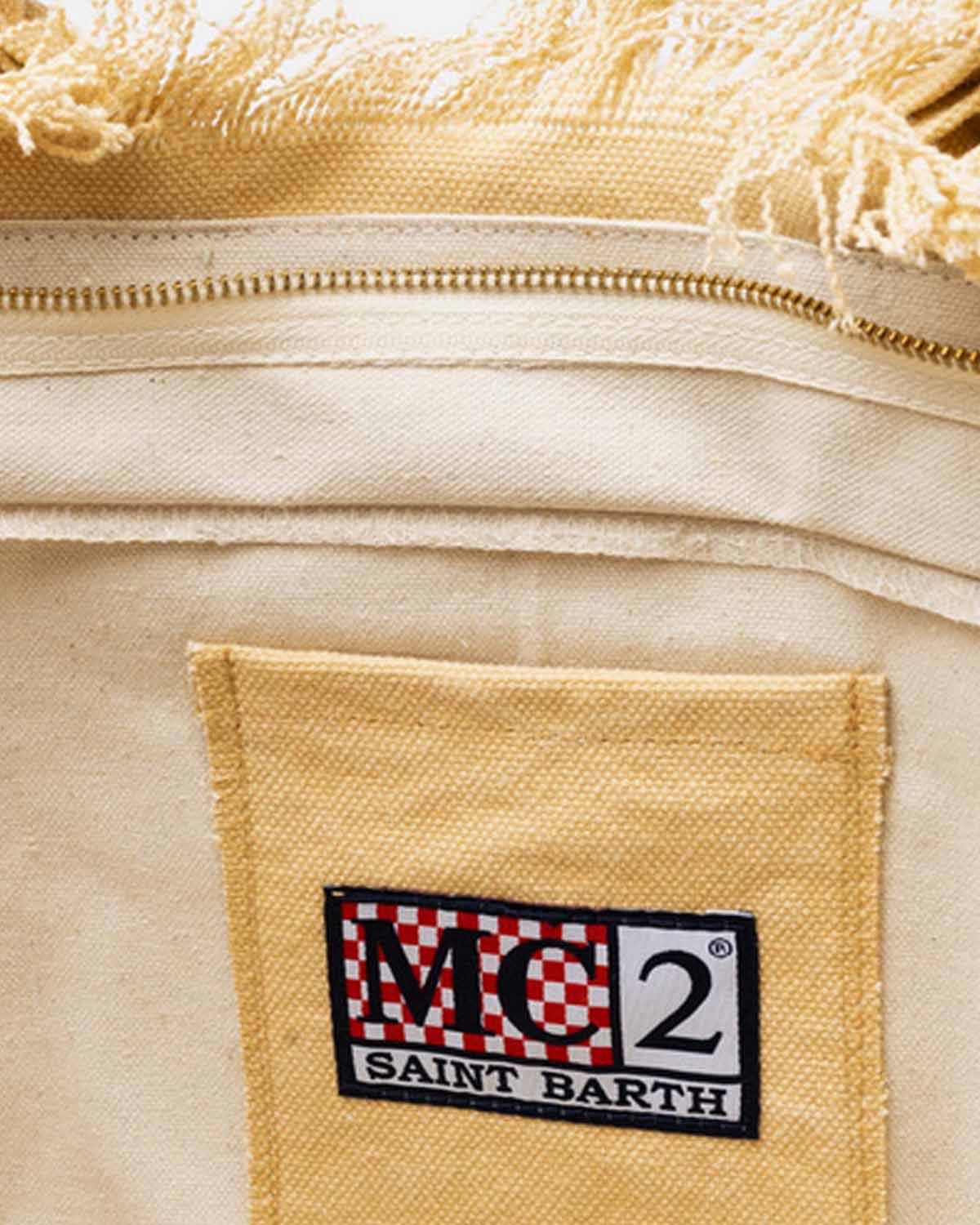 Allsidig og romslig ensfarget veske. Beriket med frynser langs kantene, er den laget av solid bomullsduk, med praktiske og slitesterke håndtak, glidelåslukking og to praktiske lommer. Ideell for en hver sommerdag!