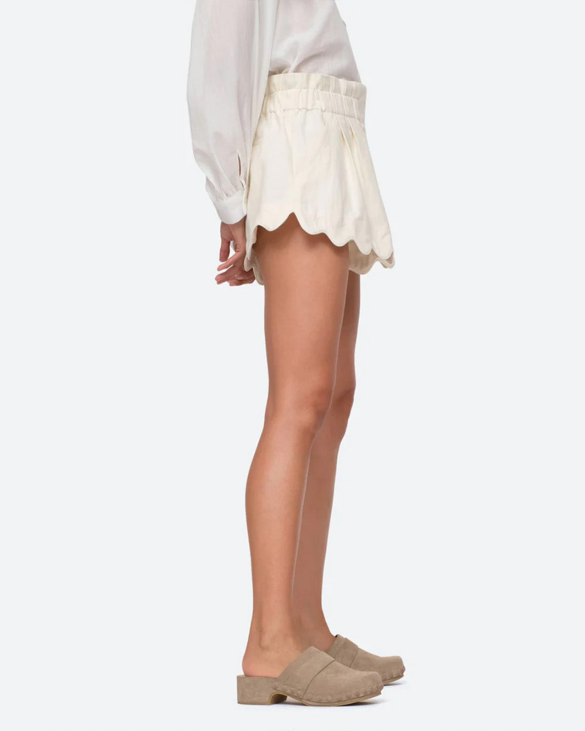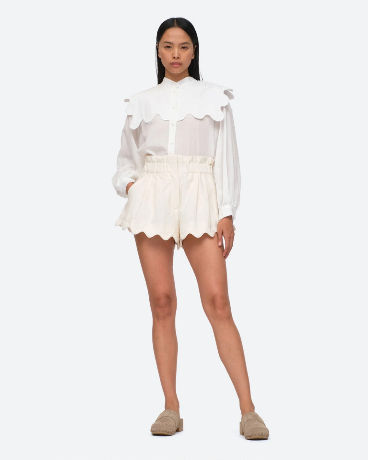 Hvit shorts fra Sea NY. Leona-shortsene har flatterende høyt liv, fire lommer og bølgete kant. Shortsen kan enkelt styles opp og ned etter anledning og er perfekt til varme sommerdager!