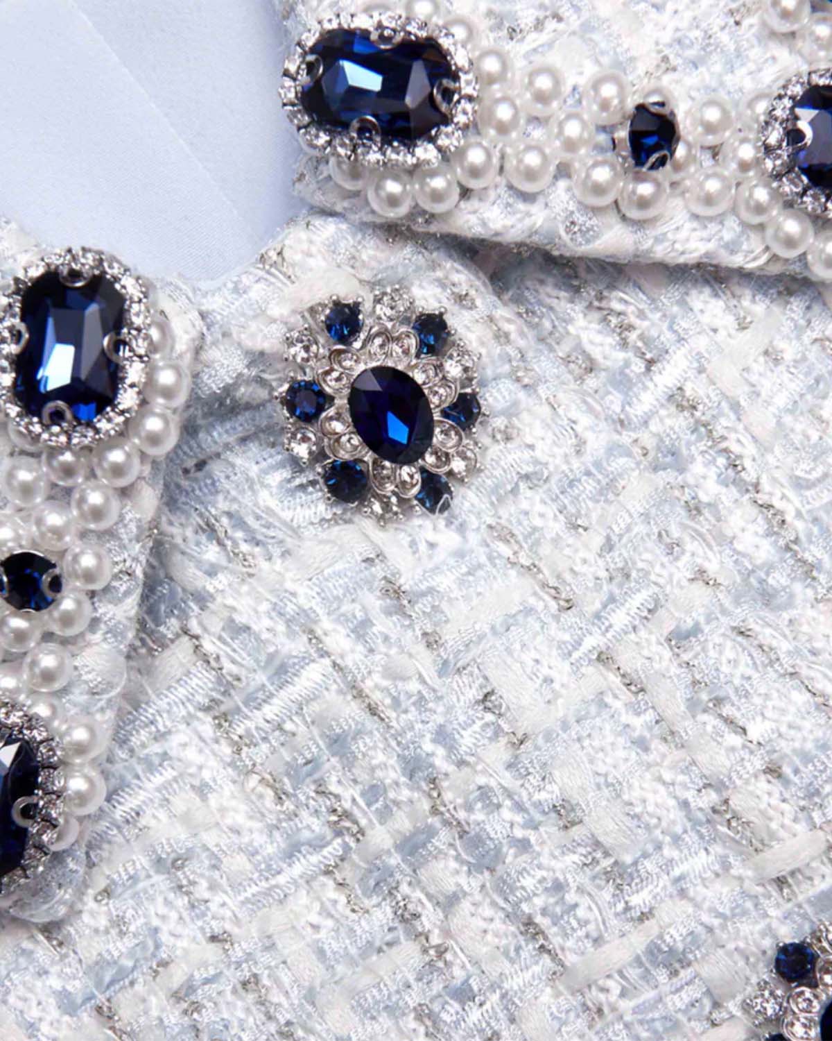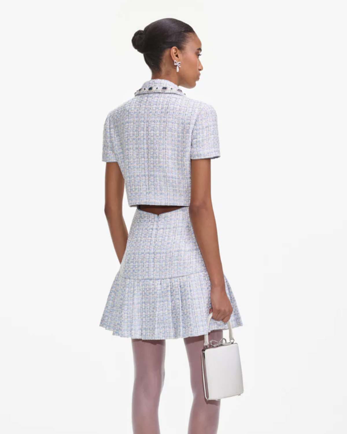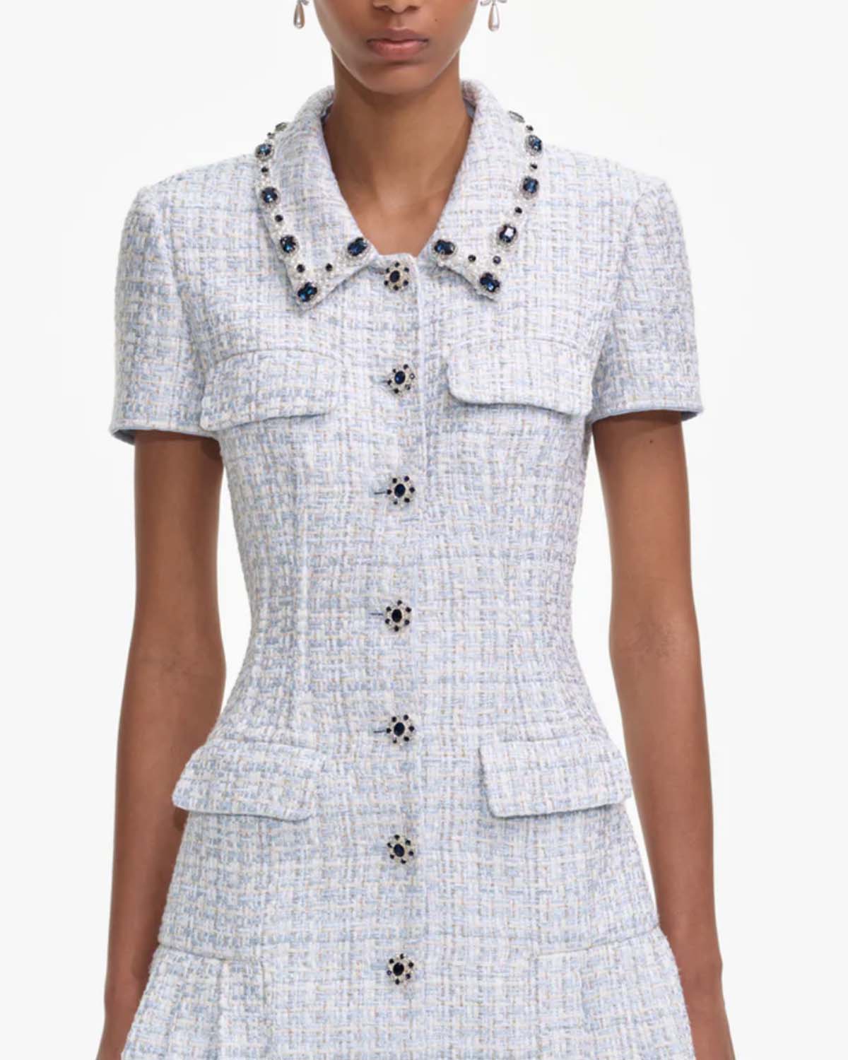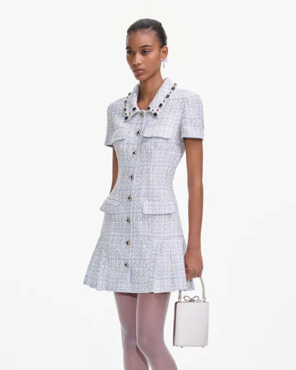 Med en flatterende krage, diamantkanter og glitrende knapper, er denne bouclé-kjolen det enkle svaret for enhver anledning. Kombiner denne minikjolen med ballettsko eller ankelstøvletter.