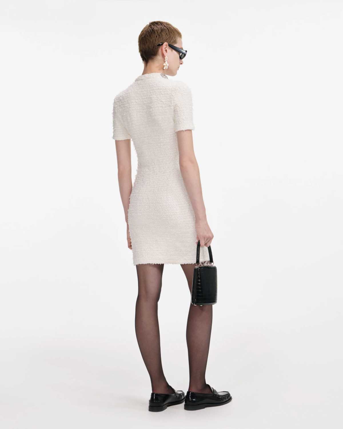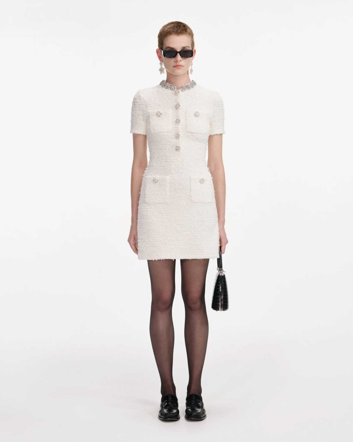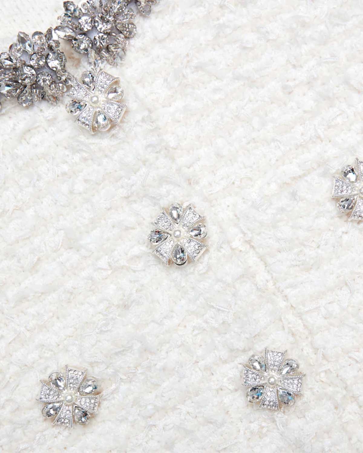 Rene linjer og en elegant passform gir denne kremfargede bouclé-strikkekjolen et polert utseende, mens sølvfargede og diamantformede knapper og kanter bidrar til den festklare appellen. Style den med hæler for en elegant kveld ute.