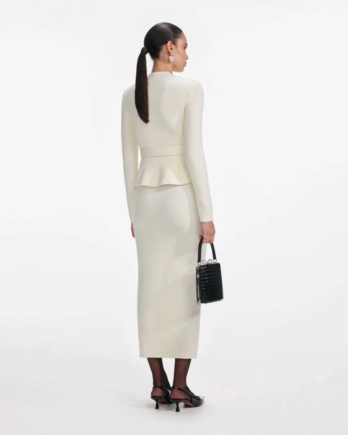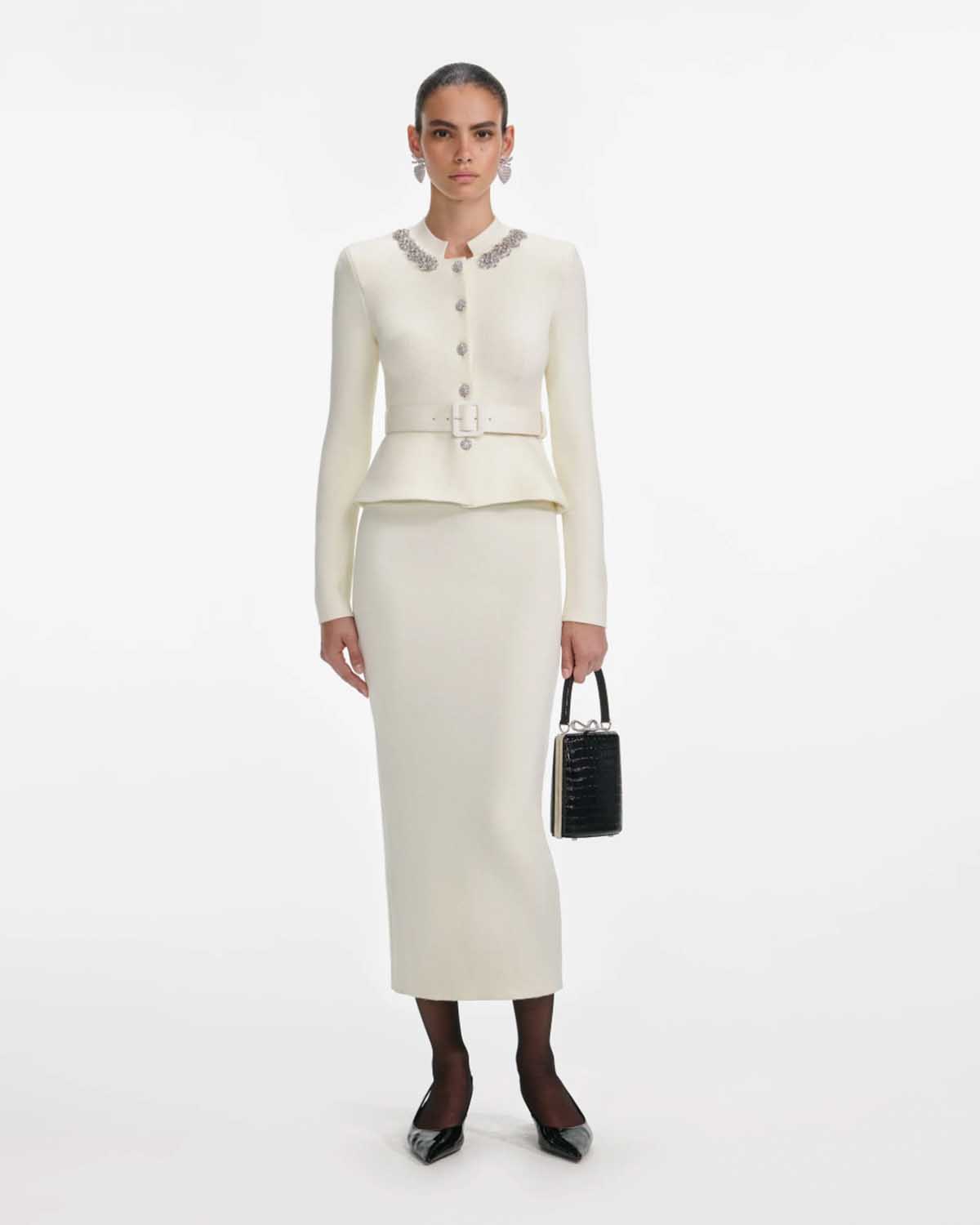Deres ikoniske skreddersydde midikjole er gjenskapt i en blanding av bomull, ull og kasjmir for en perfekt følelse. Beltet i midjen strammes inn over et skulpturert midiskjørt. Detaljert med diamantknapper og kantbånd.