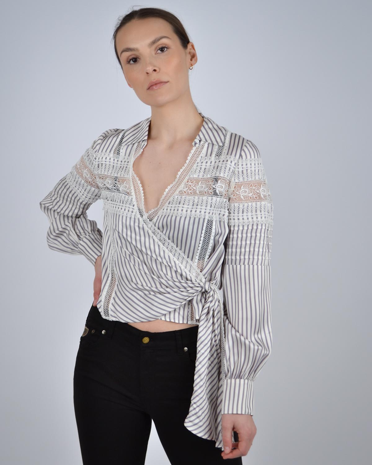 Blue Striped Wrap Top fra Self-Portrait er en delikat overdel med dekorative blondedetaljer og gjennomsiktige partier. Knyting på siden. Oppleves som liten i størrelsen.