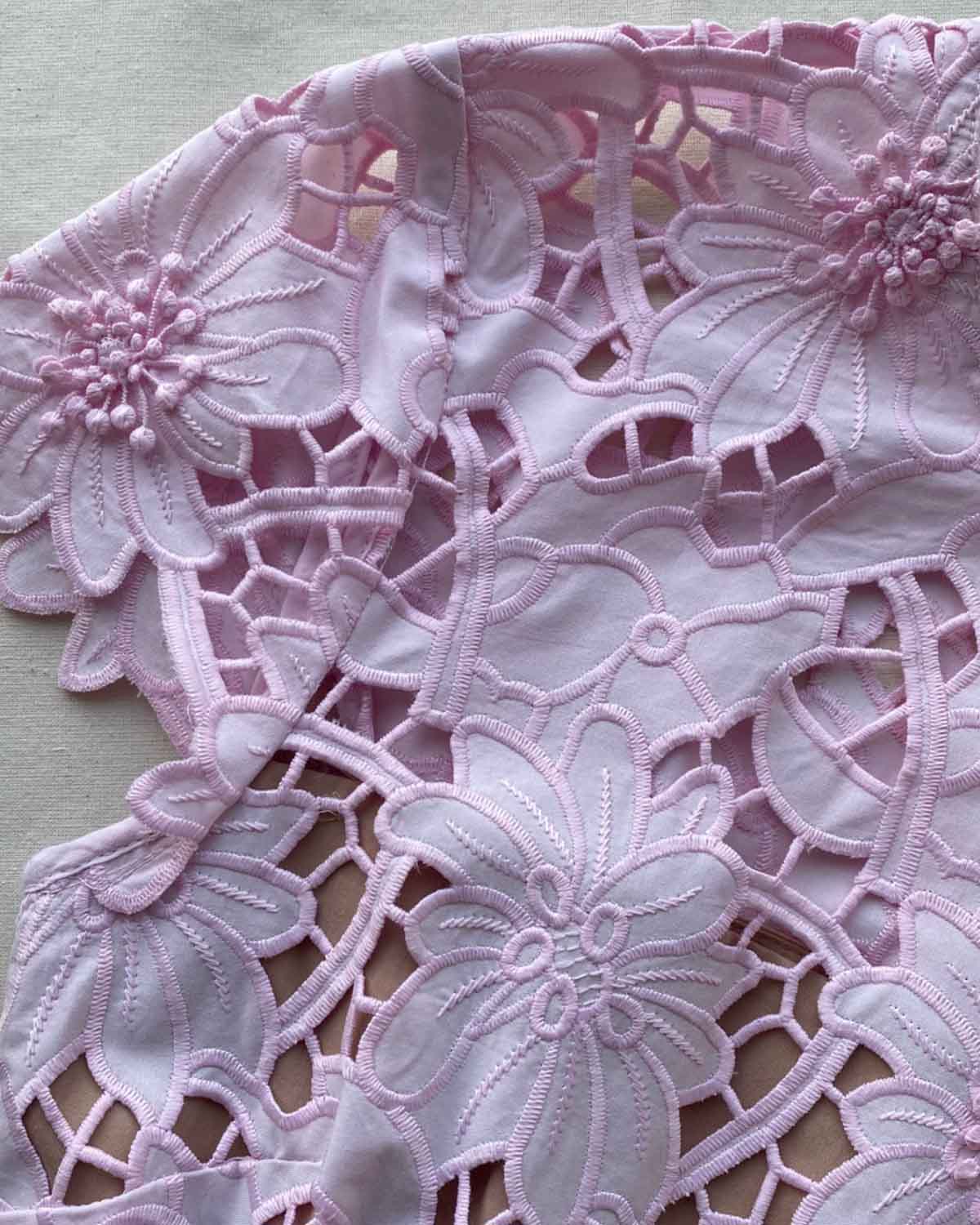 Nydelig kjole i babyrosa fra Self-Portrait. Pink Cotton Guipure Mini Dress er laget med blomsterbroderi, en flettet v-hals og et skjørt med fulle lag, som garantert vil forlenge bena. Style kjolen med ballerinasko for ettermiddagste eller med heler for et mer festlig antrekk.