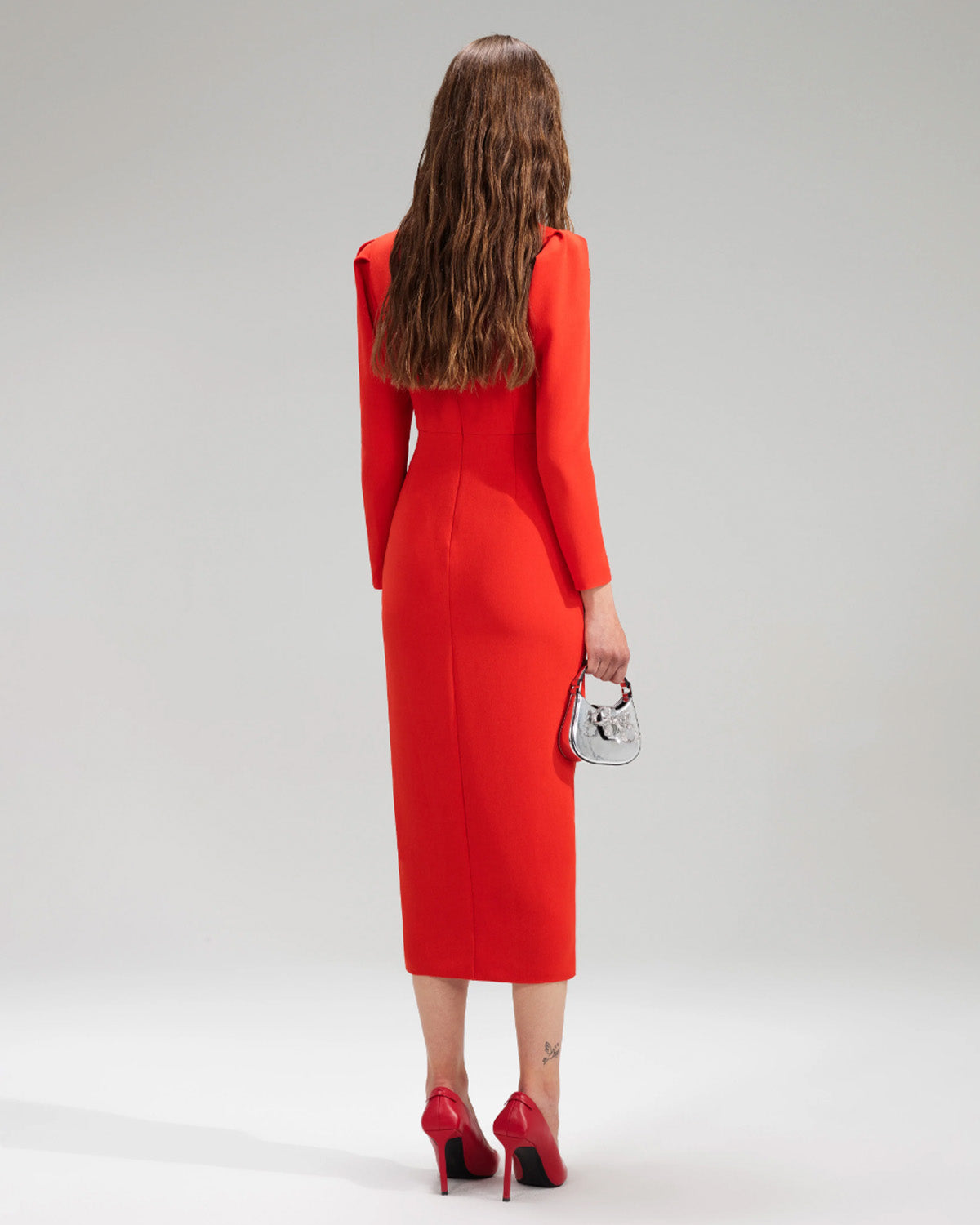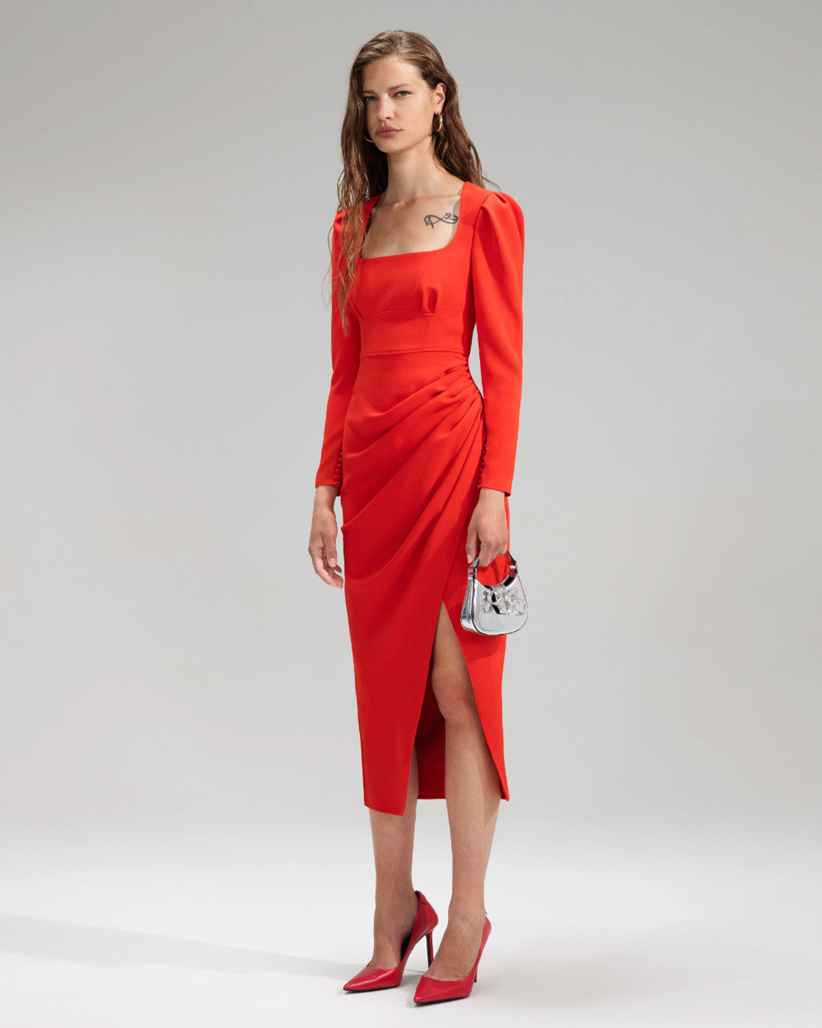 Red Crepe Ruched Midi Dress
