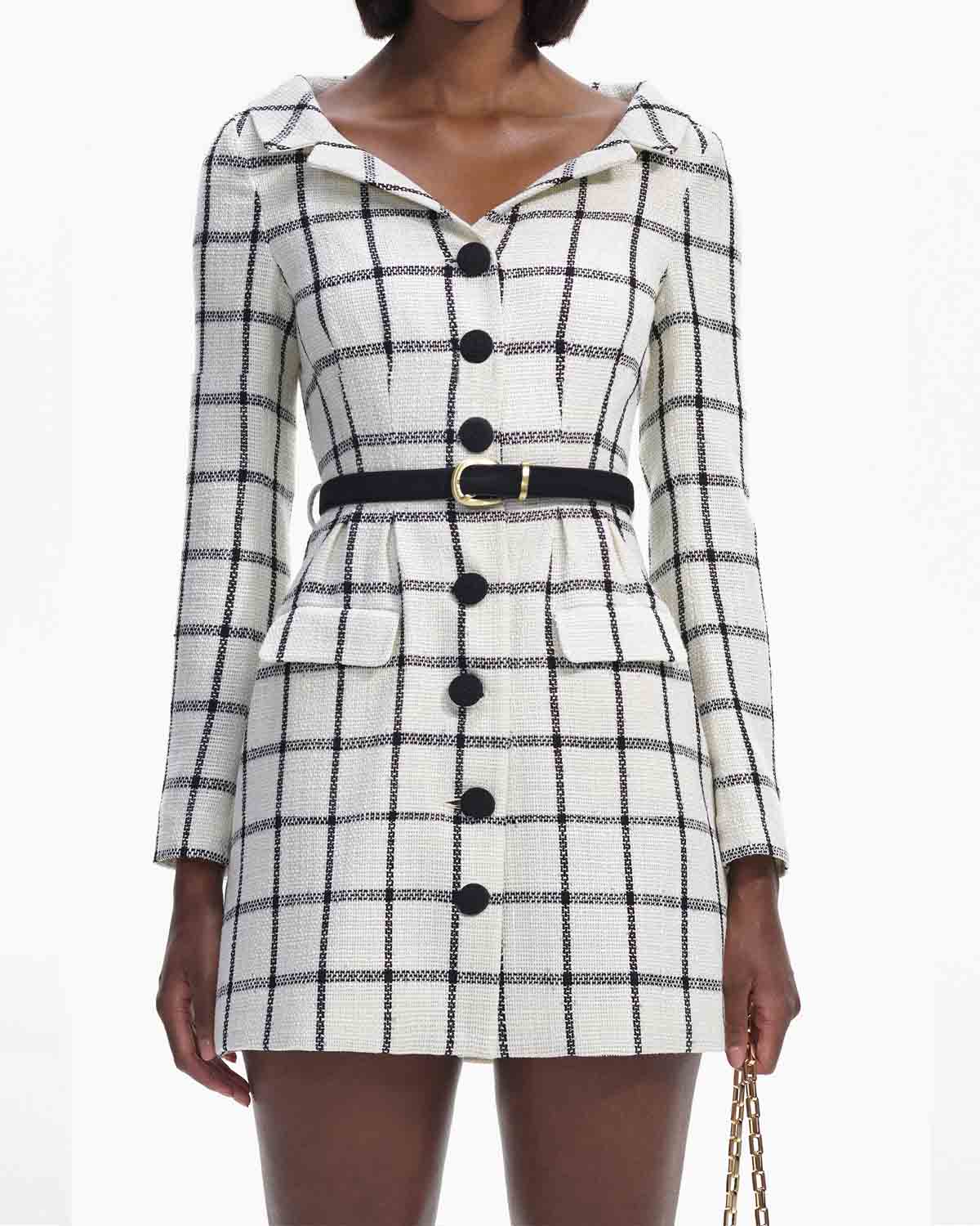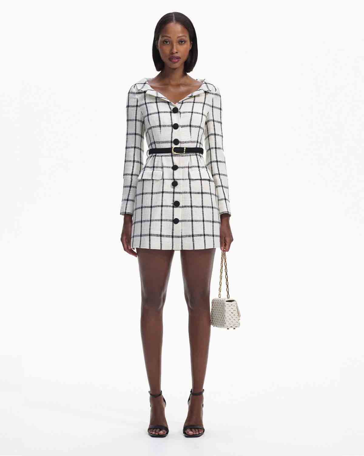 Denne kjolen er kuttet av kremrutet stoff for sin myke struktur. Style den med høye hæler og en rød leppestift for en dose date night glam.