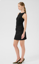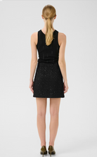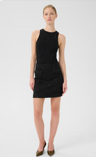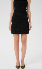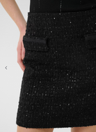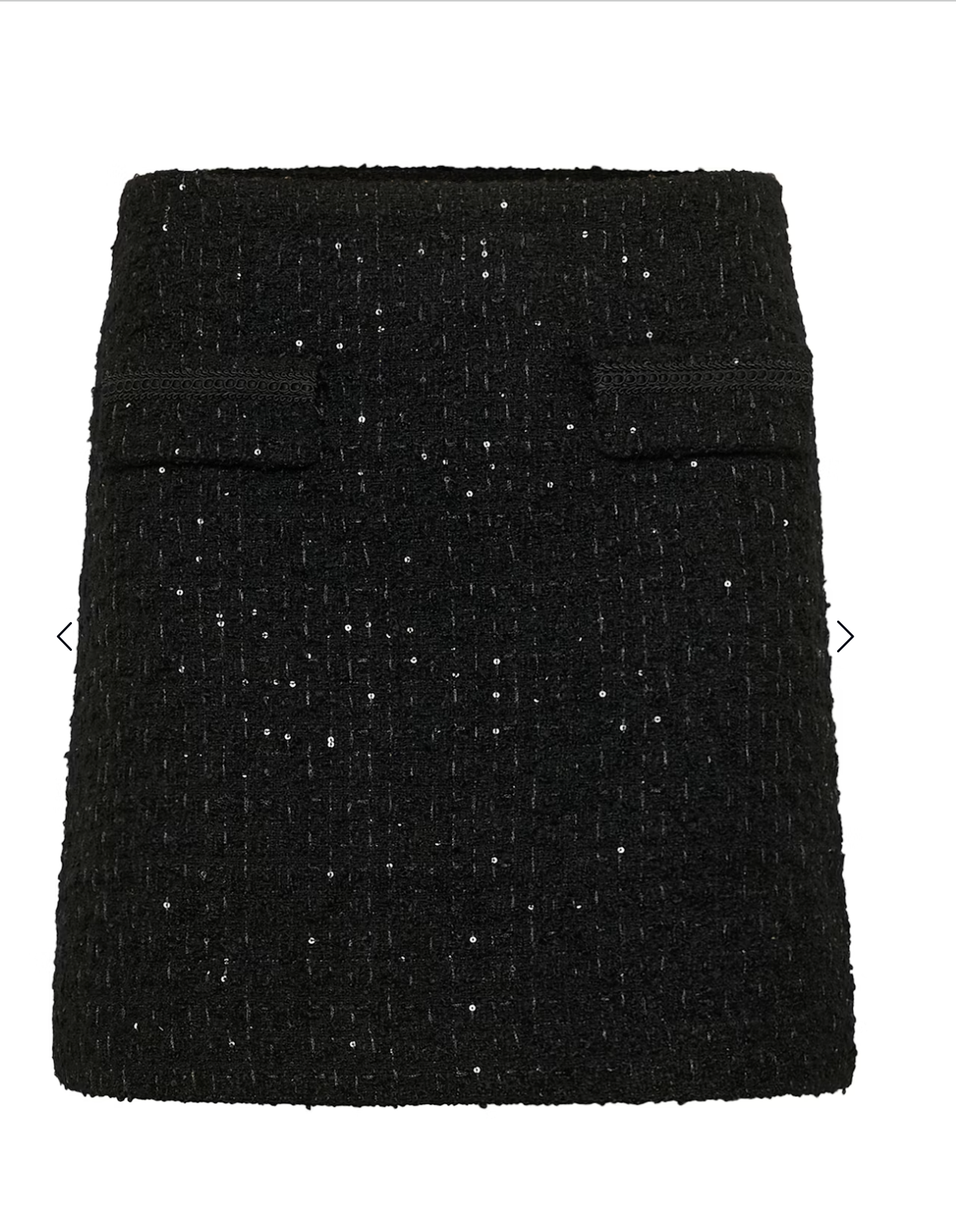 Miniskjørt i tweed med subtile paljetter og dekorative lommer foran. Rent liv og tettsittende passform – ideelt for festantrekk. Modellen er 175 cm høy og har på seg størrelse S/36.