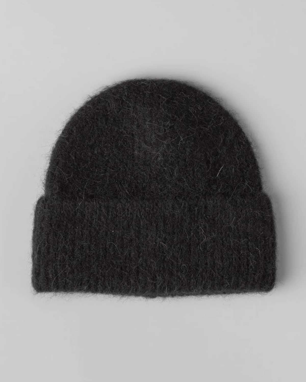 Sort lue til dame fra norske FWSS. Bordeaux Alpaca i fargetonen "Jet Black" er en ribbestrikket lue i varm kvalitet med bred opprett.