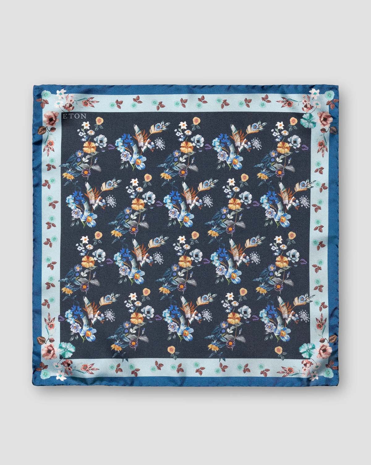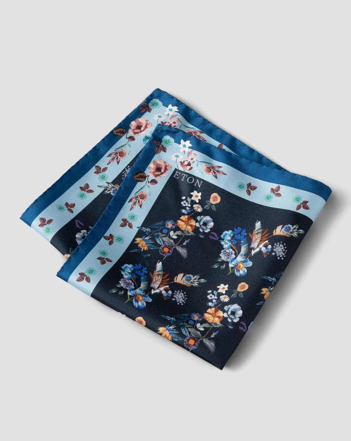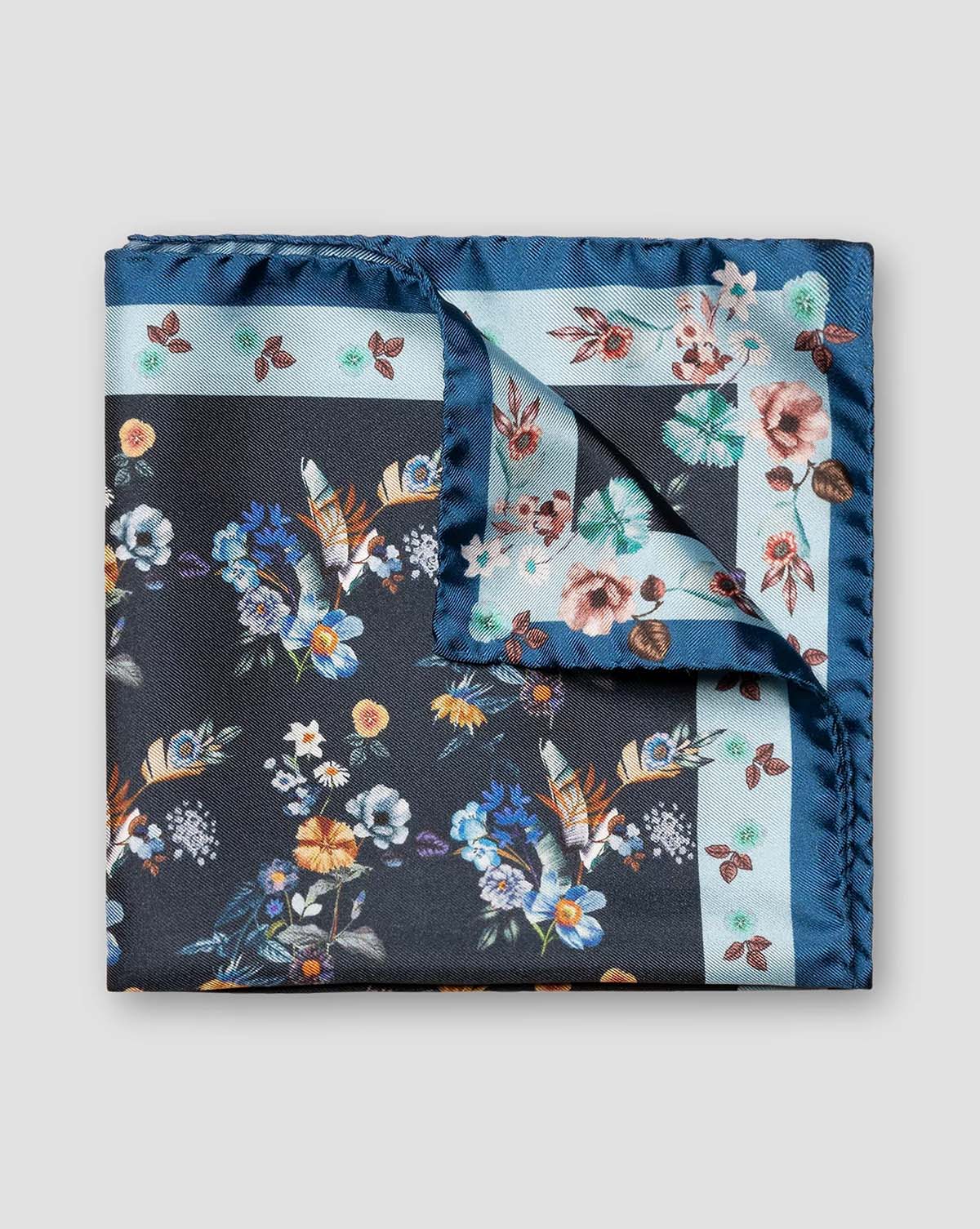 Lommetørkle laget av 100% silke med et sesongbasert blomstermønster trykt på twill silkevev med rik tekstur og flott form når den er brettet. Perfekt for sommerens forretningsklær.