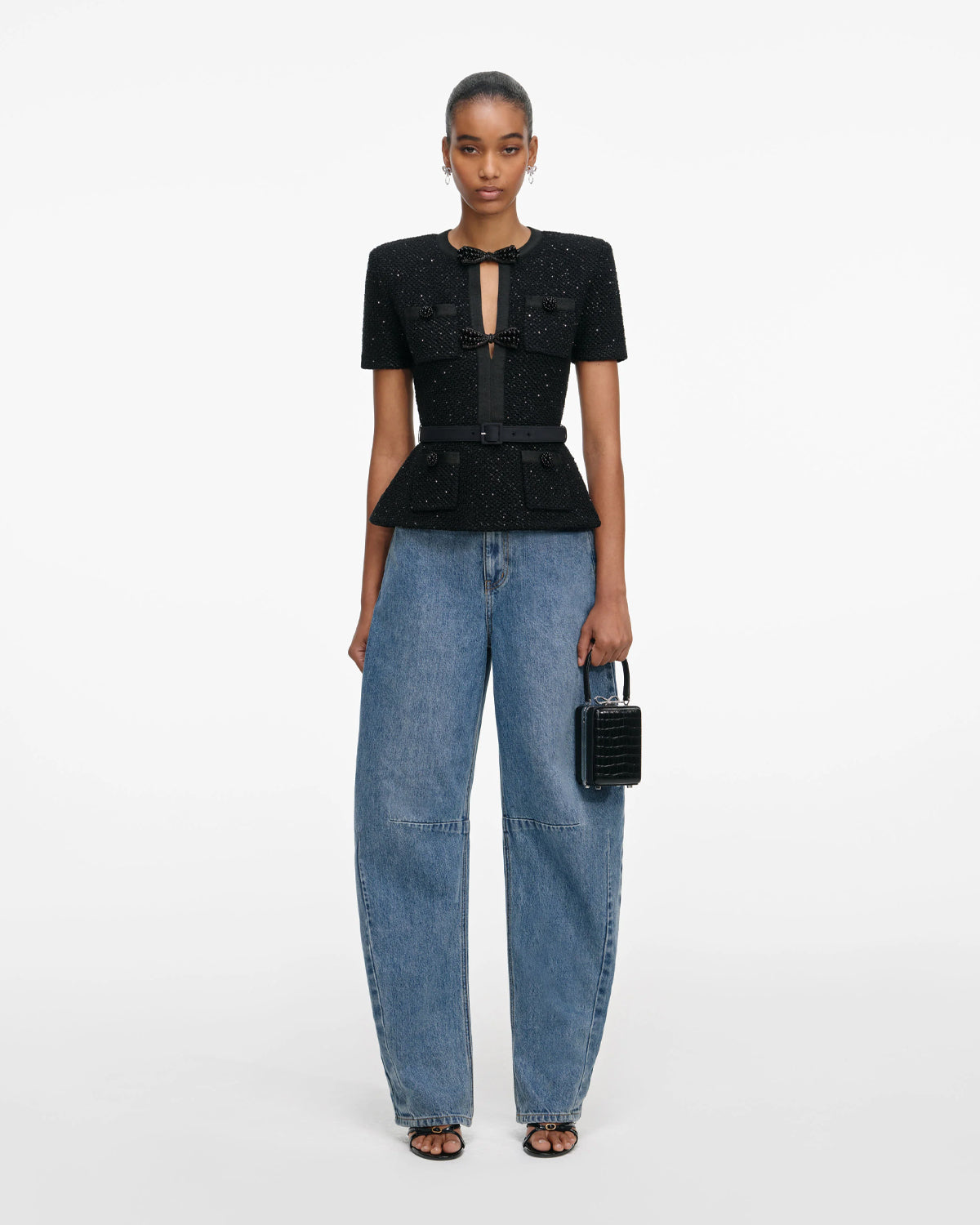 Denne svarte paljettstrikketoppen er et uanstrengt tillegg til ethvert antrekk, og er innrammet av skulderputer og sløyfeutskjæringer foran. Style med denim til middag eller legg til en myk maxikjole for en kveld ute.