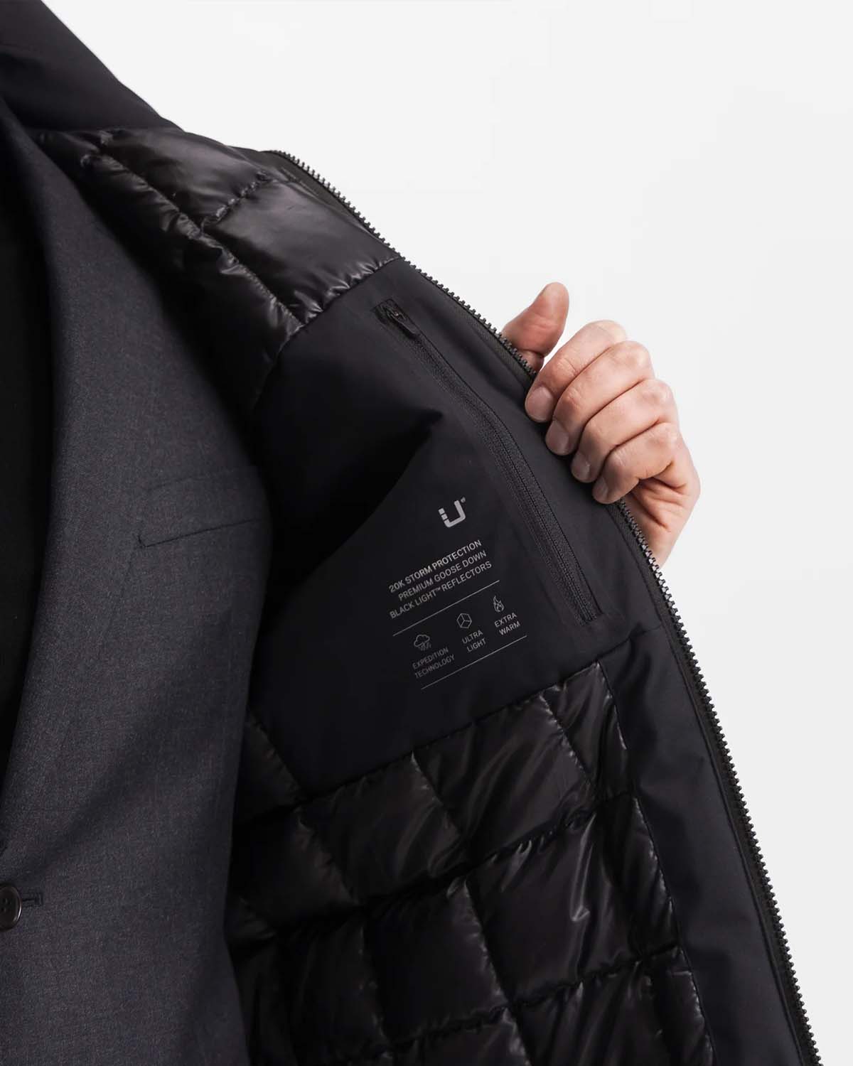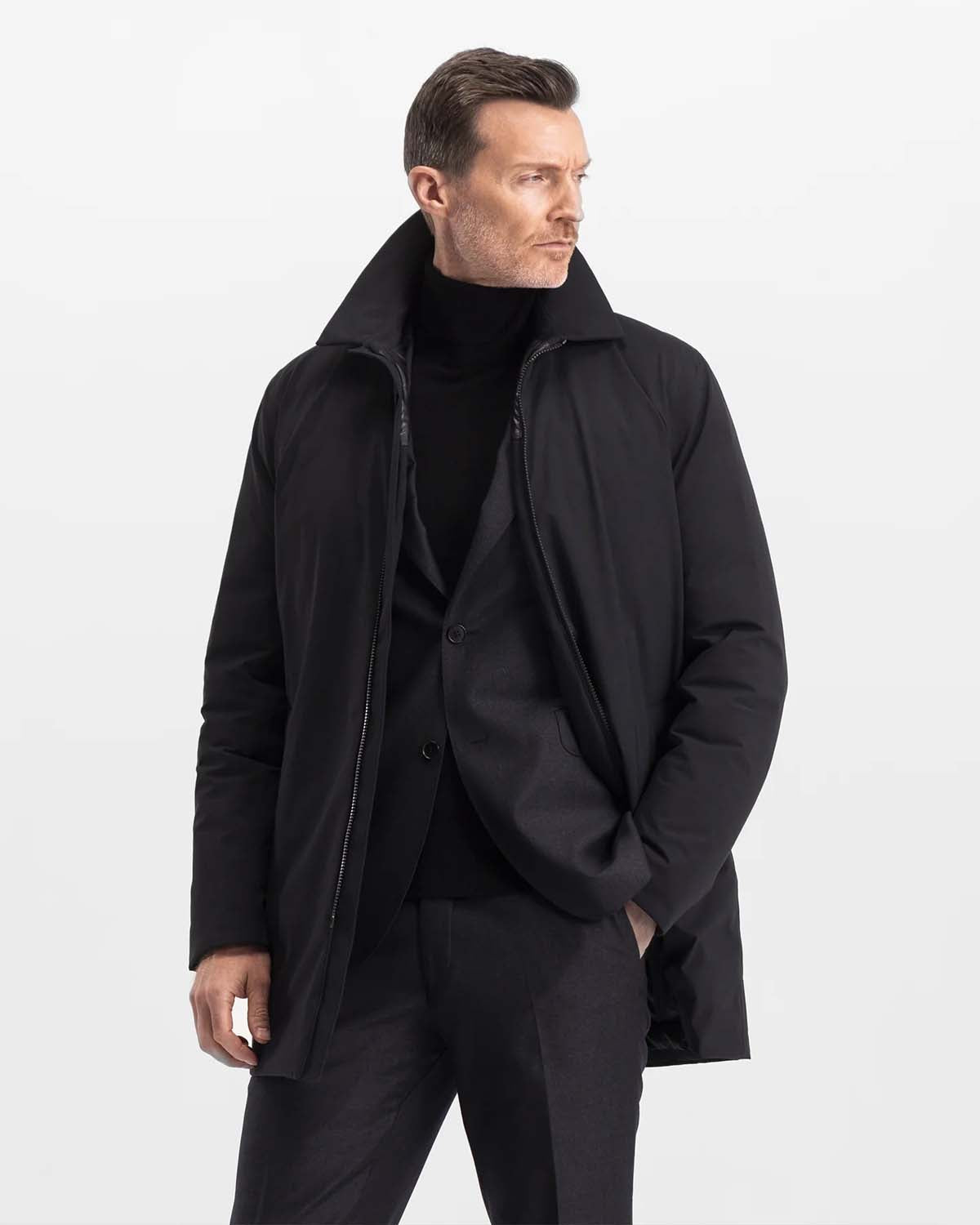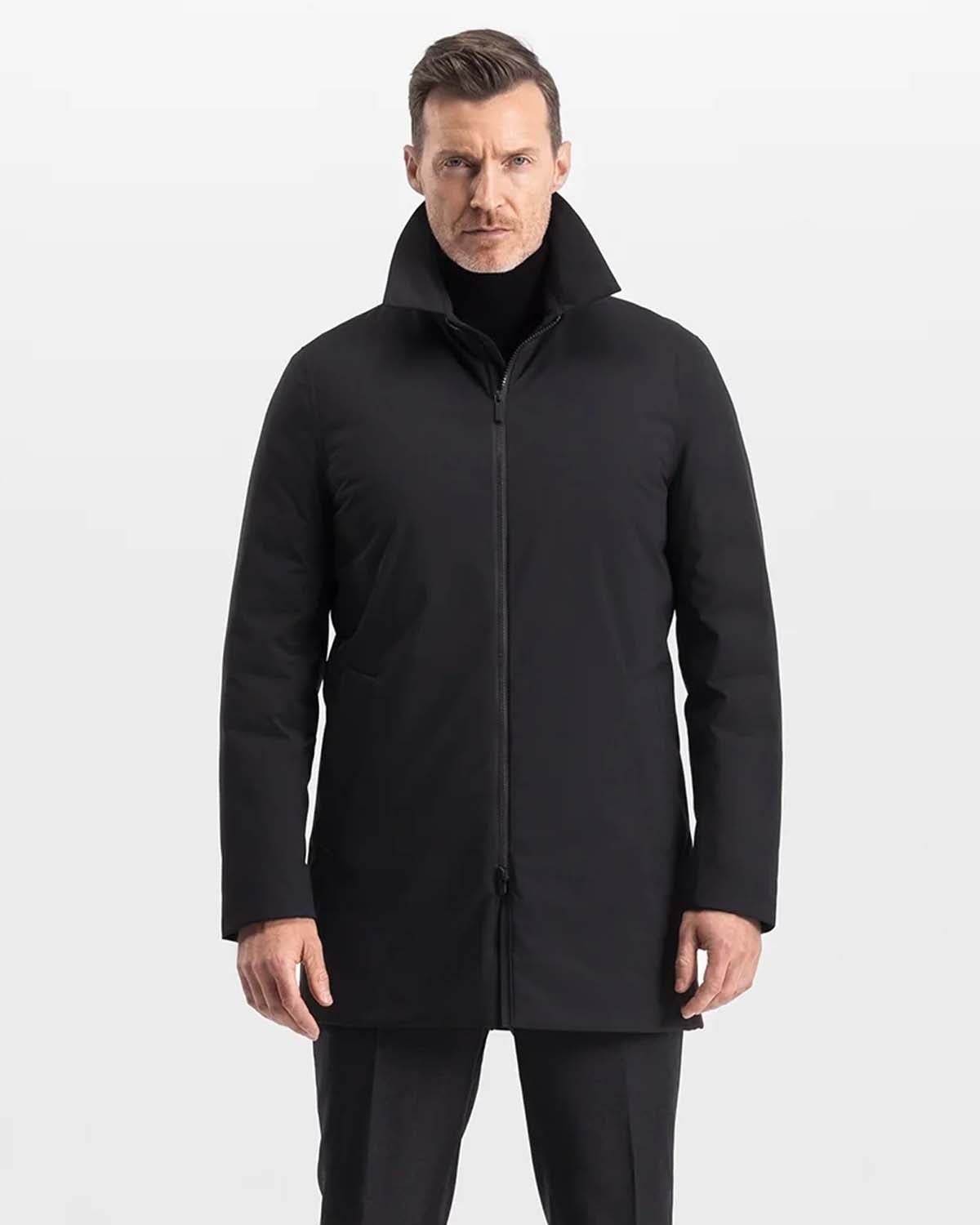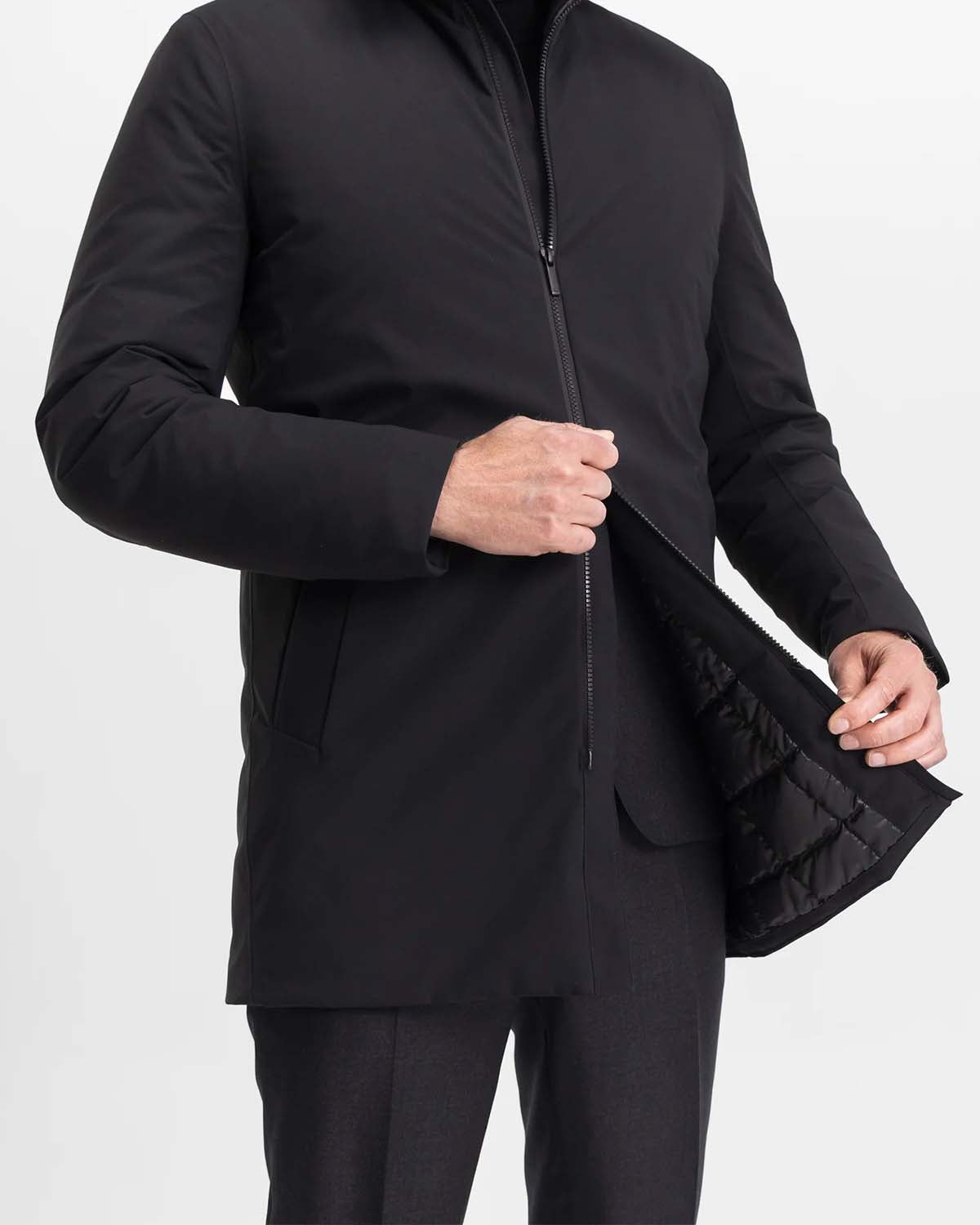 Denne unike, quiltede forretningsfrakken tilbyr en elegant, formell silhuett kombinert med eksepsjonell funksjonalitet. Den gir beskyttelsen av regntøy uten stivheten, og varmen av premium gåsedun, men uten vekten og volumet. Myk, komfortabel og svært allsidig, den er den ideelle følgesvennen for forretningsreiser til destinasjoner der du må være forberedt på alle slags forhold.