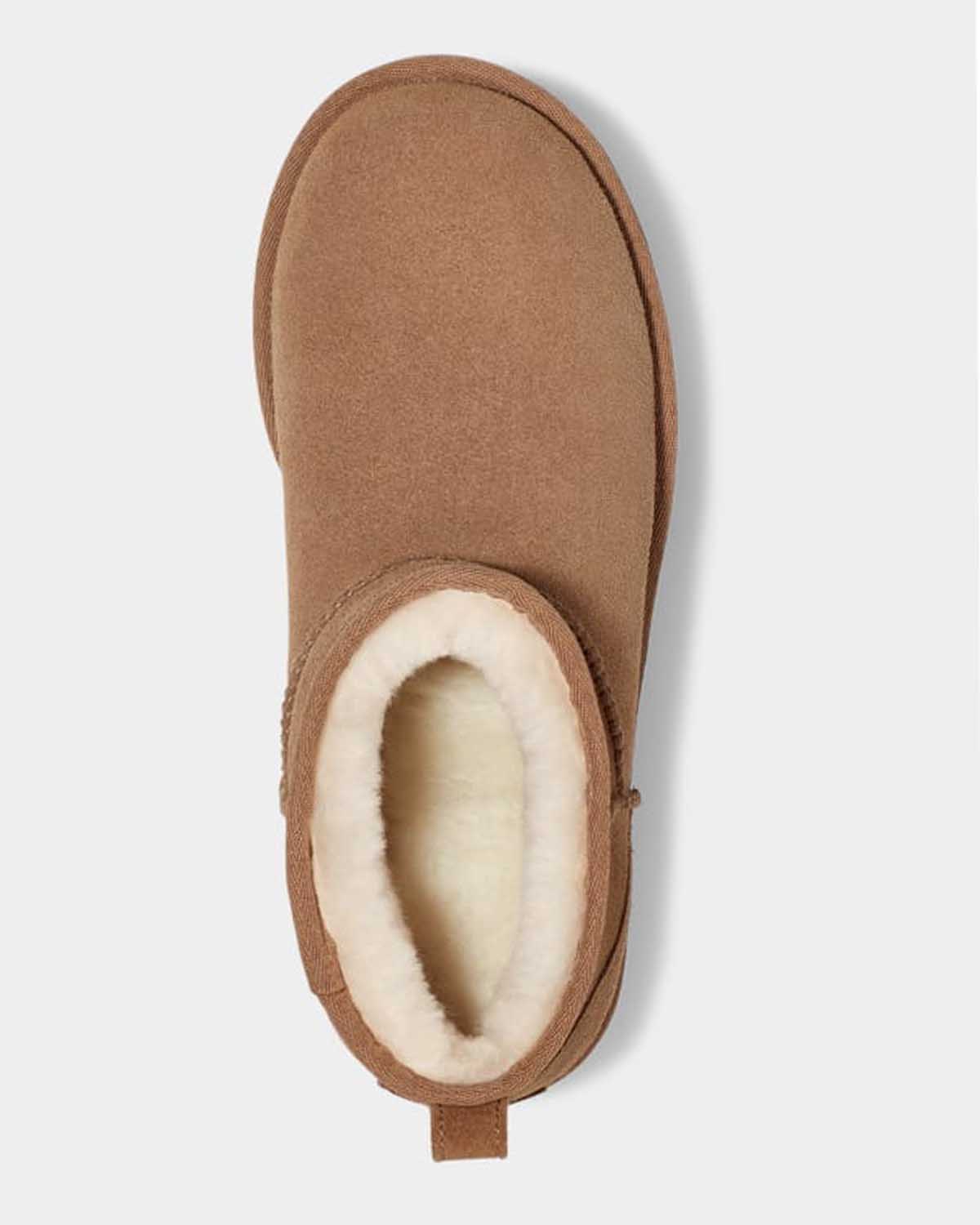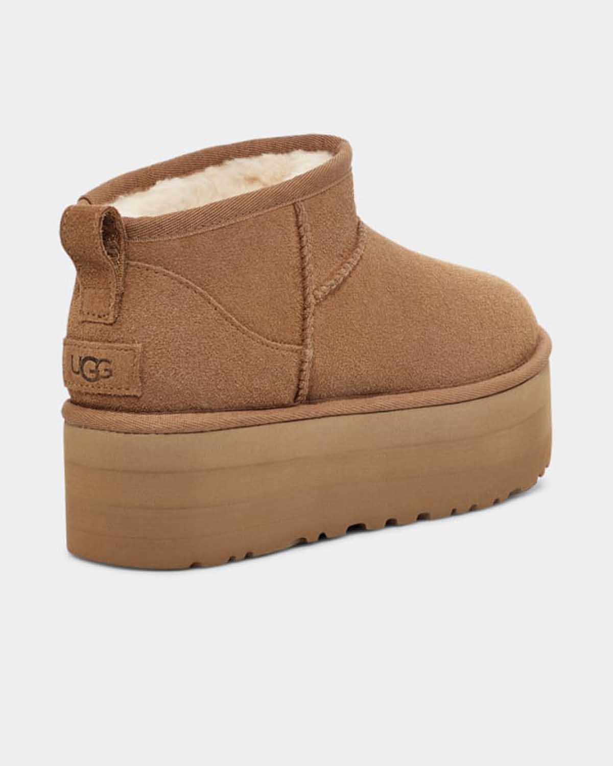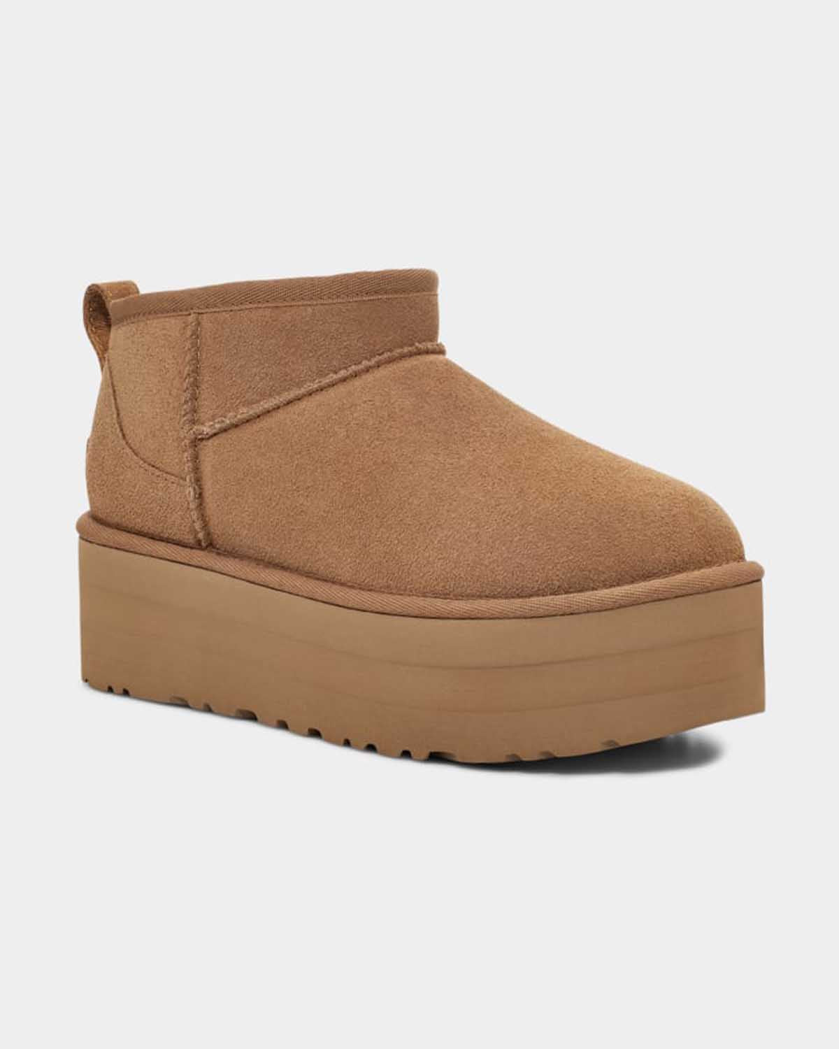 En moderne tolkning av ikonet Classic Mini når nye høyder med en benforlengende 2-tommers plattform. Classic Ultra Mini Platform gir et dristigere utseende enn noen gang, og er laget med samme rike semsket skinn som originalen, pluss deres UGGplush™ ullblanding for signaturmykhet.