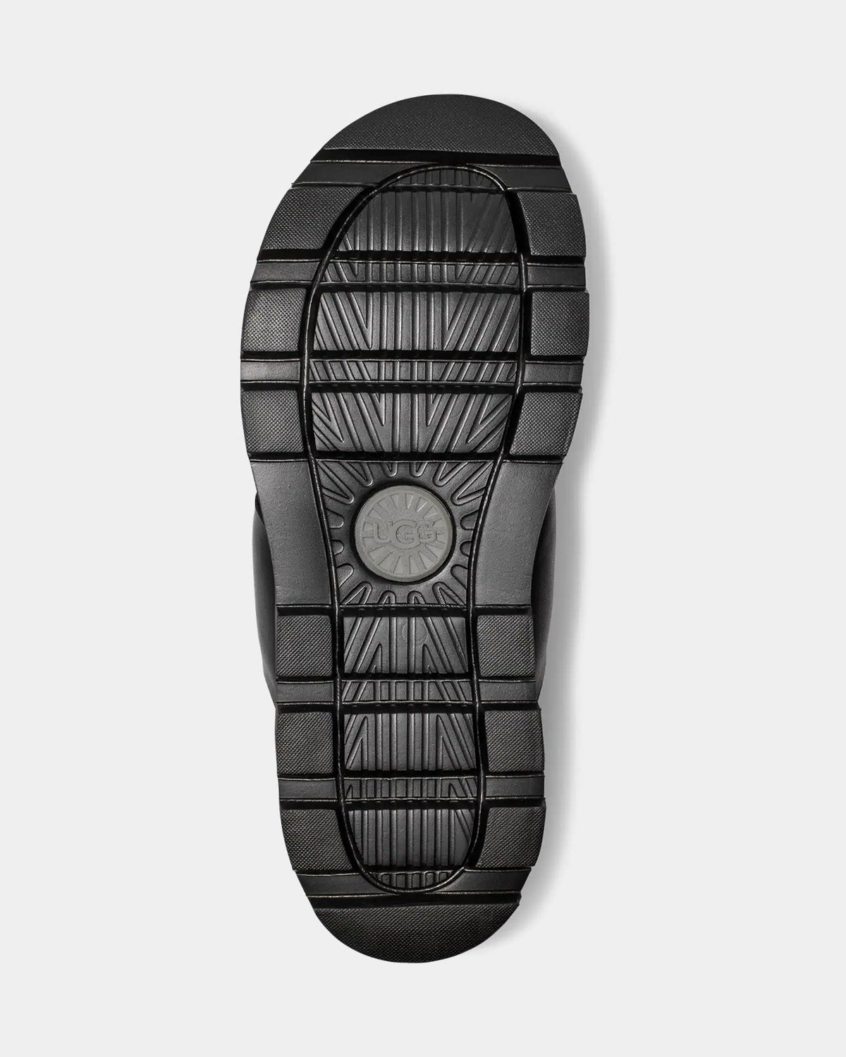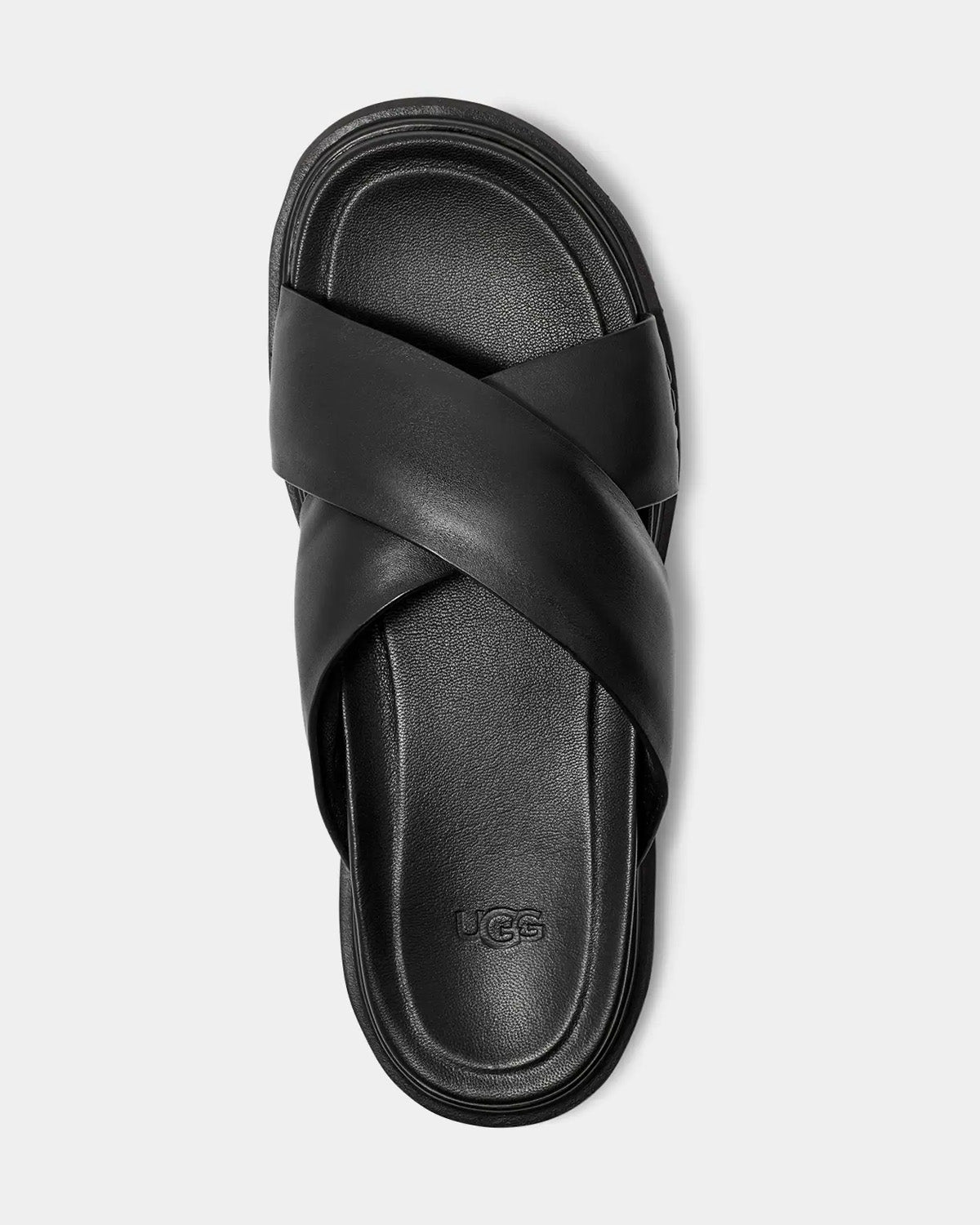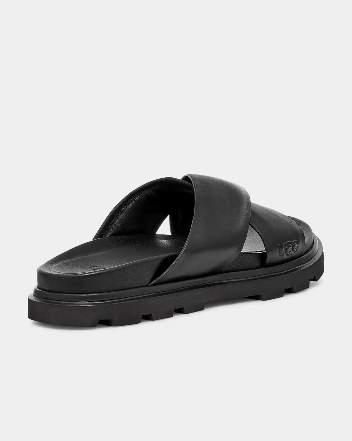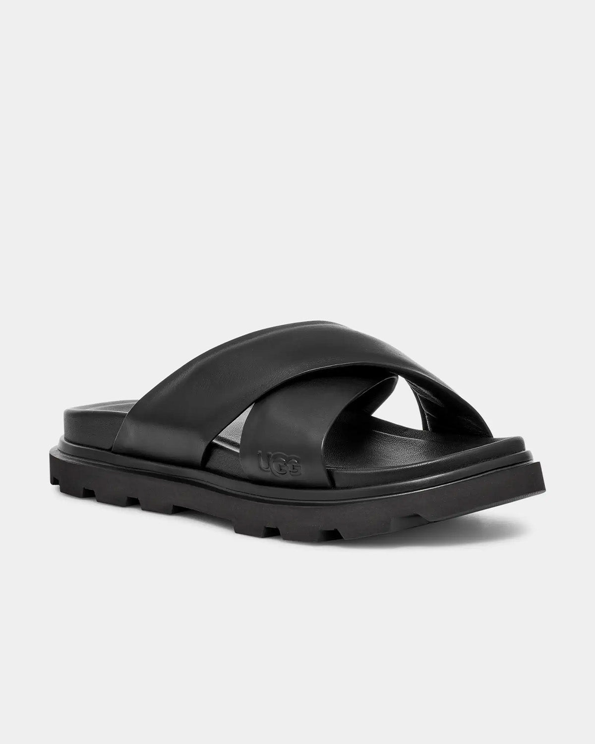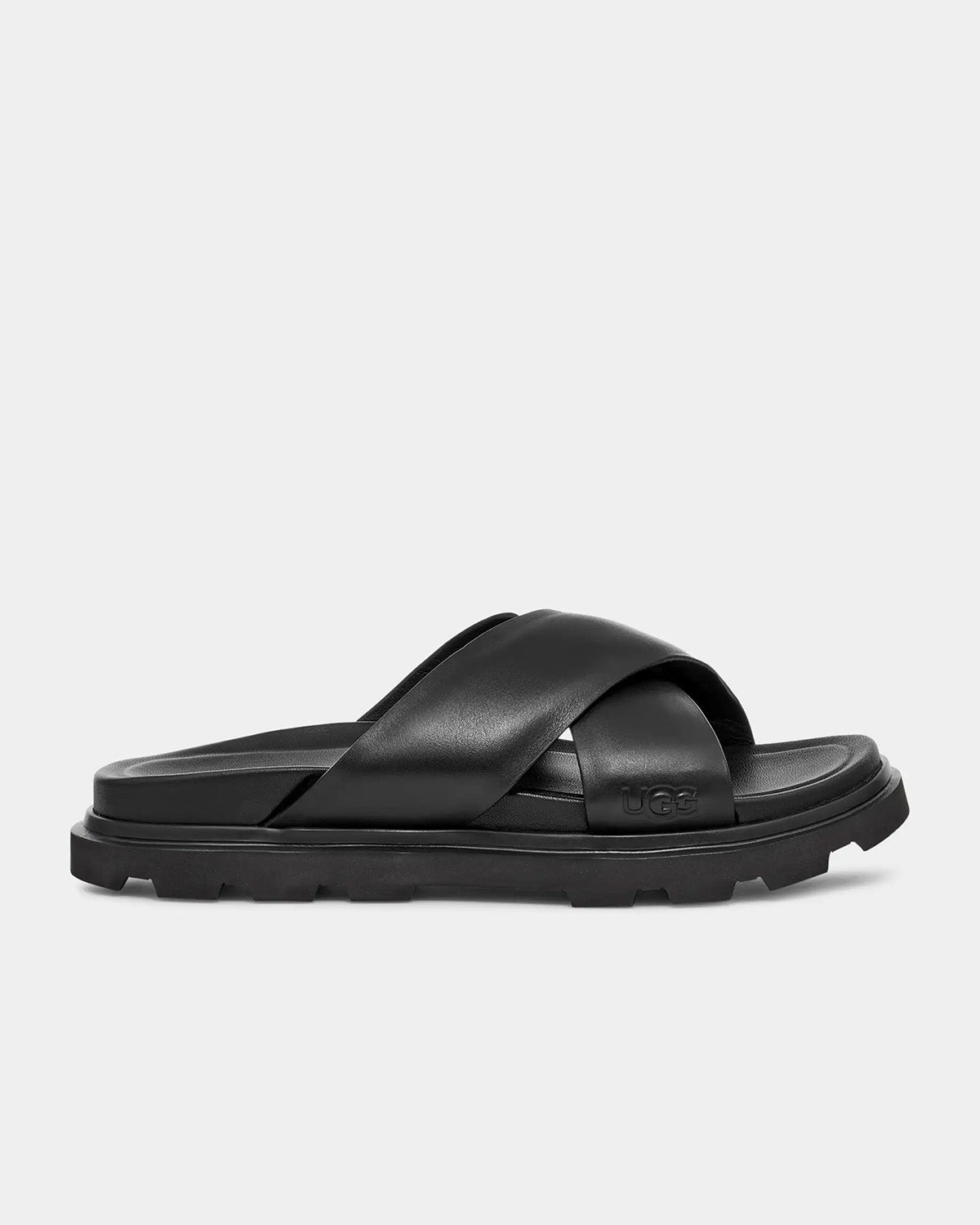 Ekstremt lett og komfortabel. Capitola Cross Slide er en forhøyet sandal med en førsteklasses skinnoverdel og fotsengfôr. Denne sandalen er designet med polstrede øvre stropper, en konturert fotseng og en EVA-yttersåle av sukkerrør som er like støttende og fjærende. Fullført med en varmepreget UGG®-logo og diskret slitebane.