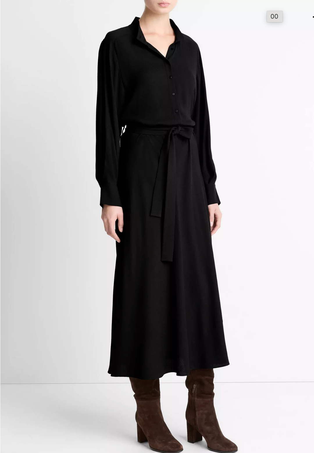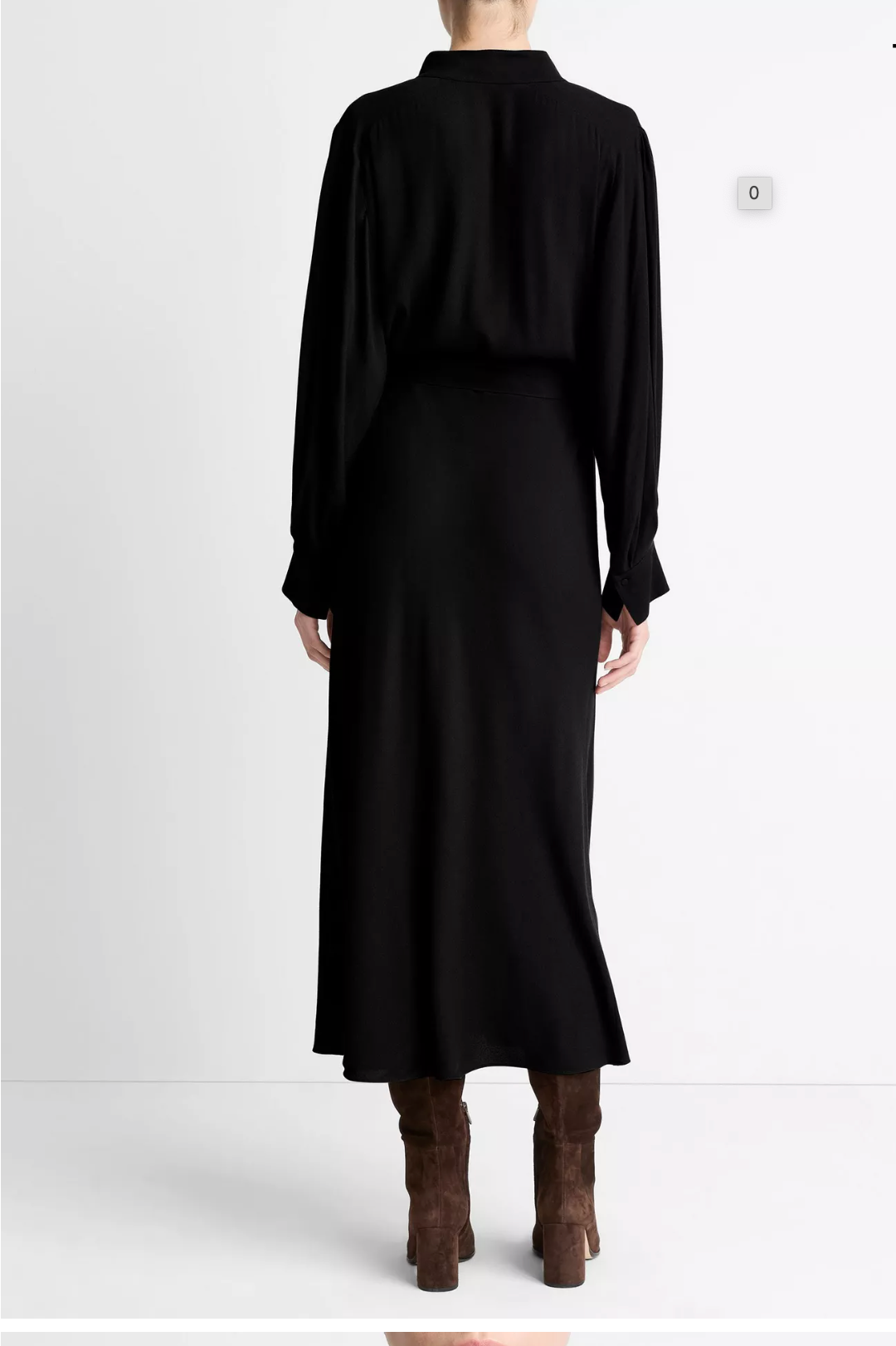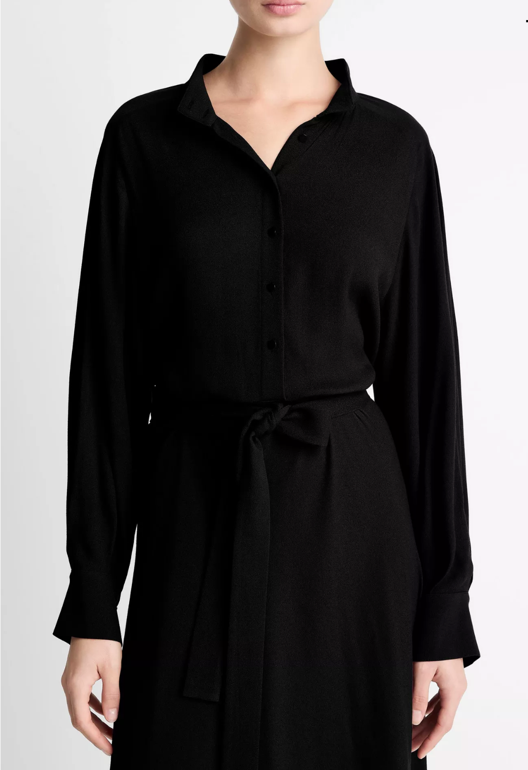 Vår siste iterasjon på den tidløse skjortekjolen er laget av raffinert crepe og kuttet skjevt ved skjørtet for en flytende drapering. Plissering på dolman-ermene gir mykt volum, balansert av et selvknyttingsbelte for å knipe midjen etter ønske.