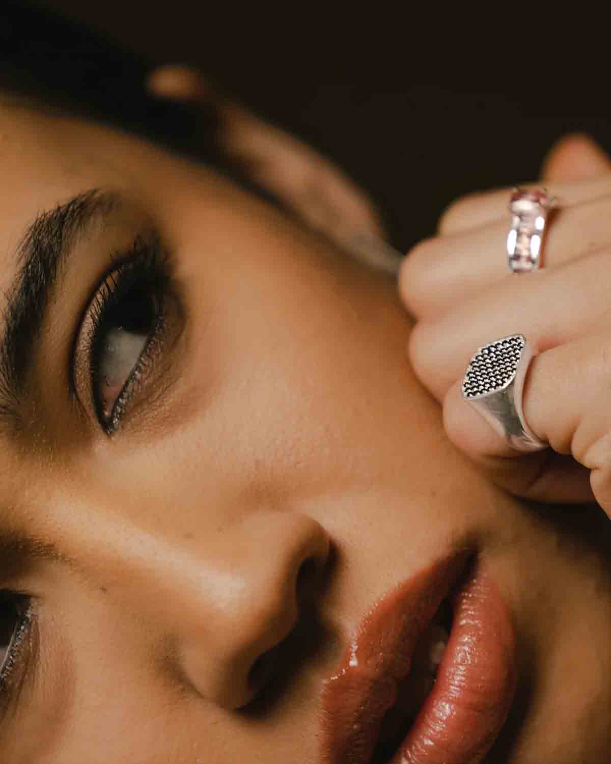 Signet ring i solid 925 sølv, med en topp dekket av sorte Cubic Zirconia steiner. Gravert SHE på innsiden. Ringen er superfin alene, men også kul i kombinasjon med andre ringer.