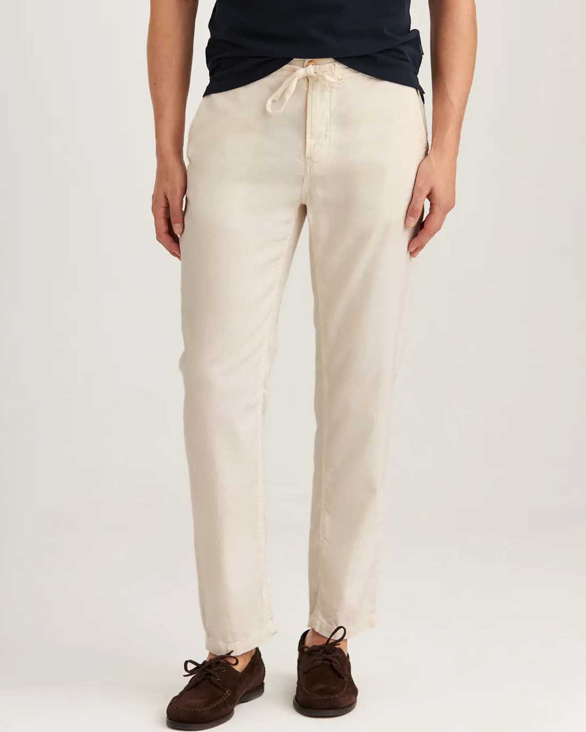 Dette plagget er designet med ren sommeravslapning i tankene - laget i et mykt bomulls-/linstoff som vil holde deg kjølig og komfortabel gjennom de varmere månedene. Lintwillkvaliteten med 3% elastan og snøring i midjen gir en ekstra behagelig passform. Lett avsmalnende ben gir en elegant silhuett. Perfekt å kombinere med en sommerstrikk eller din favoritt linskjorte.