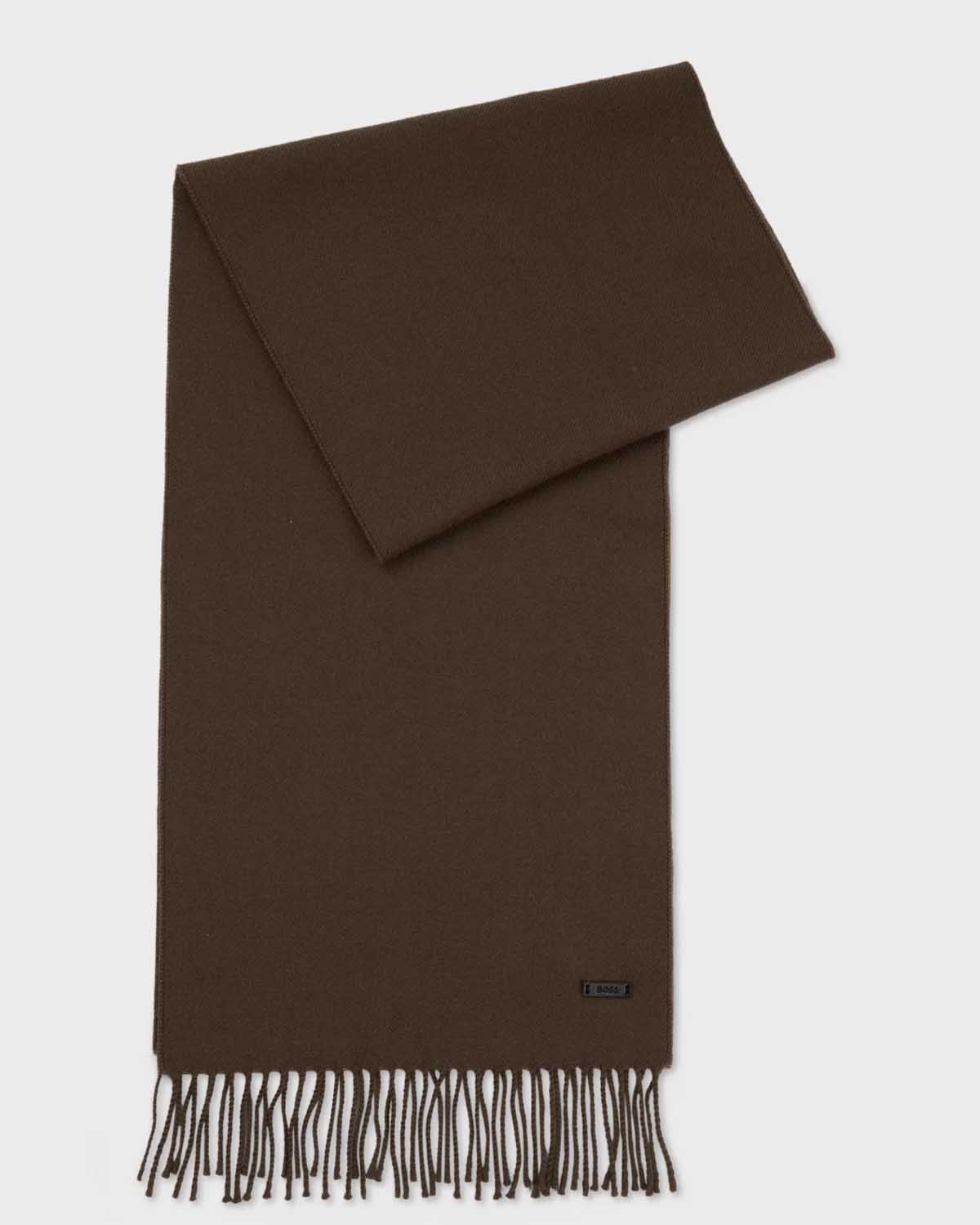 Et signaturskjerf med logoetikett i syntetisk belagt stoff fra BOSS. Dette skjerfet har vridde frynser. Syntetisk belagt stoff, noen ganger referert til som kunstskinn, er et stoff designet for å ligne ekte lær, og/eller vise et matt, blankt, glatt eller teksturert, belagt utseende.