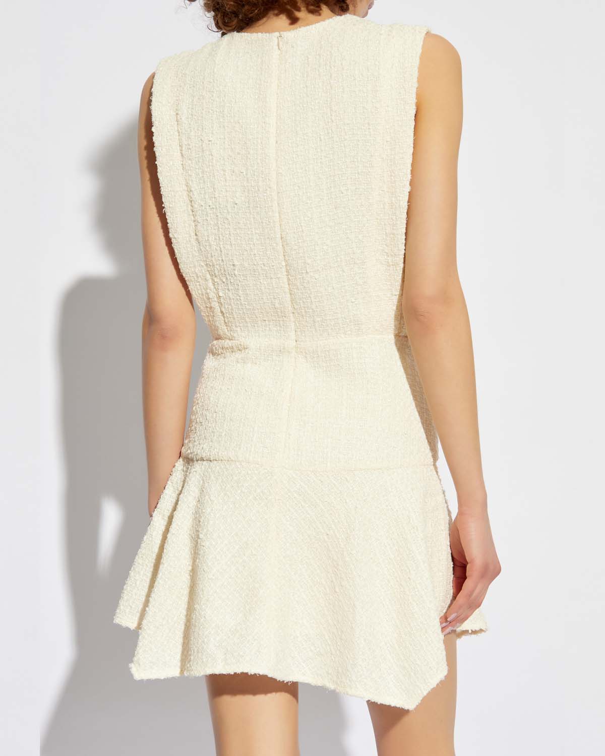 Sebastia kjole fra IRO. Denne kjolen har en kort, utsvingt silhuett som utstråler raffinement. Dens dype V-utringning og ermeløse design forsterker det elegante utseendet, mens det teksturerte stoffet – som minner om tweed eller bouclé – gir kjolen en særegen karakter. Den kremete fargetonen tilfører et snev av subtil eleganse, noe som gjør den til et allsidig valg for enhver raffinert anledning.