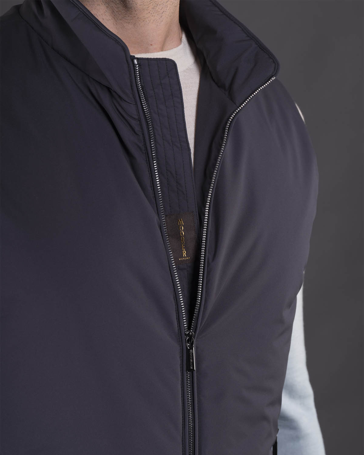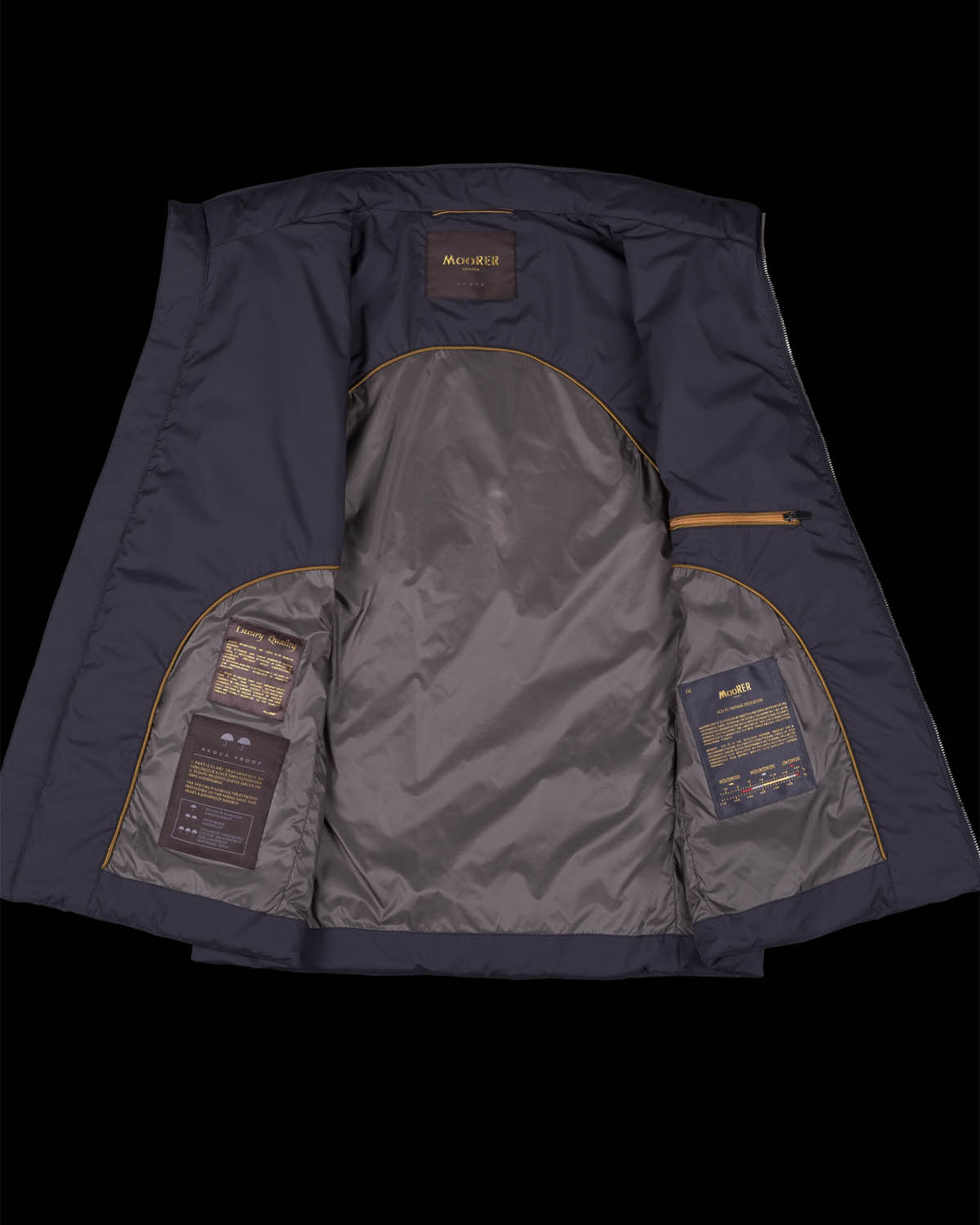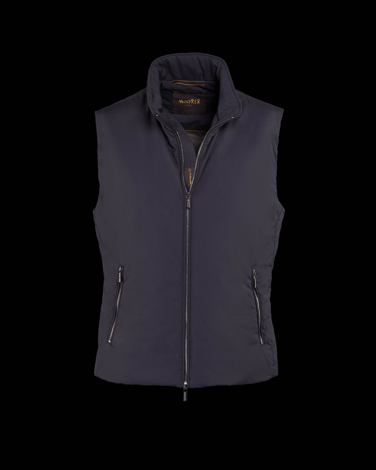 Glatt vest fra Moorer. Aqua Line (2 paraplyer) laget i superlett matt harpiksbelagt vannavstøtende stoff. Foret med syntetisk fjær-effekt polstring.