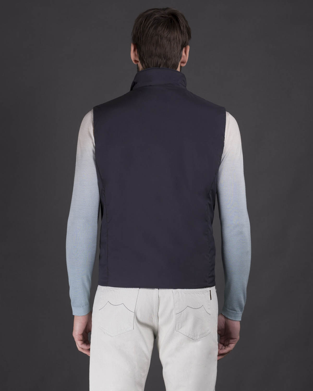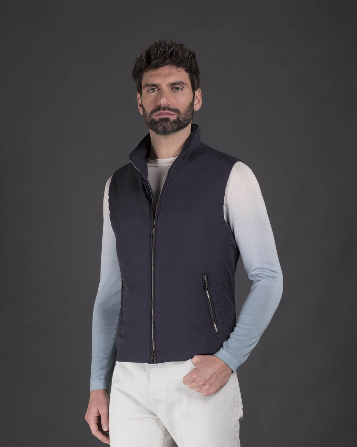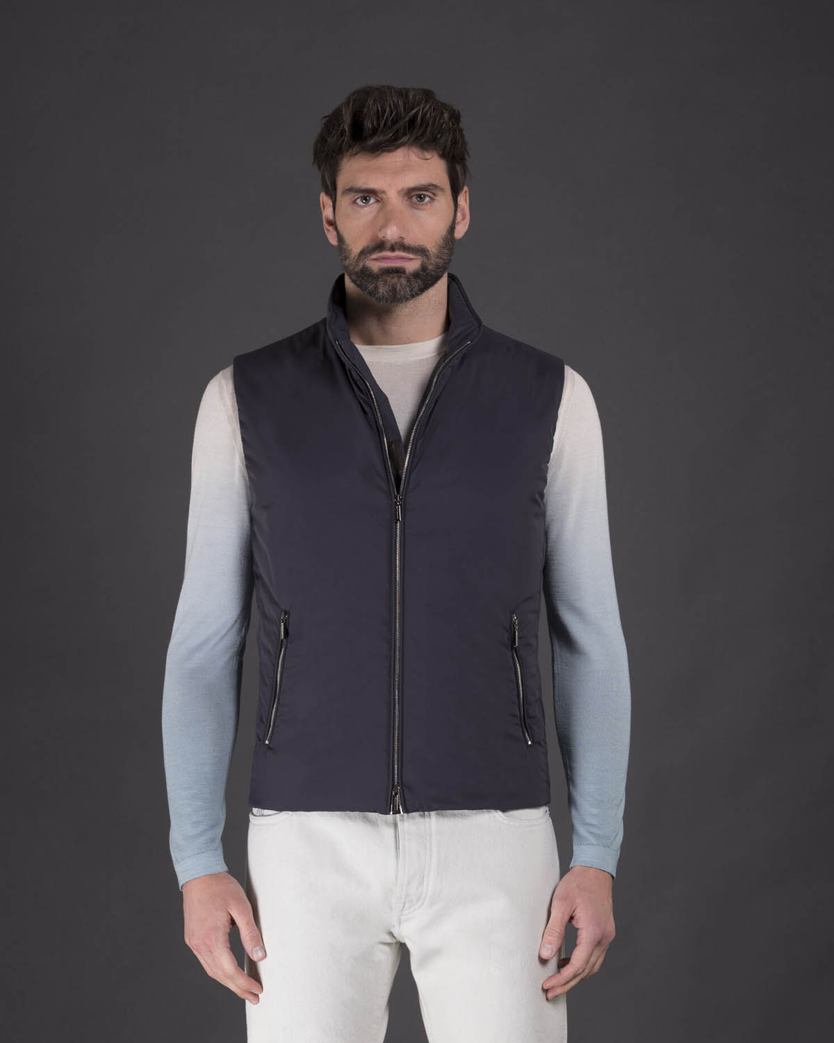 Glatt vest fra Moorer. Aqua Line (2 paraplyer) laget i superlett matt harpiksbelagt vannavstøtende stoff. Foret med syntetisk fjær-effekt polstring.