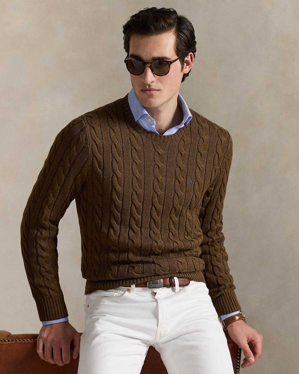 Denne bomullsgenseren kombinerer to av Polos mest ikoniske designelementer: et teksturert kabelstrikket motiv og den signaturbroderte Pony-logoen.