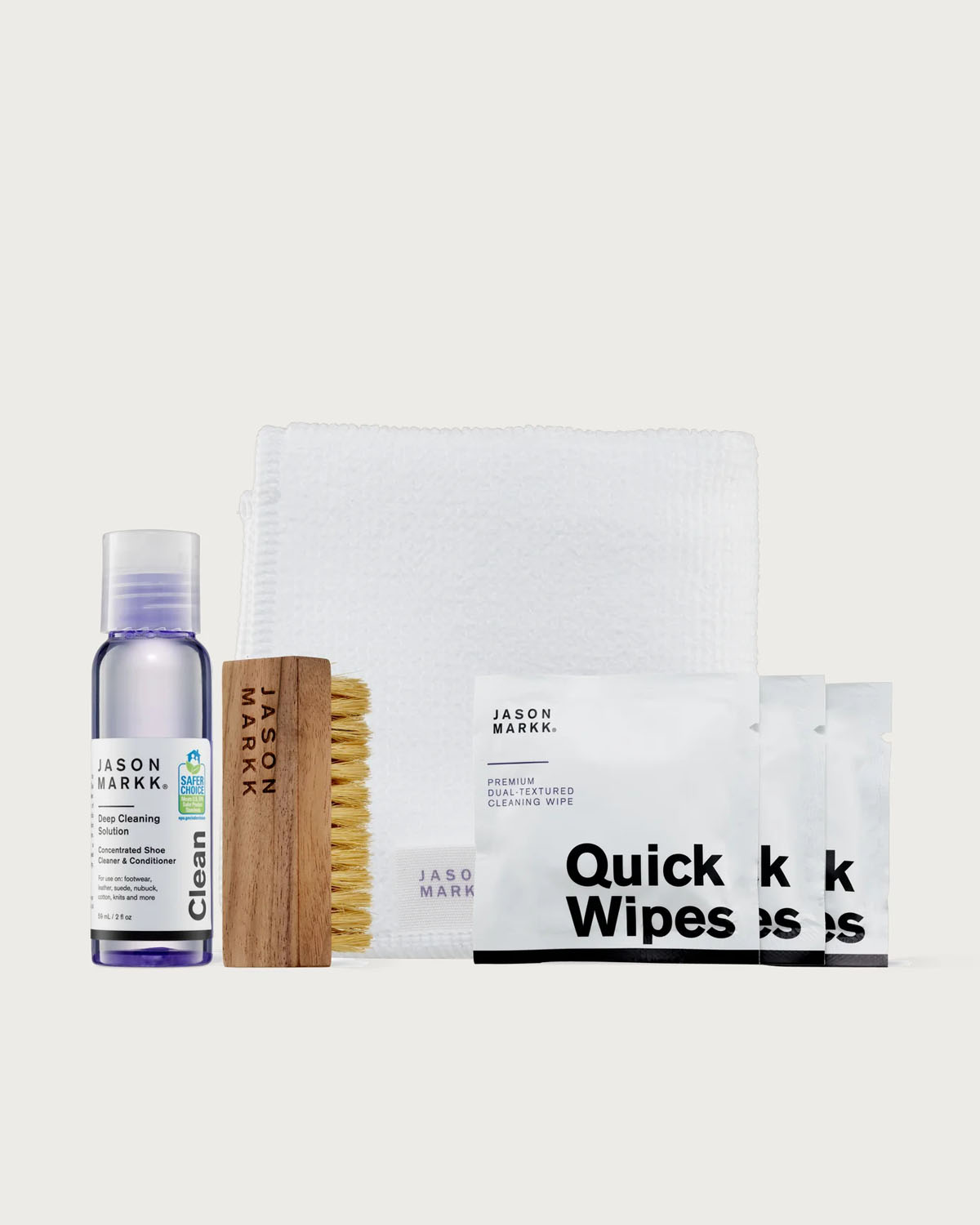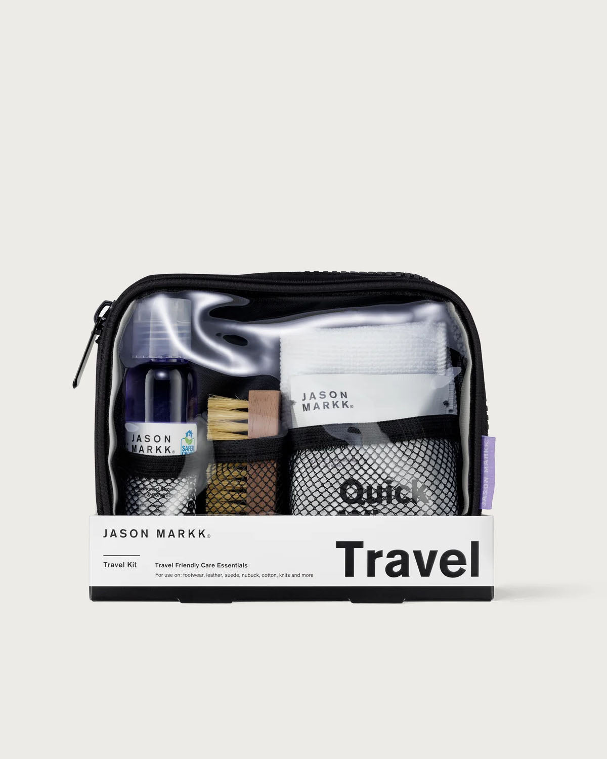 Uansett hvor reisene dine tar deg, hold deg ren med Jason Markk reisesett! Settet inneholder reisestørrelsesversjoner av våre essensielle rengjøringsprodukter, inkludert en dyprengjøringsløsning på 60 ml, en mini-rengjøringsbørste for finvask, et 23 x 23 cm premium mikrofiberhåndkle og tre hurtigkluter. Det slitesterke etuiet i ripstop-nylon har elastiske nettinglommer som holder produktene sikre og organiserte. I tillegg gjør det klare frontvinduet det enkelt å gå gjennom sikkerhetskøene på flyplassen.