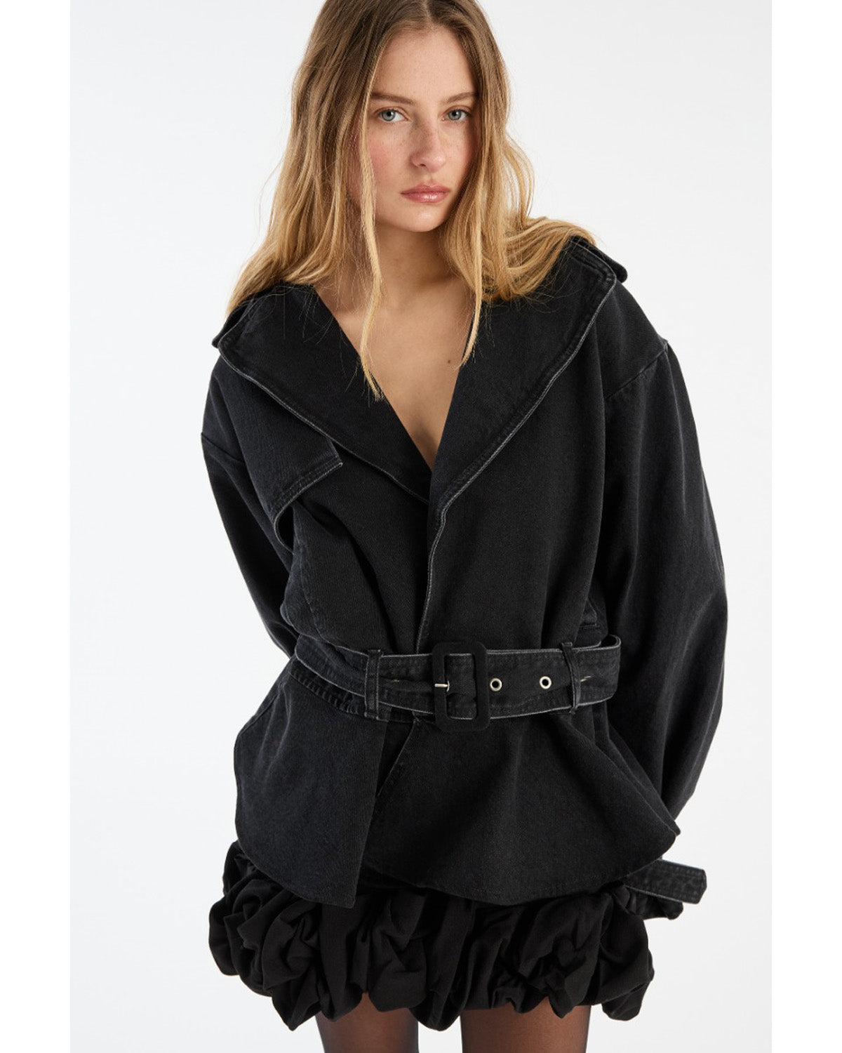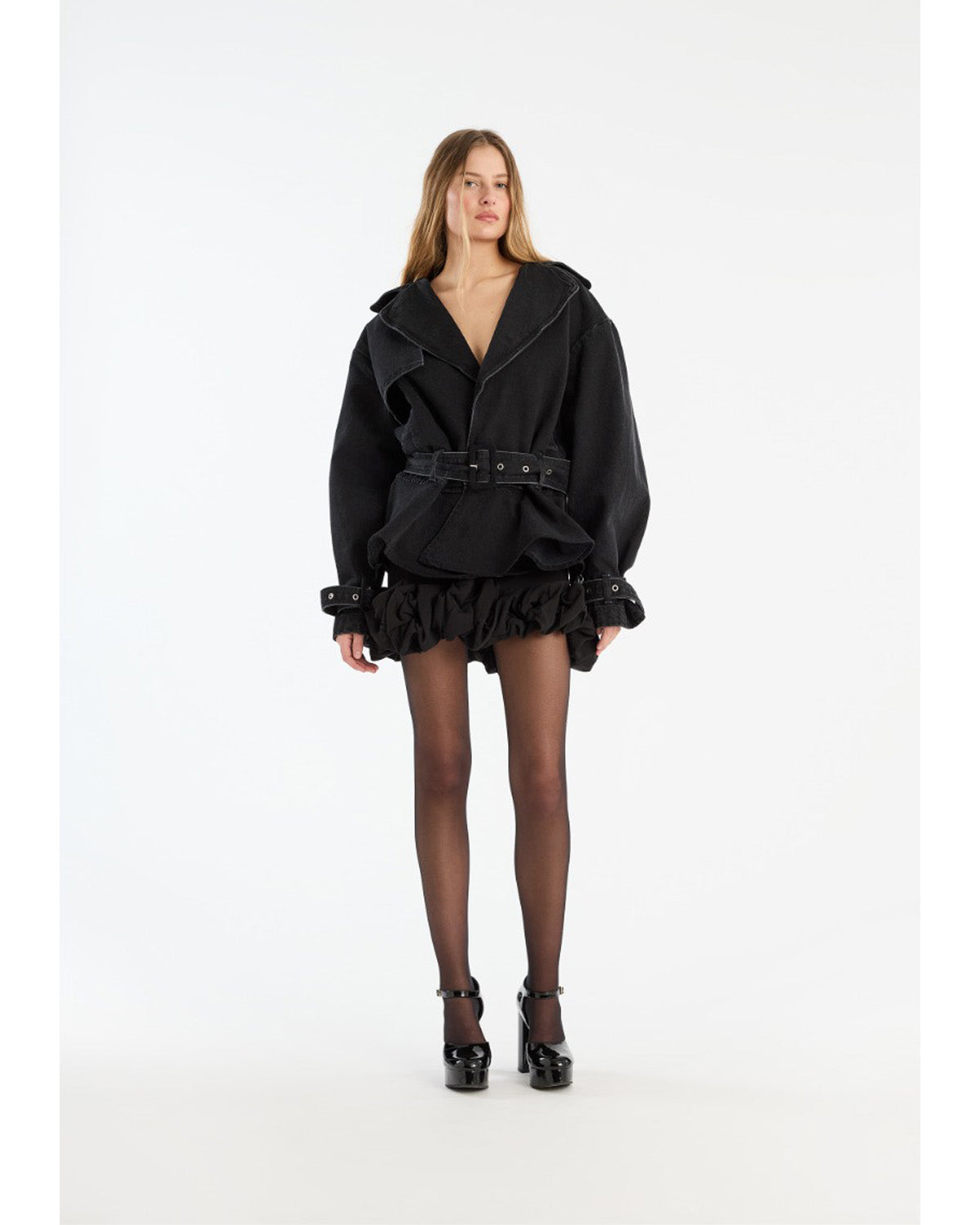 Crepe Mini Skjørt i svart har en tettsittende silhuett med et voluminøst, rynket panel nederst. Glidelåslukking på siden.