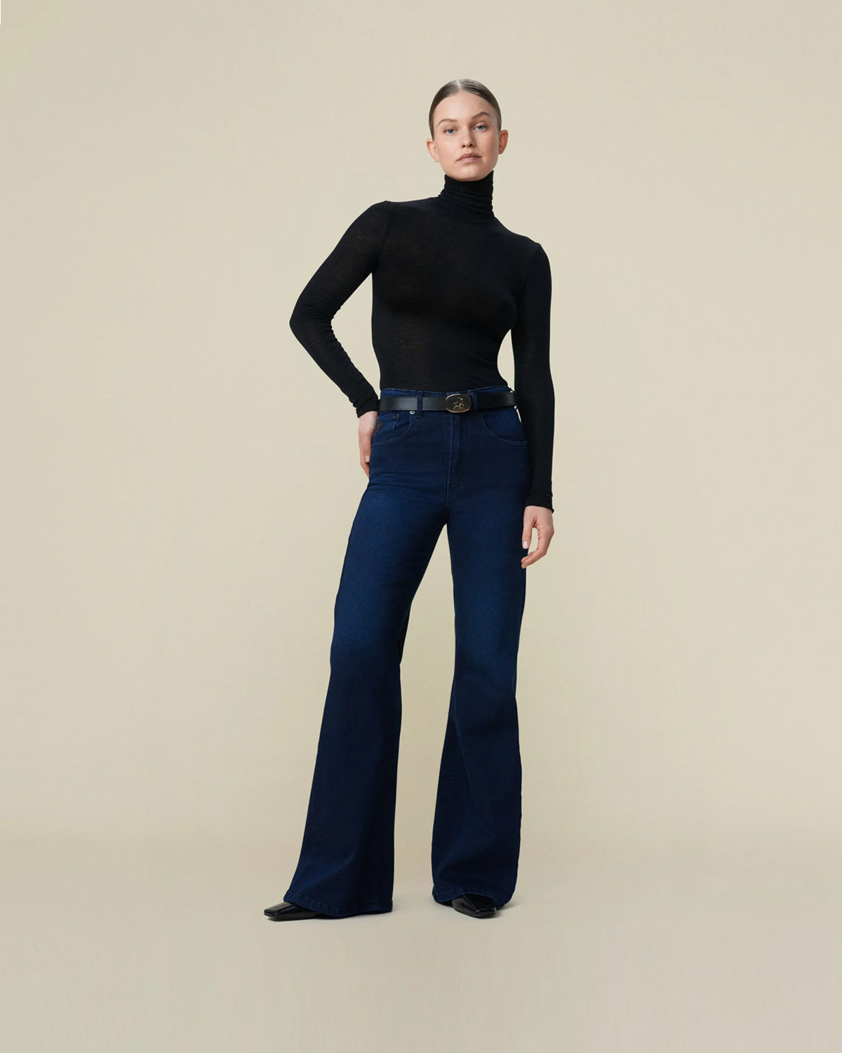 Modellen er 178 cm høy og har på seg størrelse 27