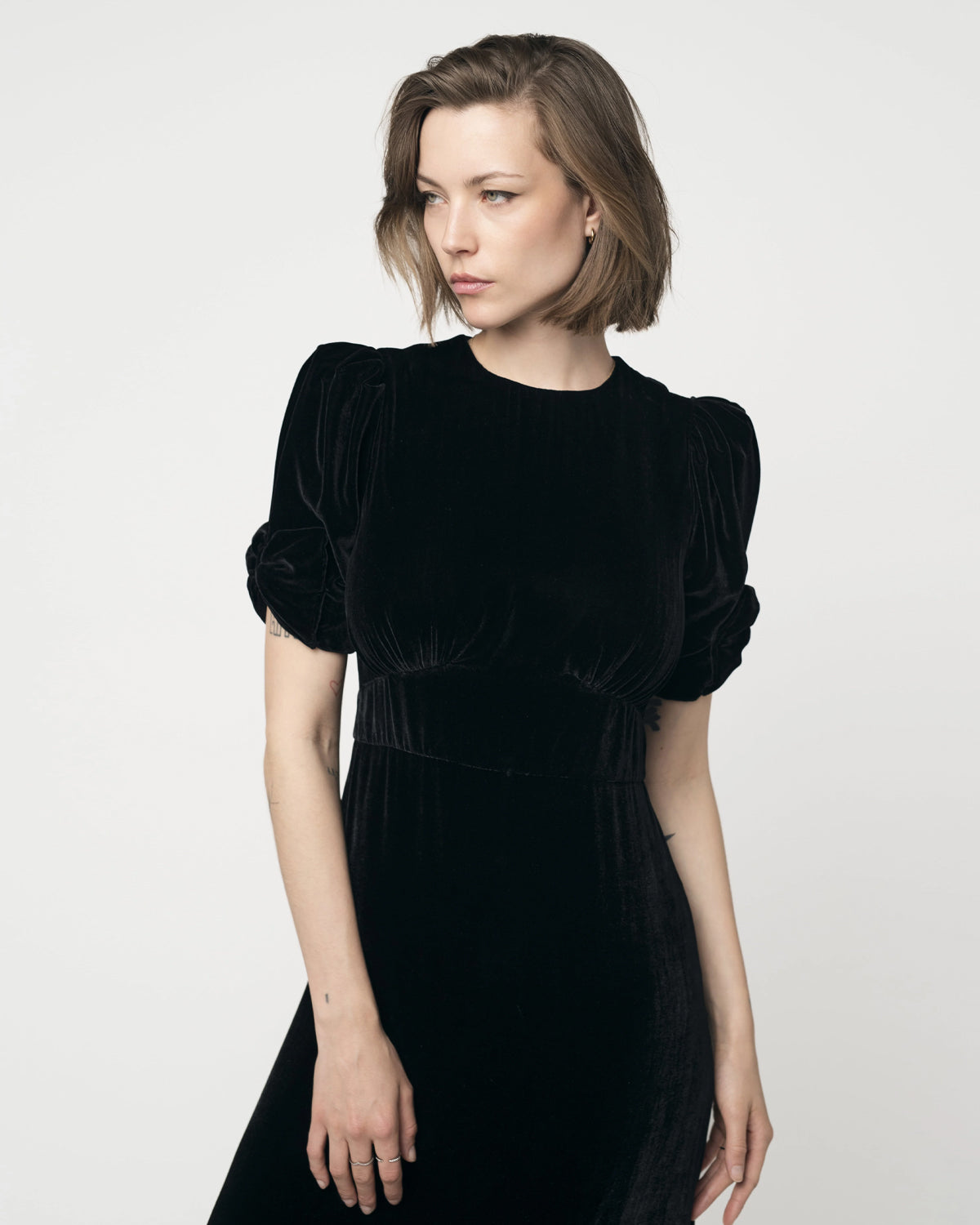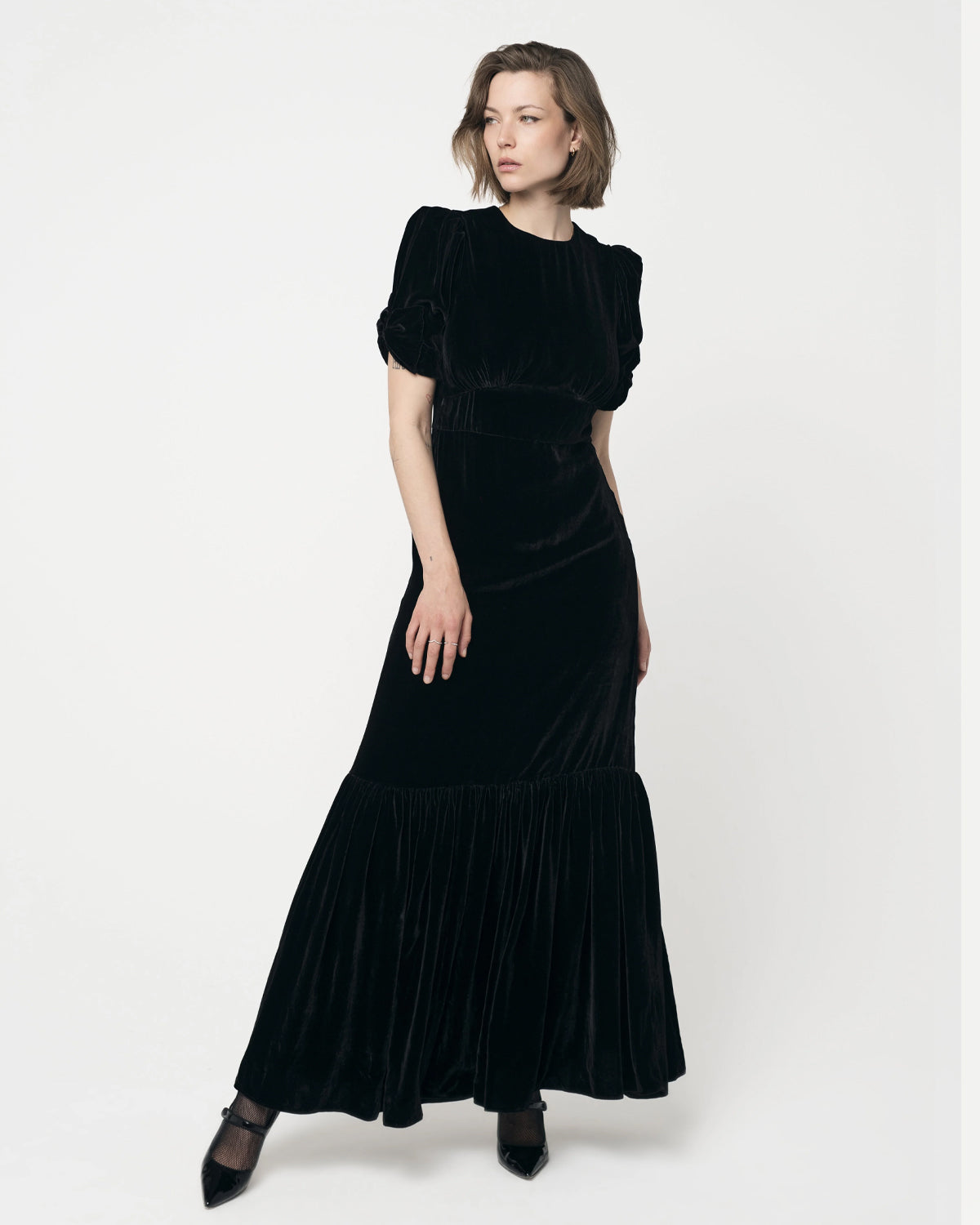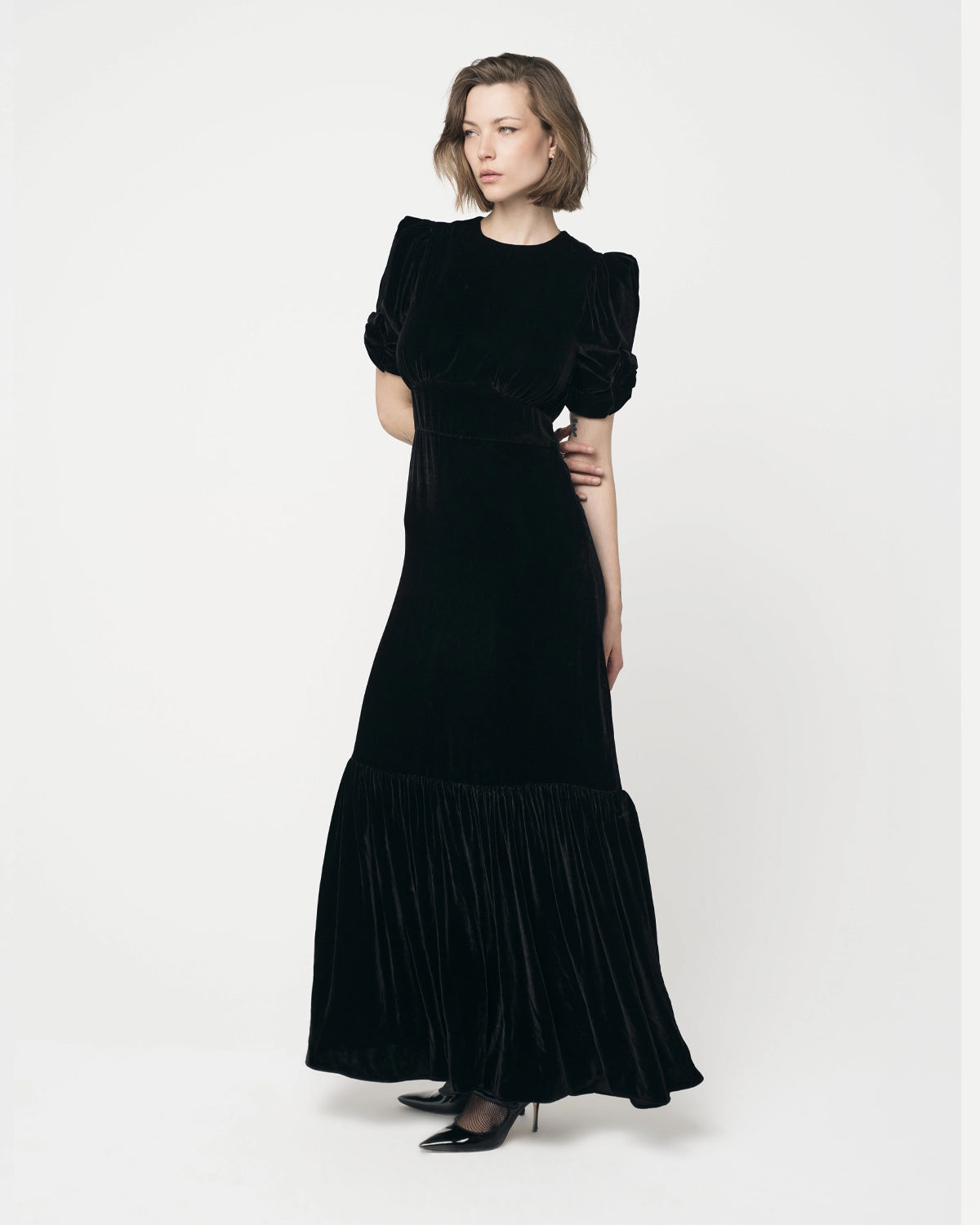 Chloe Velvet-kjolen er en umiddelbar klassiker. En midi-lang silhuett laget av luksuriøs silke-viskosefløyel, designet for å balansere tidløs eleganse med moderne detaljer. Kjolen har korte ermer med delikate sløyfedetaljer, flatterende folder under bysten, i midjen og rundt hoftene, og et dramatisk rysjeskjørt som flyter med hvert skritt. Chloe er fløyelskjolen som beveger seg sømløst fra cocktailtimen til store anledninger. Raffinert, feminin og uforglemmelig.