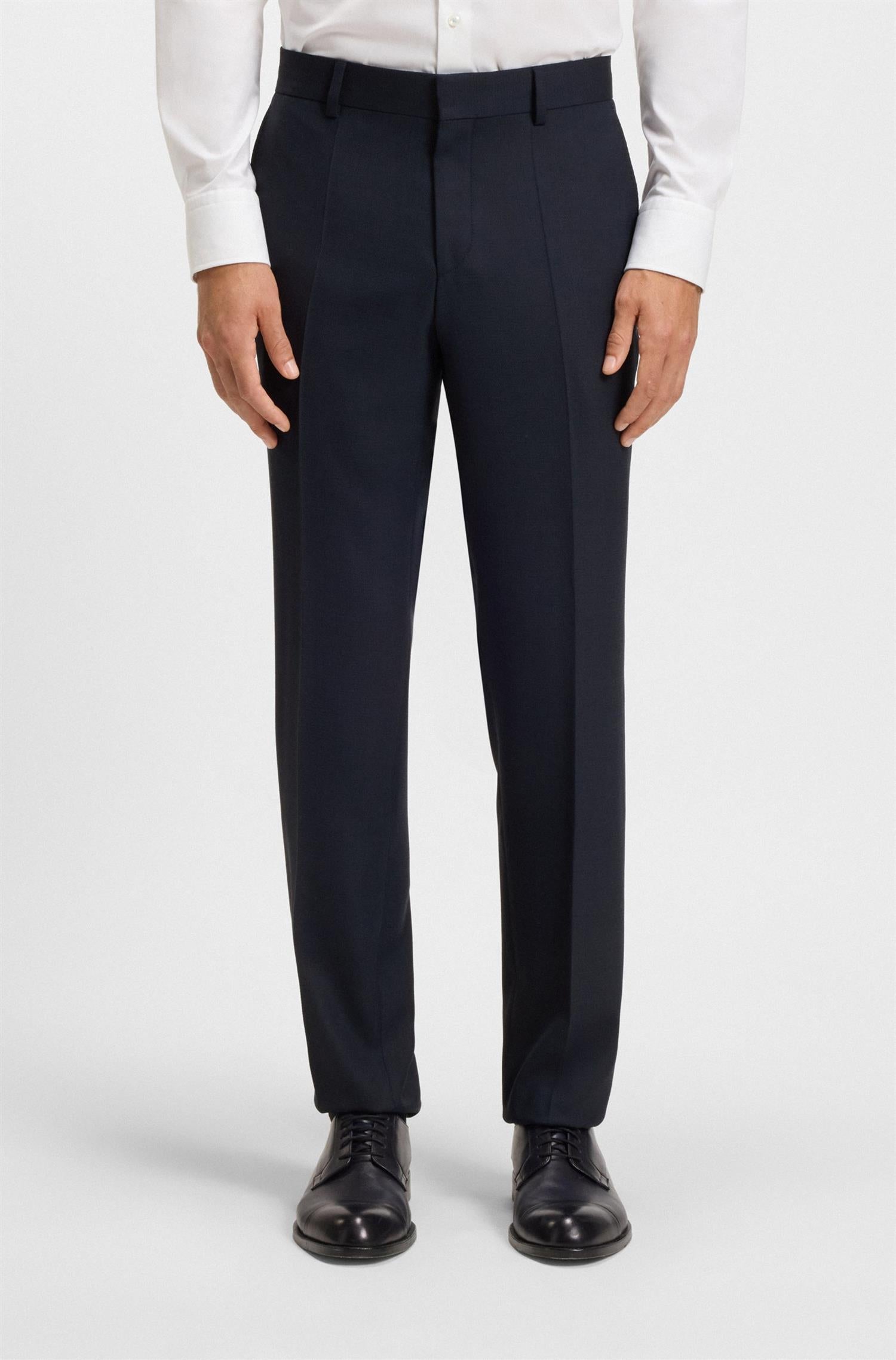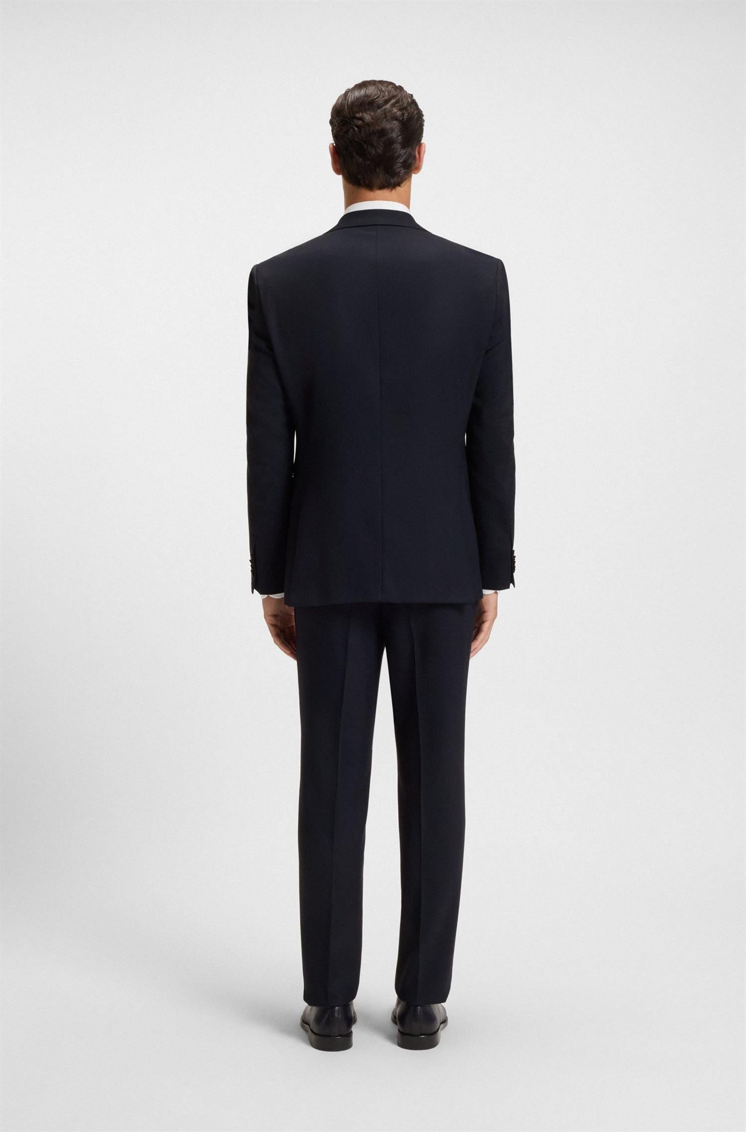 Lekker klassisk boss dress i mørkeblå med stretch for komfort, et godt formelt valg. Skreddersydd for en klassisk normal passform med konstruerte skuldre, er denne todelte dressen blandet med virgin ull og har krøllgjenoppretting for et polert utseende. En mikro-mønstret vev.