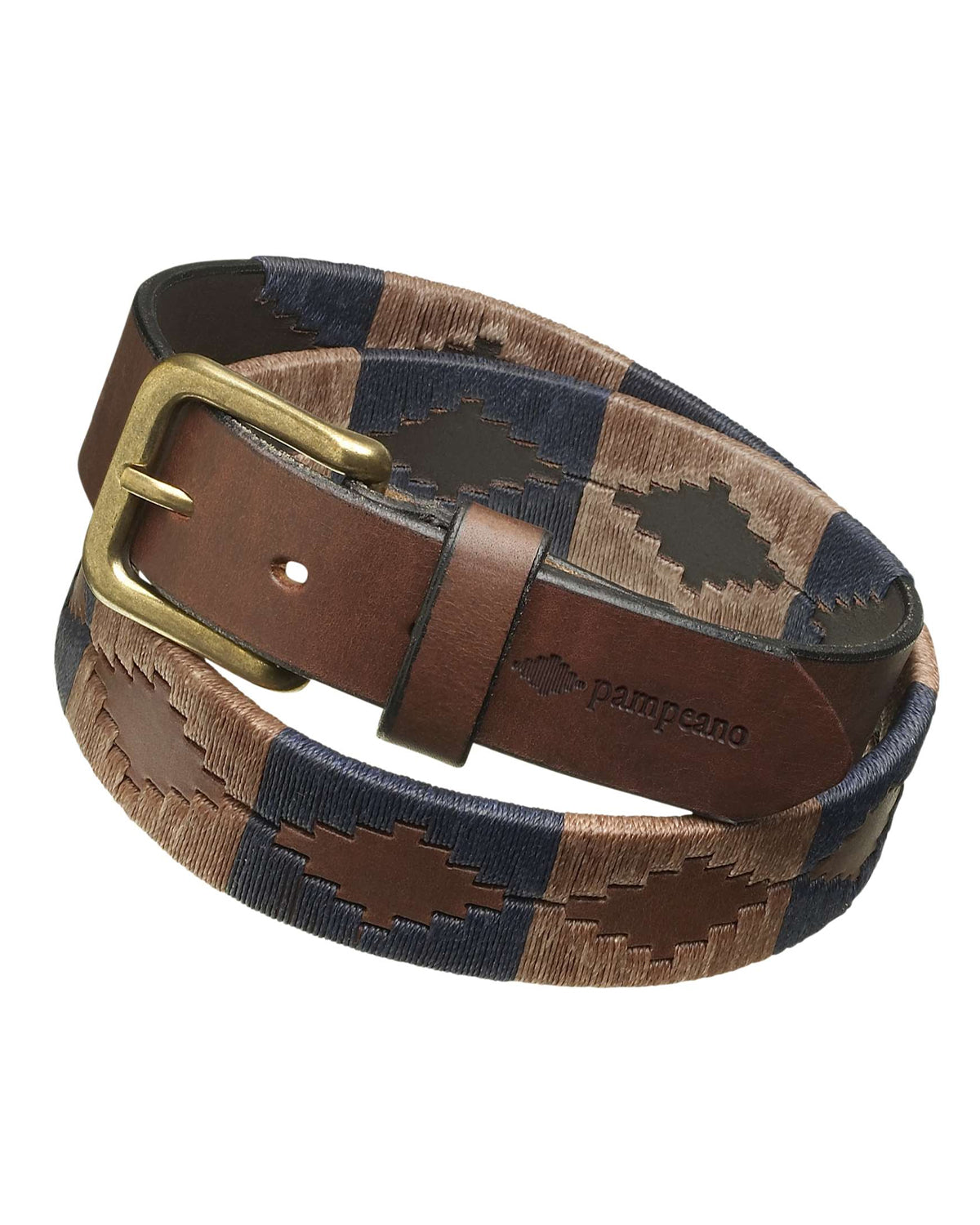 Et diskré brunt skinnbelte for menn med en diskré blanding av marineblå og brun veving. De gjentakende pampamønstrene bærer en tradisjonsrik stil som passer til avslappet eleganse.