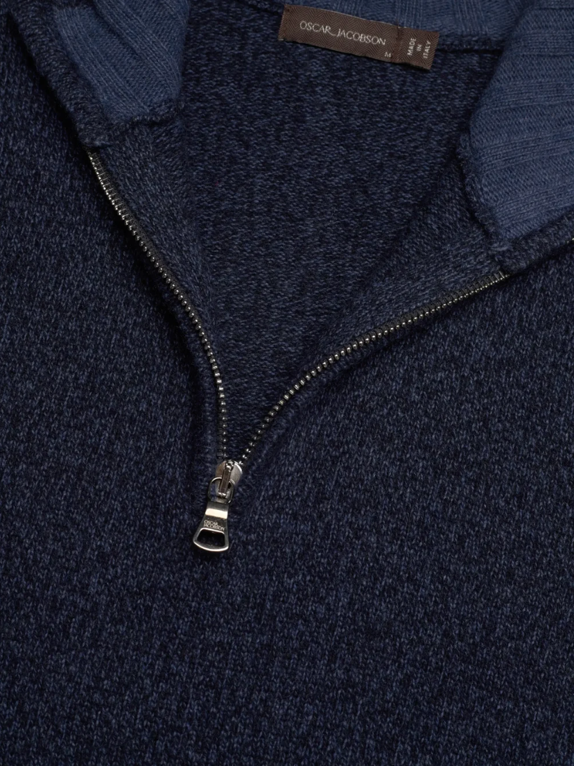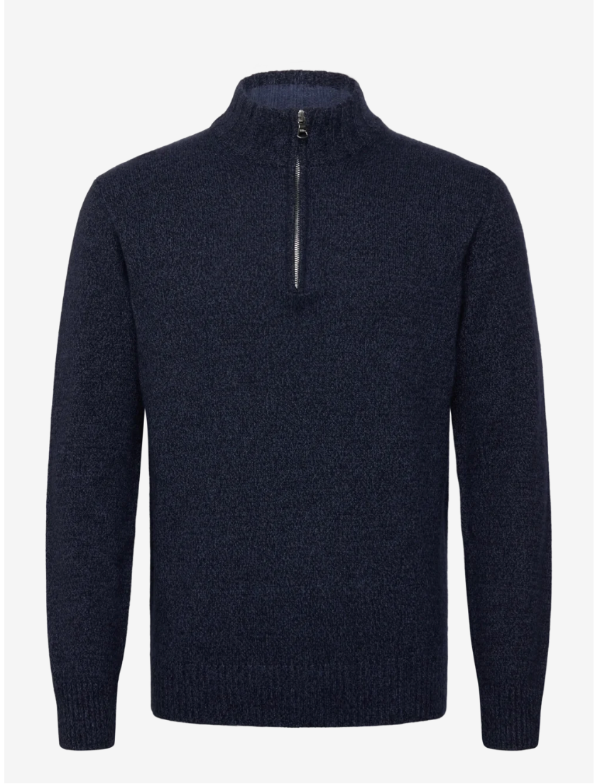 Half zip-genser i fint melert garn, hvor to forskjellige fargede tråder er tvunnet for å skape denne effekten. Innsiden av kragen har ensfarget garn som gir en fin kontrast. Myk og behagelig kvalitet i en blanding av ull, kasjmir og viskose. Strikket i 7gg med 2-lags for en ekstra varmende følelse på kalde dager.