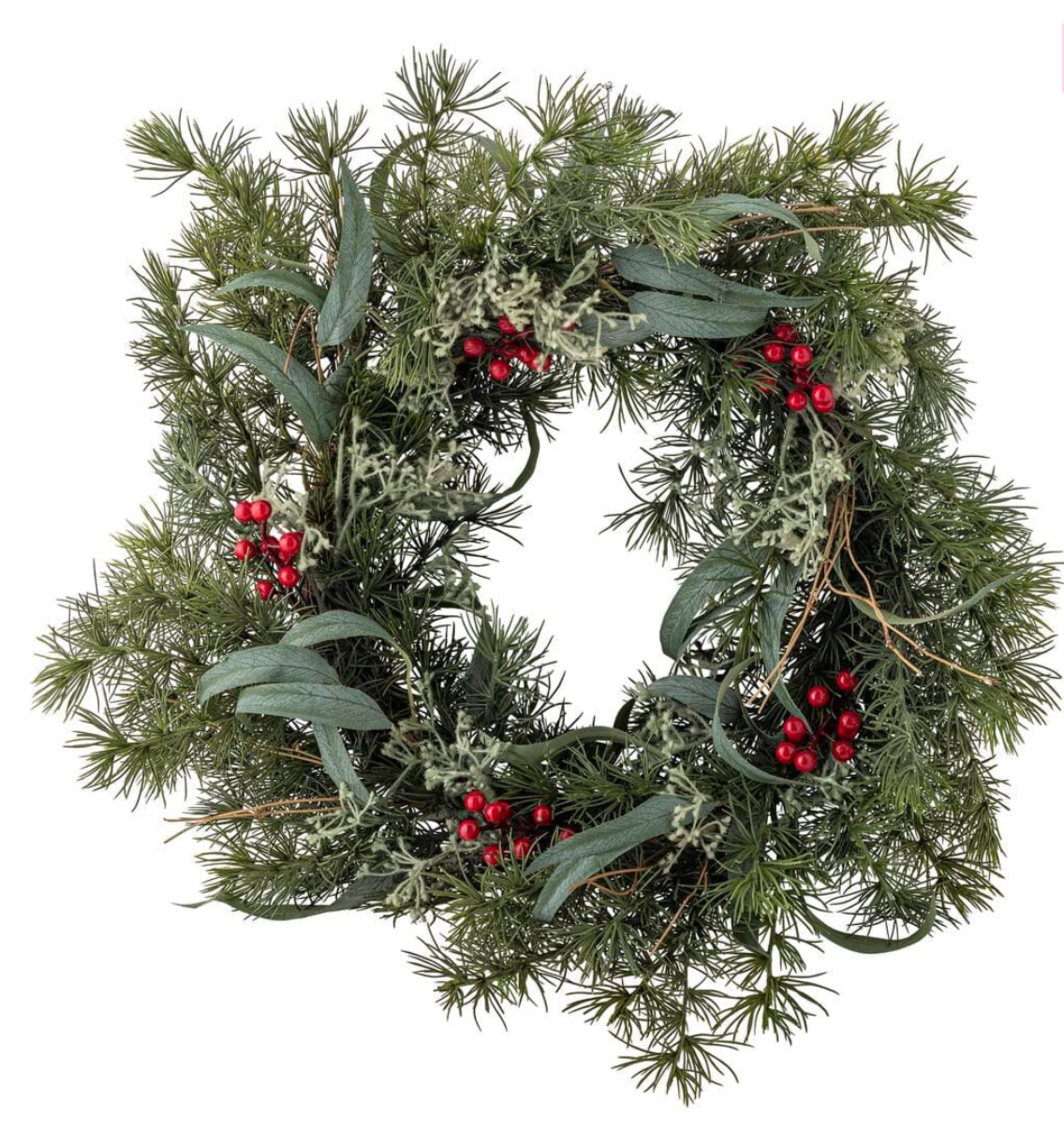 Pine Kransen fra Bloomingville er sammensatt av kunstige grangrener og dekorative røde bær, som umiddelbart tilfører julestemning til ethvert rom. Den er ideell til å henge på inngangsdøren eller som en stilfull veggdekorasjon, og skaper en festlig atmosfære uten behov for vedlikehold.