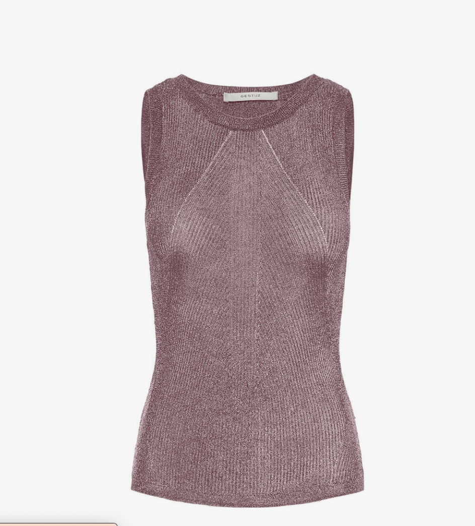 Gzsilvi Tank Top fra Gestuz. En feminin og tidløs topp i strikket kvalitet med en lekker metallisk finish. Gzsilvi Tank Top har rund hals og er ermeløs med en kroppsnær passform som gir et stilrent uttrykk. Den glitrende rosétonen gjør den perfekt til både fest og hverdags, stylet alene eller under en blazer.