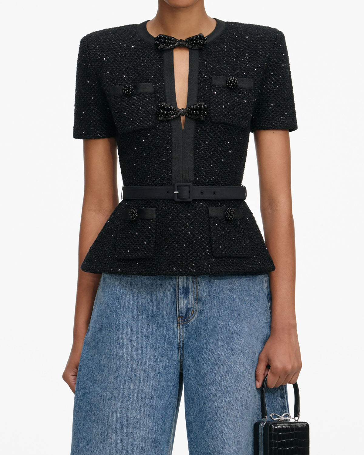 Denne svarte paljettstrikketoppen er et uanstrengt tillegg til ethvert antrekk, og er innrammet av skulderputer og sløyfeutskjæringer foran. Style med denim til middag eller legg til en myk maxikjole for en kveld ute.