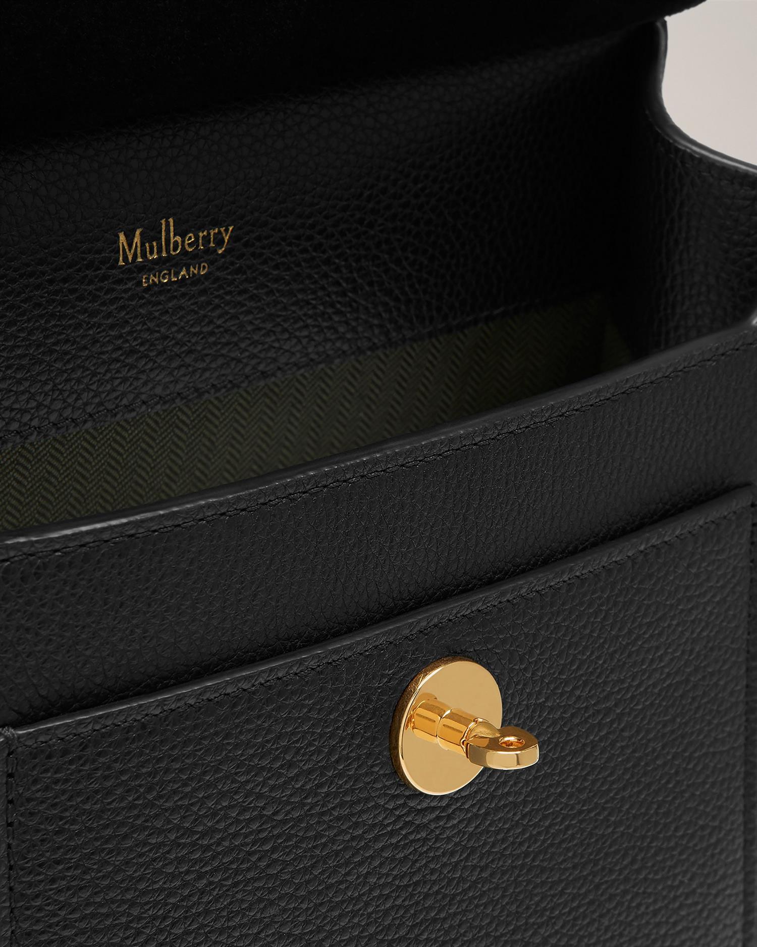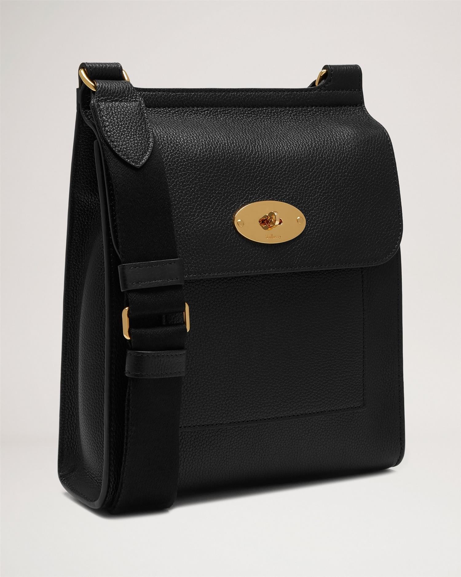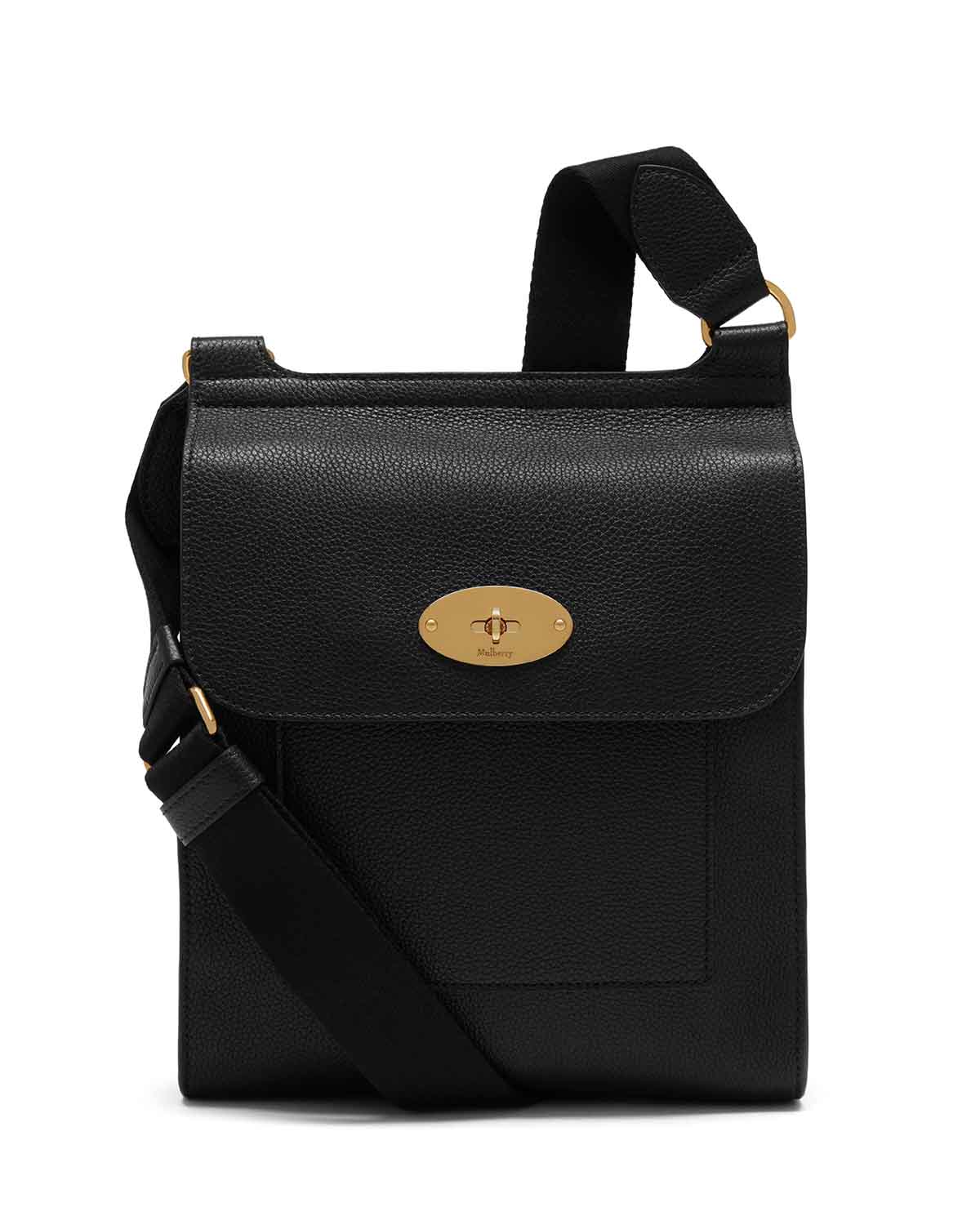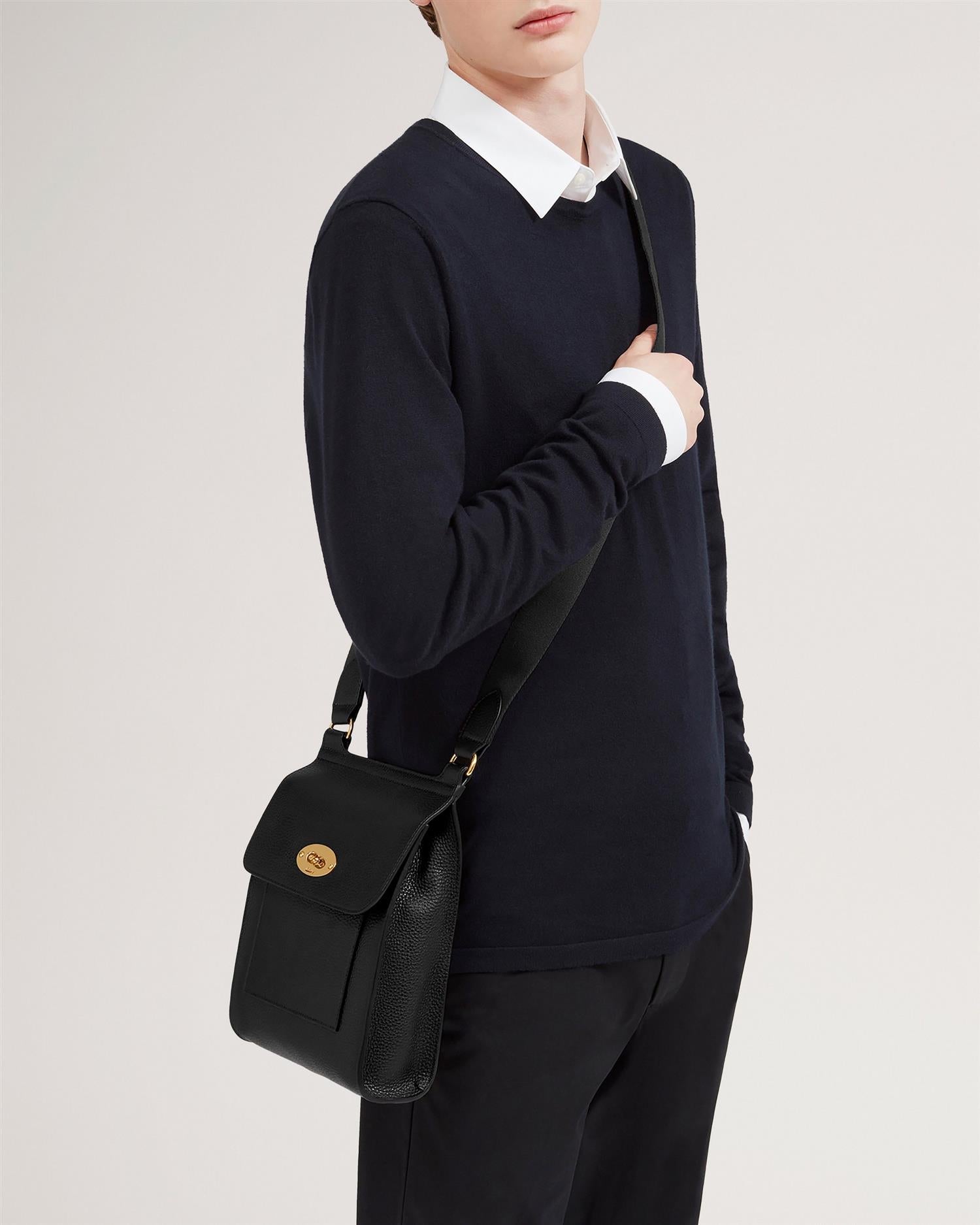 Den tidløse og populære Antony vesken fra Mulberry i sort, er en "hendene fri" veske som bæres perfekt cross body. Den har flapp lukking i front som låses med Mulberry sin ikoniske Postman's Lock i gullfarge. Vesken er i en praktisk mellom-størrelse, og passer perfekt til hverdags bruk.