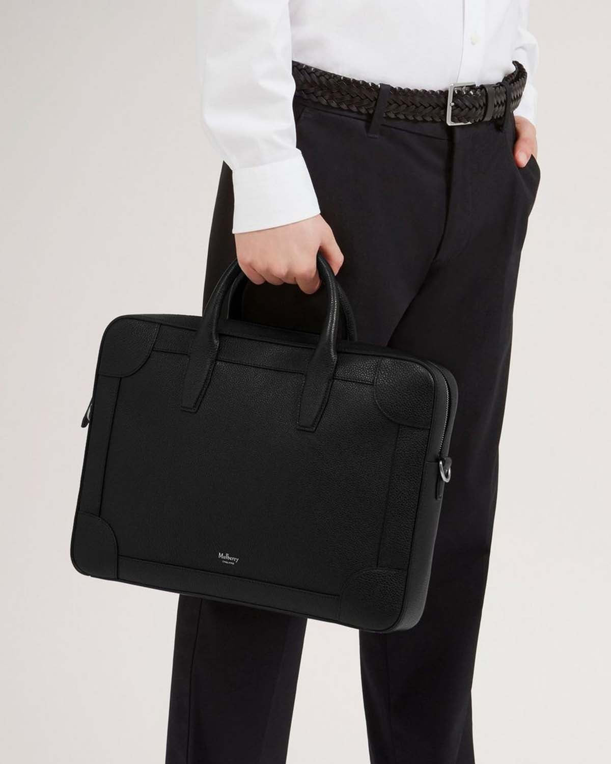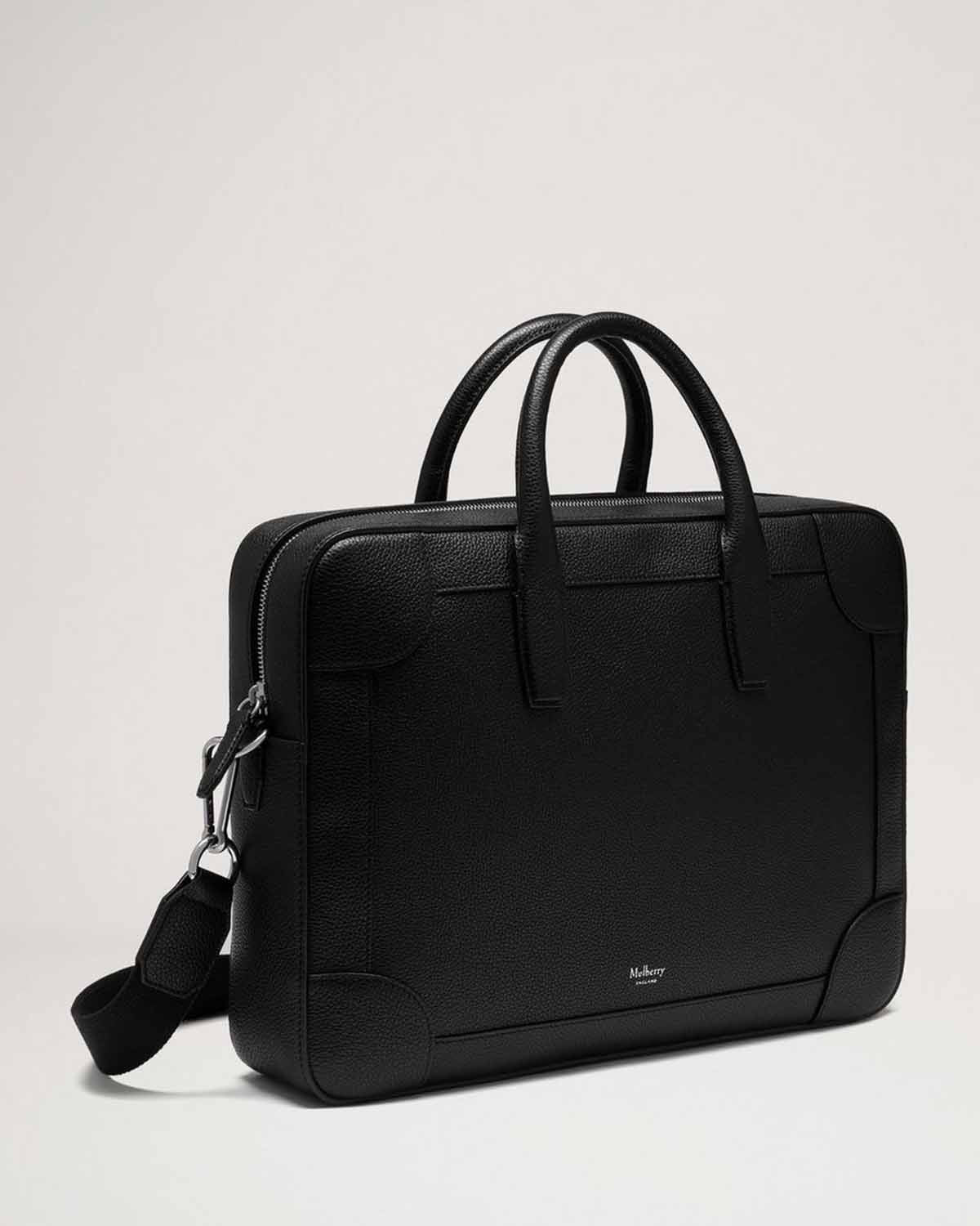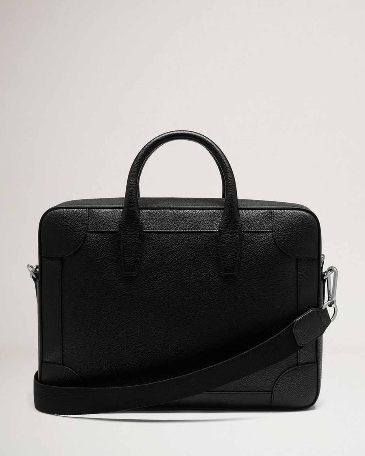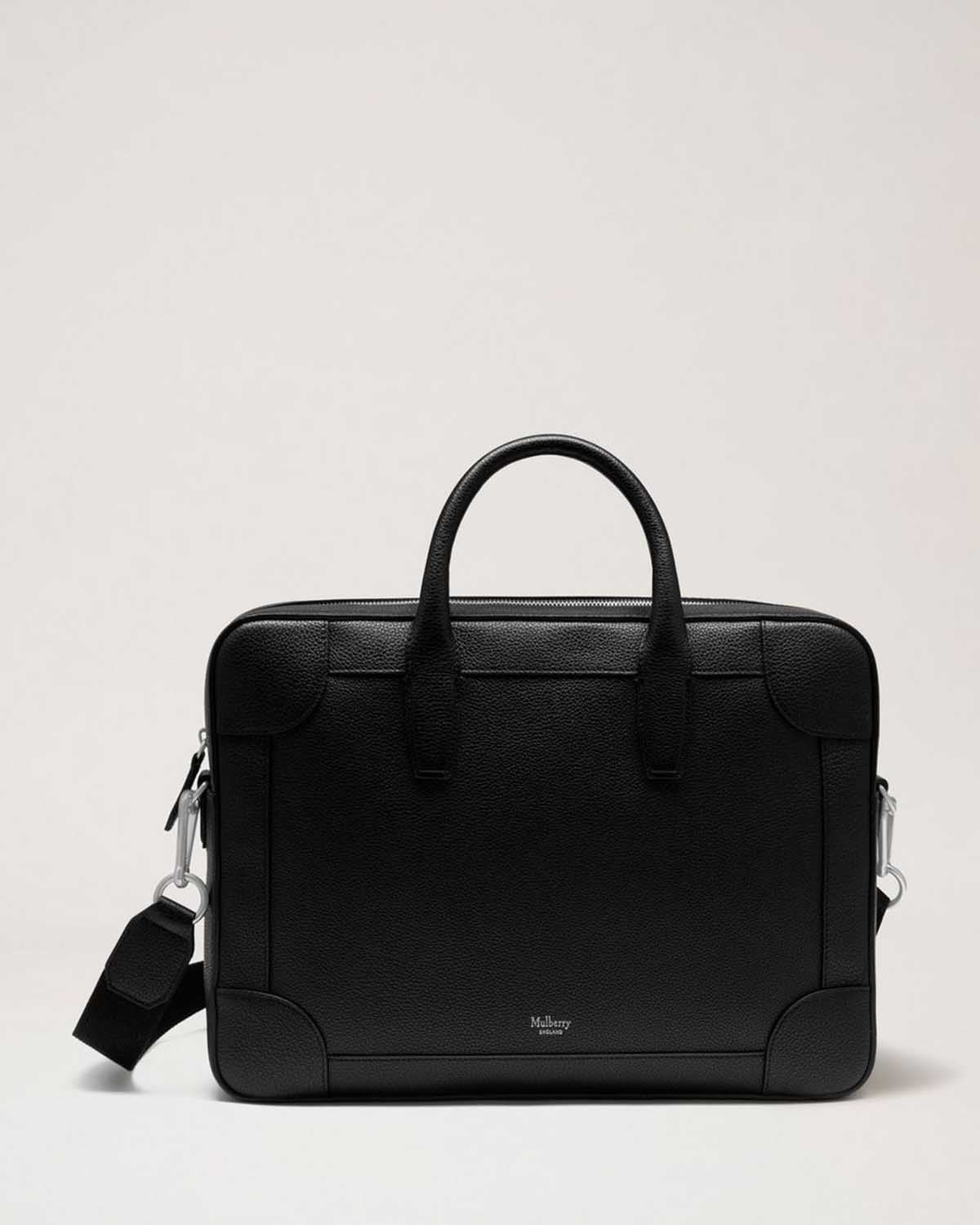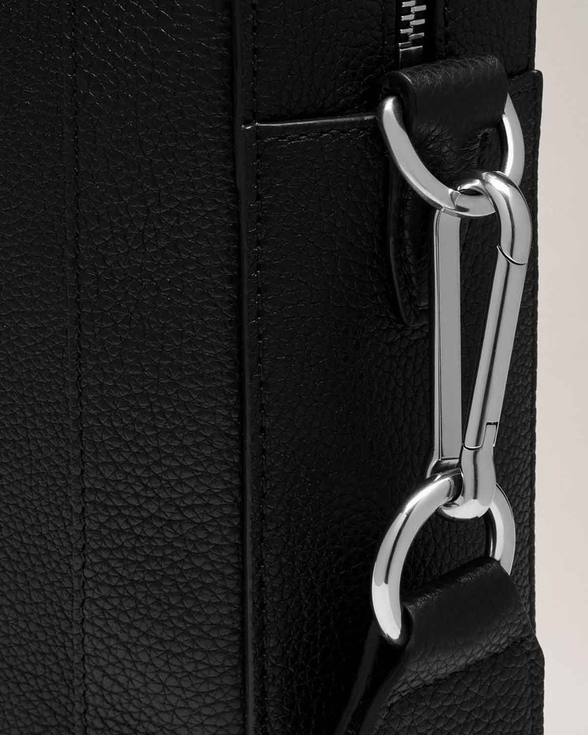 Sort veske i skinn fra Mulberry. Belgrave Single Document Holder Black Small Classic Grain er en unisex PC-veske i stilrent design som fullføres av liten sølvfaget logo foran. Vesken kan bæres både i håndtak og over skulder, og skulderreimen er justerbar og avtagbar. Perfekt til jobb!