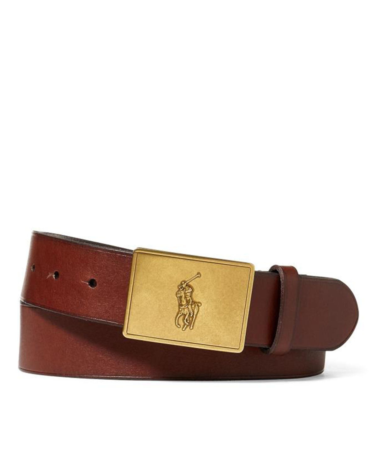 Brunt skinnbelte til herre fra Polo Ralph Lauren. Pony Plaque Leather Belt er et stilrent belte med gullfarget og firkantet spenne som fullføres av den kjente polospilleren.