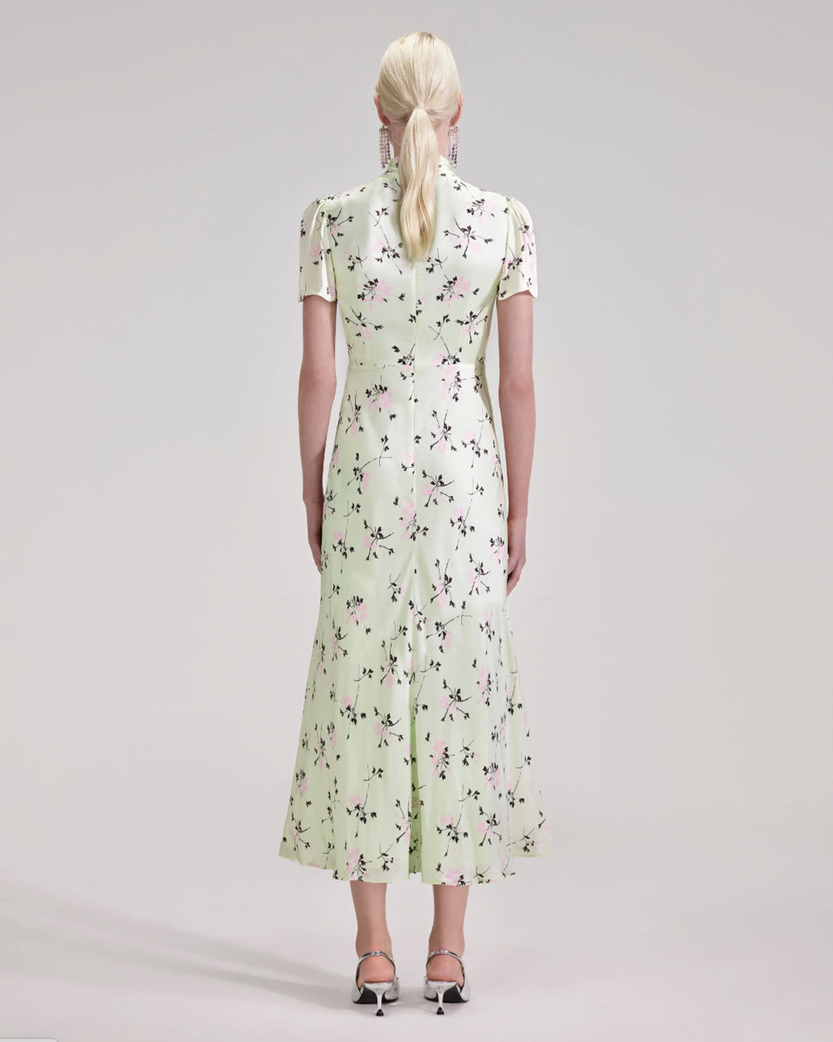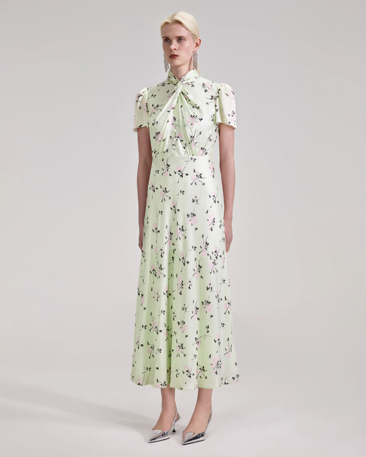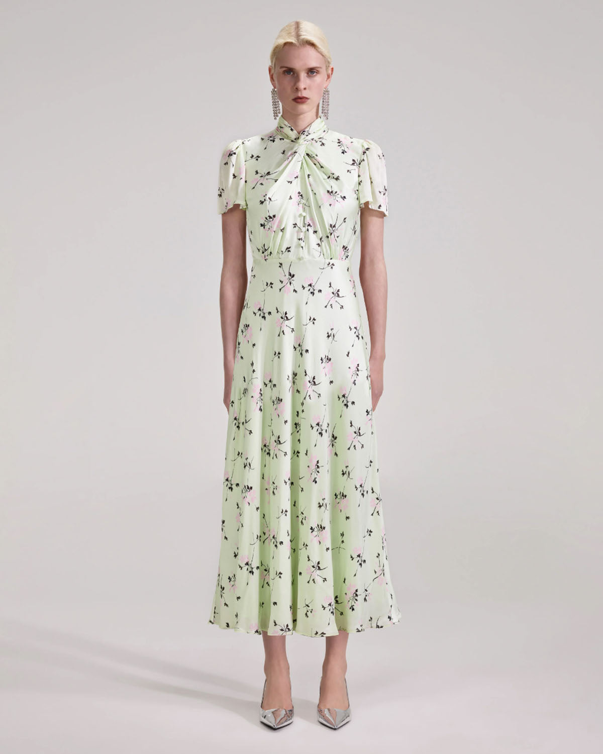 Presentert i en luftig mintgrønn, ble denne blomsterkjolen laget for hagefester og al fresco lunsjer. En vridd utringning med en cross-over grimestil gir formen interesse, mens et flytende midiskjørt vil holde deg kjølig og elegant. Kombiner den med høye hæler for et elegant utseende.