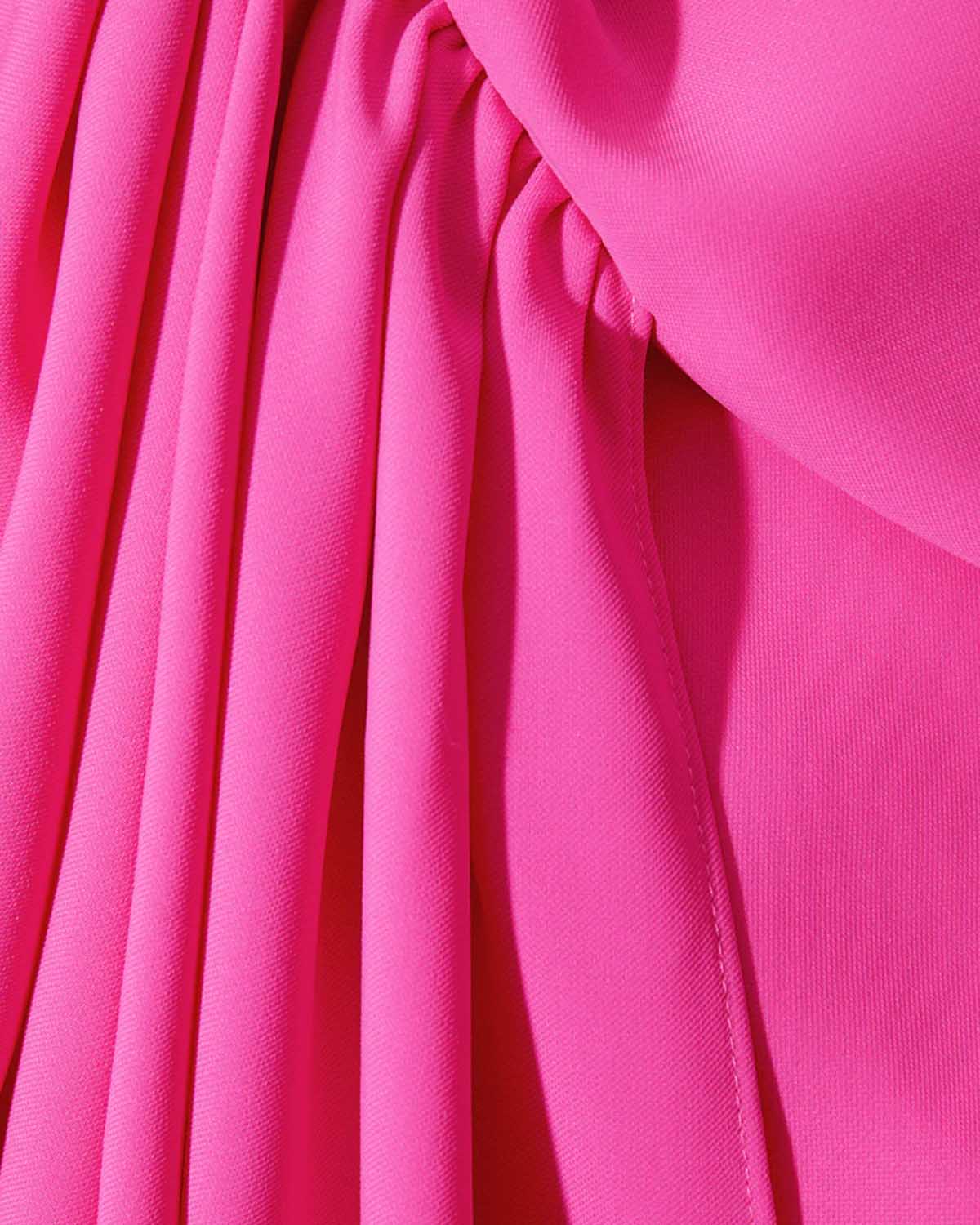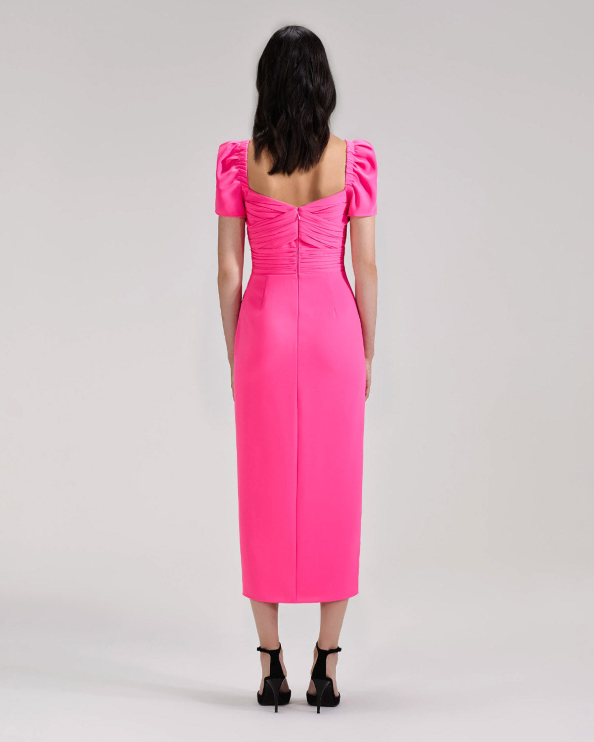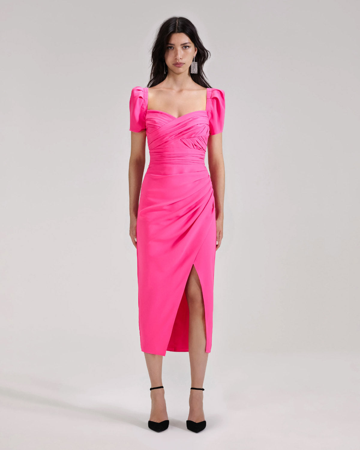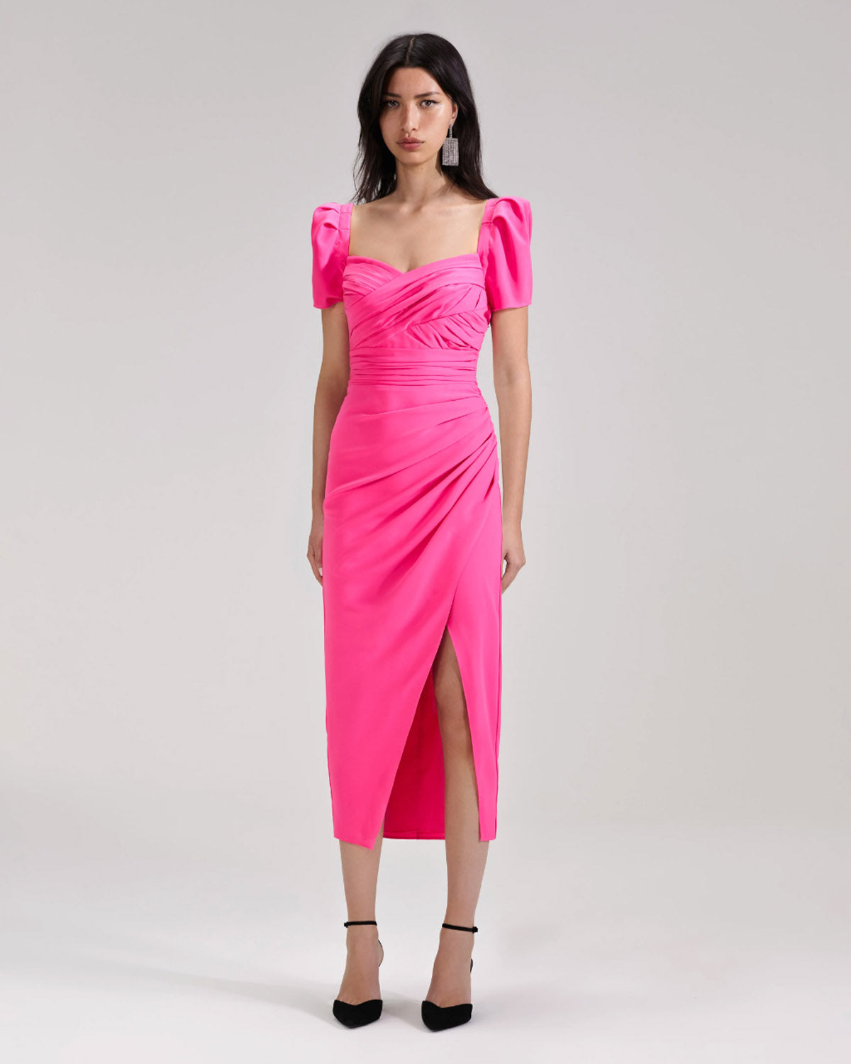 Fremhevet av en hjerteformet utringning og en rynket bodice, vil denne varme rosa midikjolen omfavne deg på alle de riktige stedene. Et boksfolddesign gir ermene en polstret effekt - en sikker måte å skape inntrykk av en slankere midje. Stretch crepe-stoff sikrer komfort ettersom den lune sidesplitten og klassisk drapering former figuren din. Kombiner den med hæler og en matchende veske for en natt ute på byen.