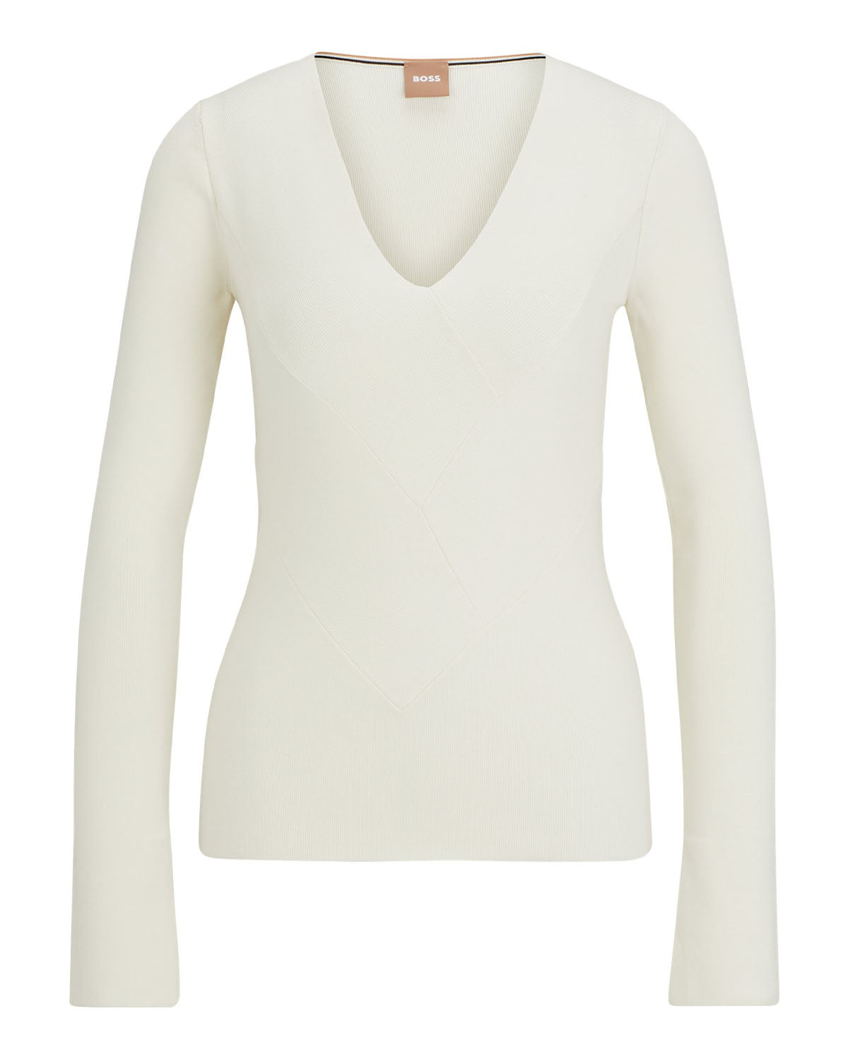 En figursydd genser med V-hals fra BOSS i en ribbestrikket stretchblanding med sømdetaljer og antibakteriell finish.