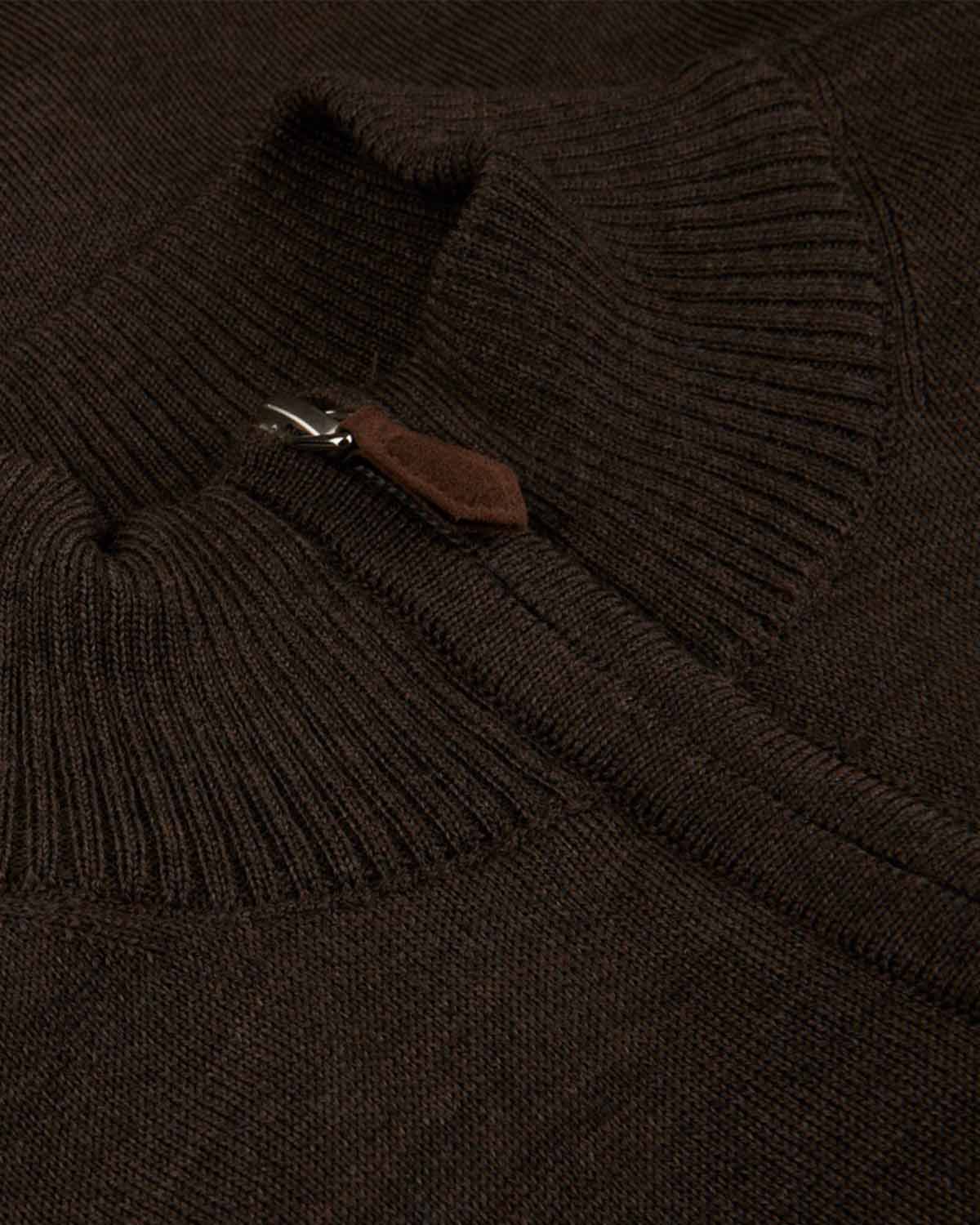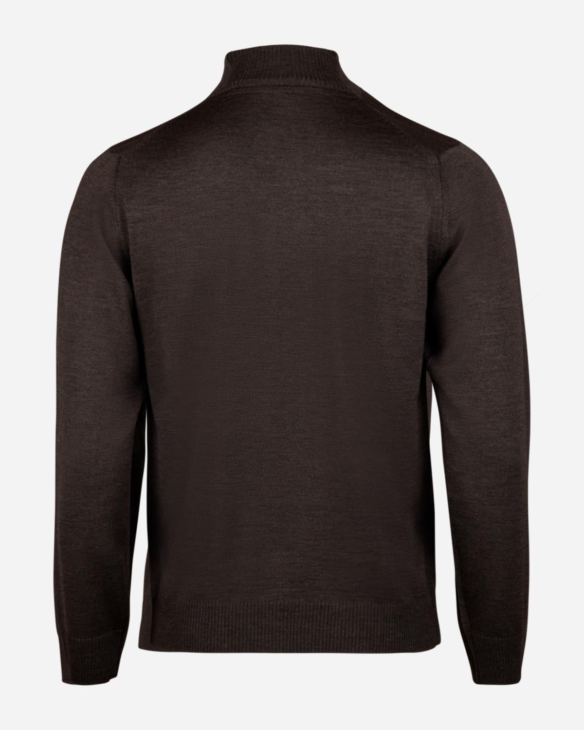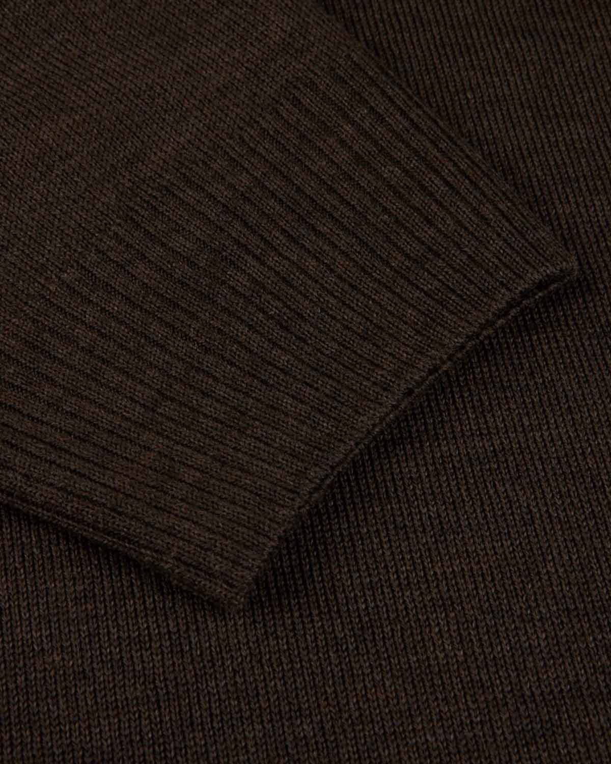 Denne genseren med halv glidelås er laget av merinoull og er detaljert med ribbestrikket krage, mansjetter og fald.