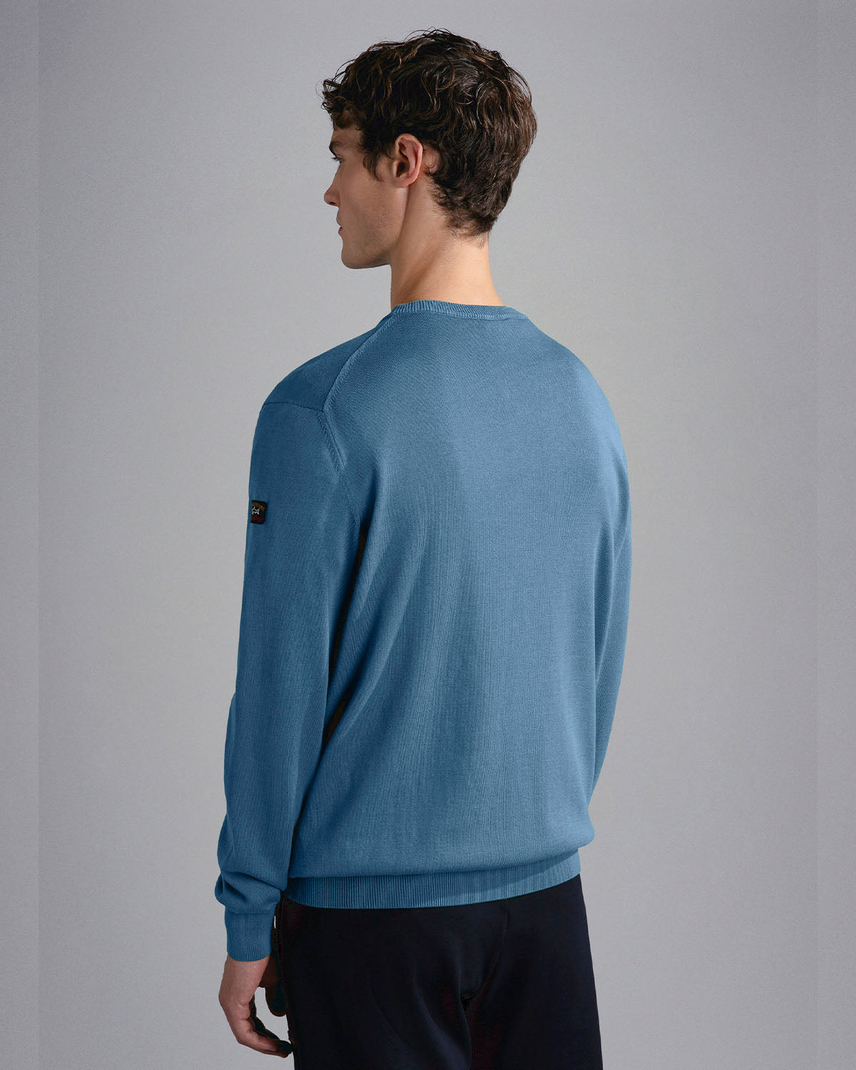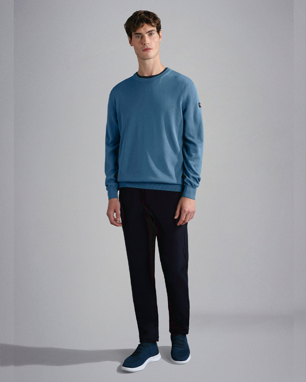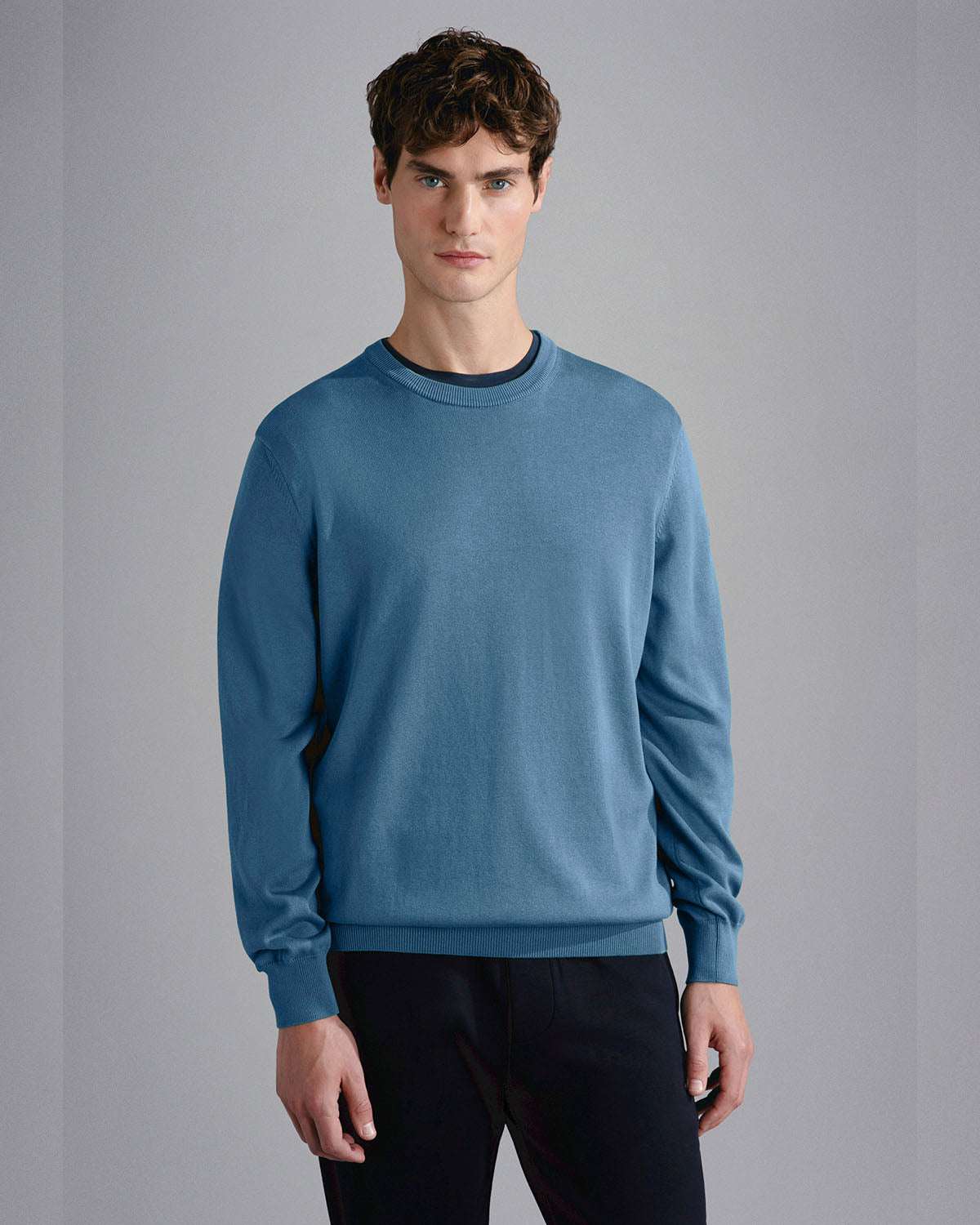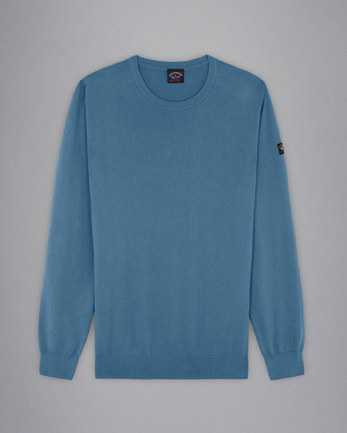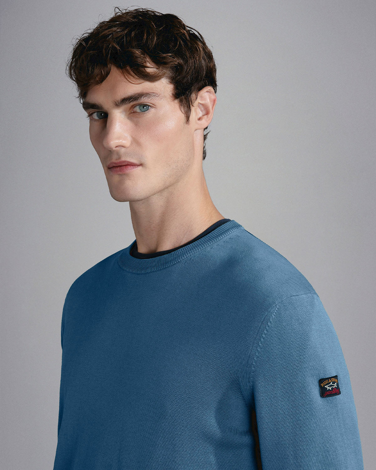 Blå genser fra Paul & Shark. Mens Knitted Roundneck har en normal passform med lange ermer og ribbestrikket krage og mansjetter. Denne genseren er perfekt med chinos eller bermudashorts.